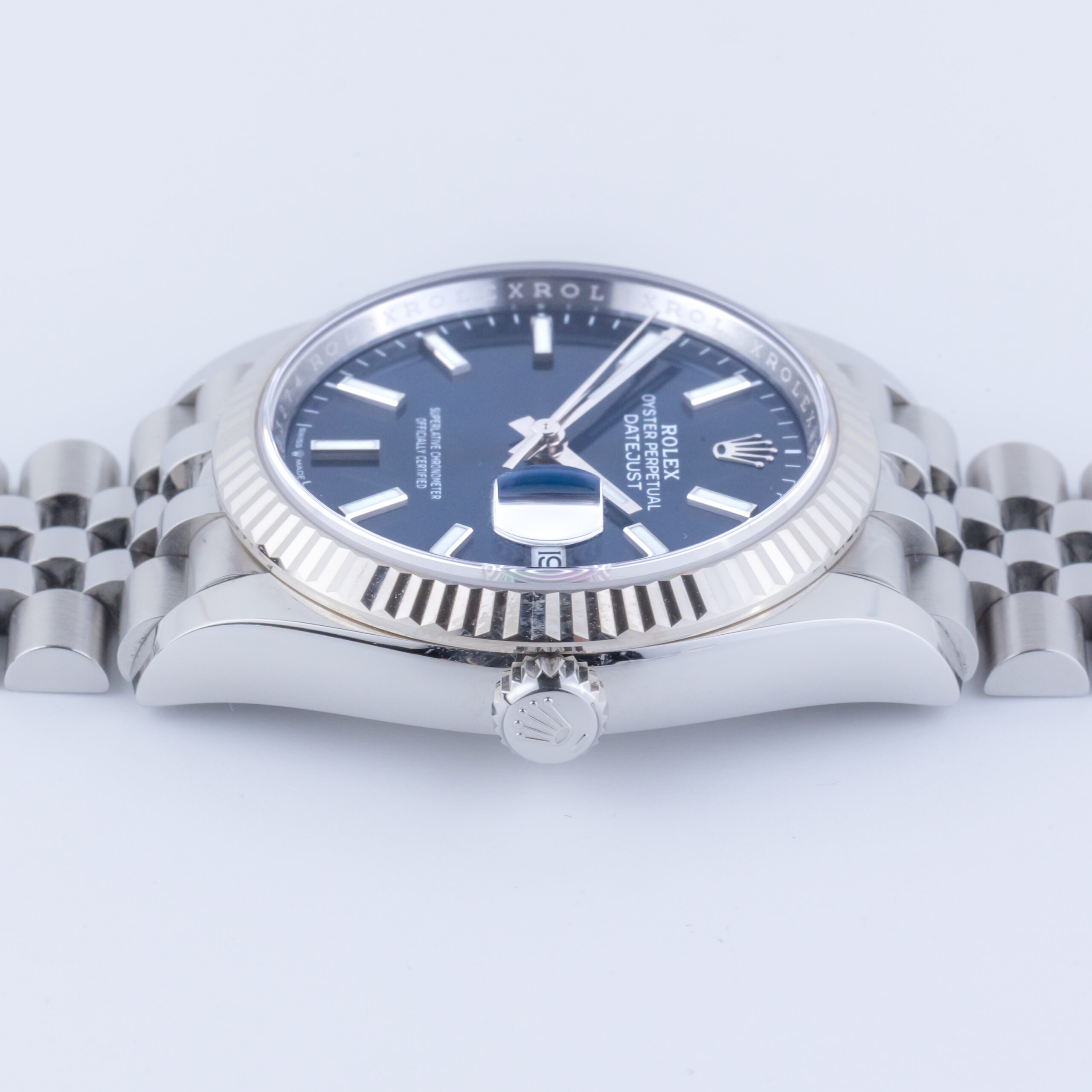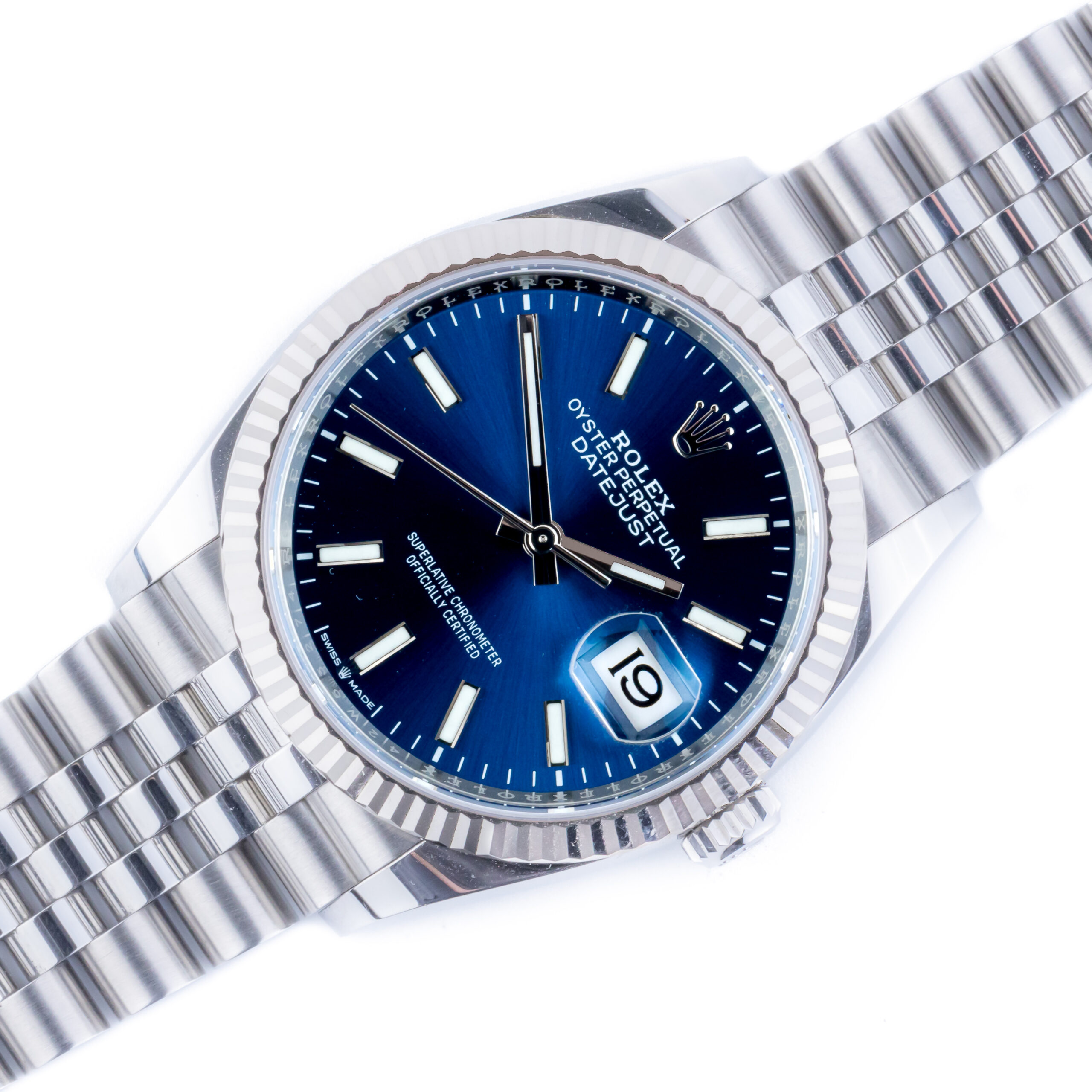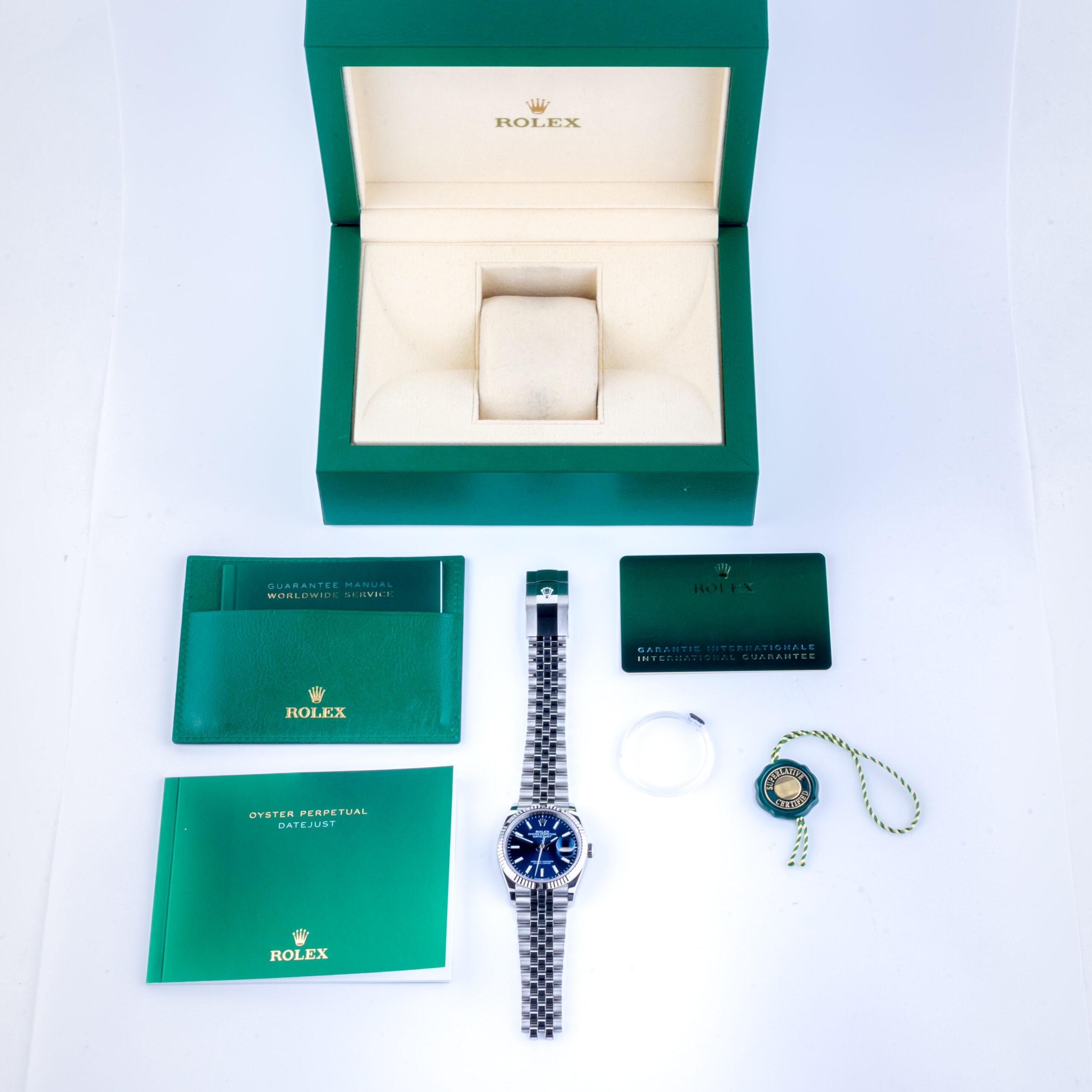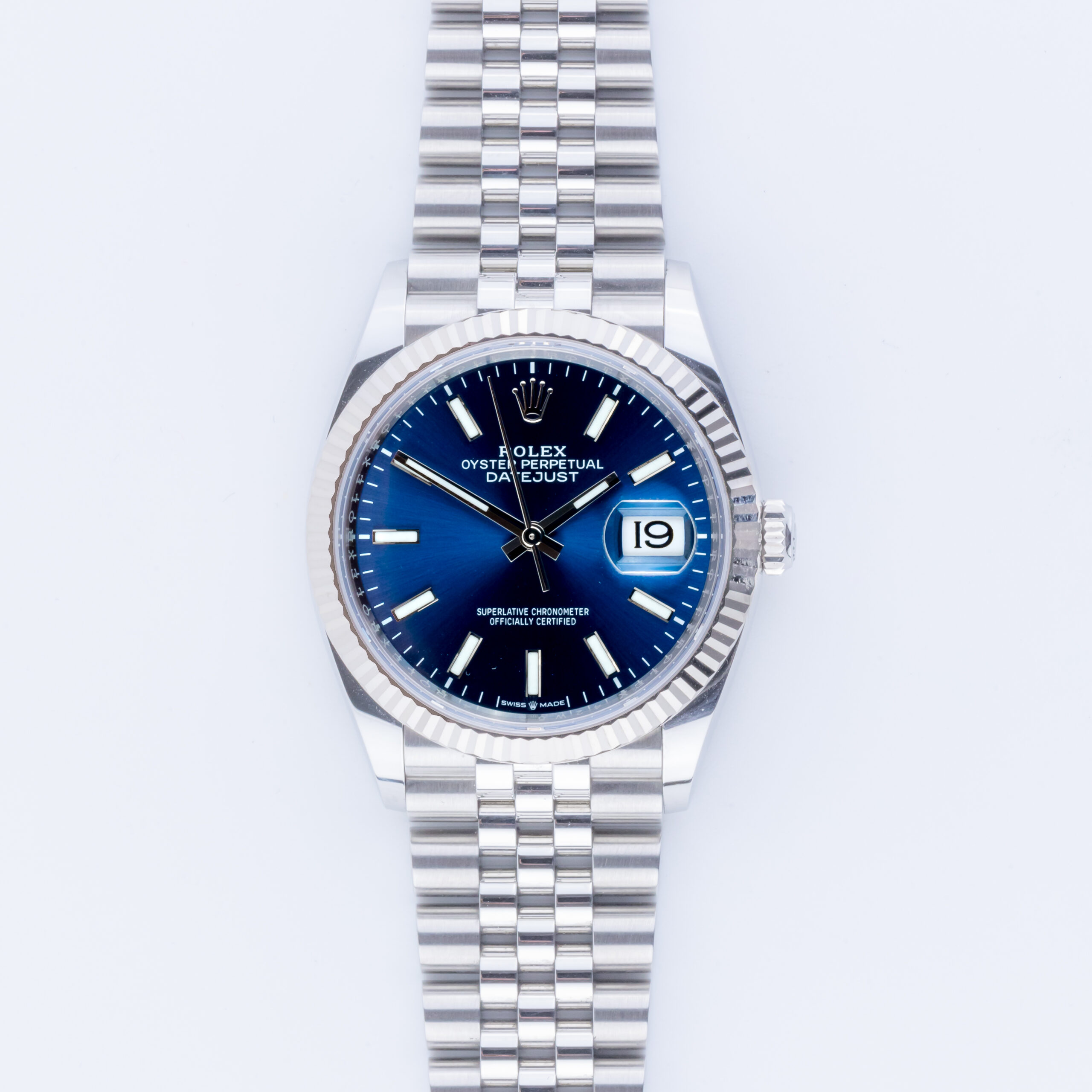 Rolex Oyster Perpetual Datejust reference 126234 from 2023 including full set. The Datejust 126234 measures a 36mm stainless steel case, a stainless steel Jubilee bracelet with Oysterclasp and a 18k white gold fluted bezel. This Datejust 126234 features an automatic movement caliber 3235 with quickset date function, scratch resistance sapphire crystal and a blue dial with chromalight hands and markers.