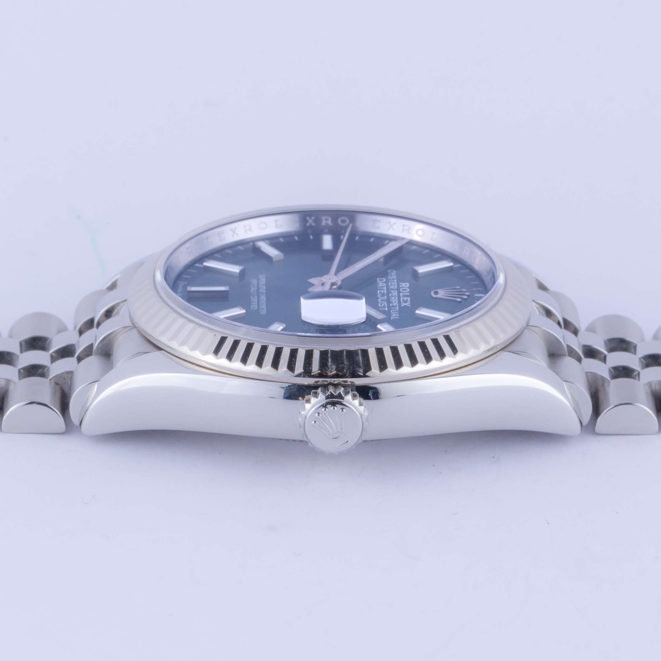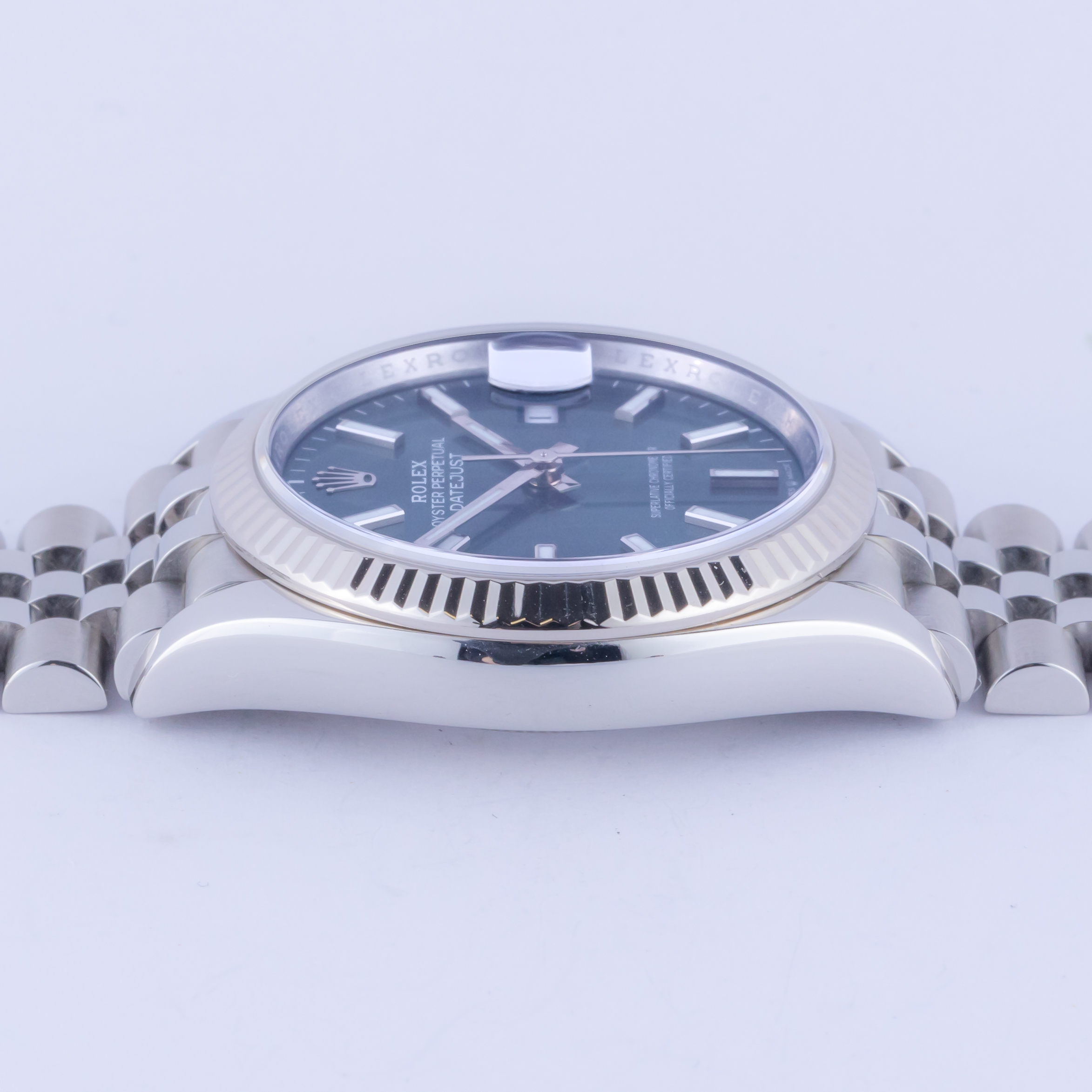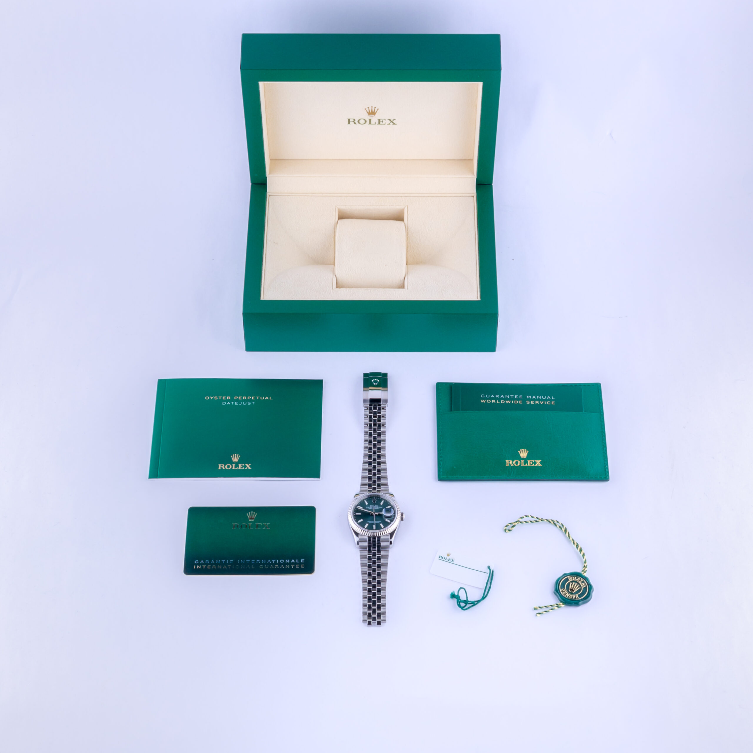 Rolex Oyster Perpetual Datejust reference 126234 from 2023 including full set. The Datejust 126234 measures a 36mm stainless steel case, a stainless steel Jubilee bracelet with Oysterclasp and a 18k white gold fluted bezel. This Datejust 126234 features an automatic movement caliber 3235 with quickset date function, scratch resistance sapphire crystal and a mint green dial with chromalight display.