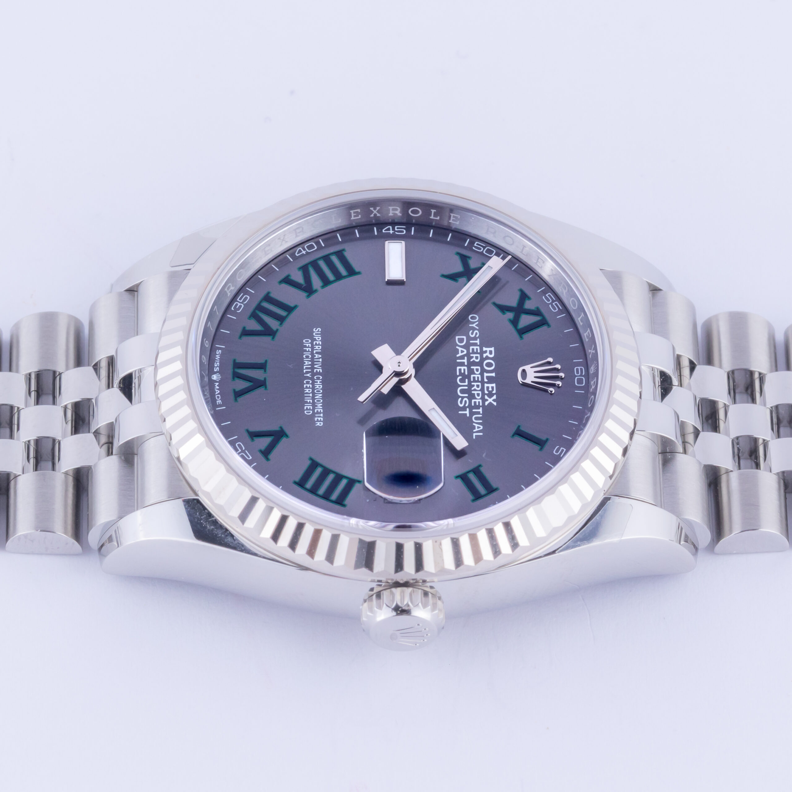 Rolex Oyster Perpetual Datejust reference 126234 from 2025 including full set. The Datejust 126234 measures a 36mm stainless steel case, a stainless steel Jubilee bracelet with Oysterclasp and a 18k white gold fluted bezel. This Datejust 126234 features an automatic movement caliber 3235 with quickset date function, scratch resistance sapphire crystal and a Wimbledon dial with Roman markers.