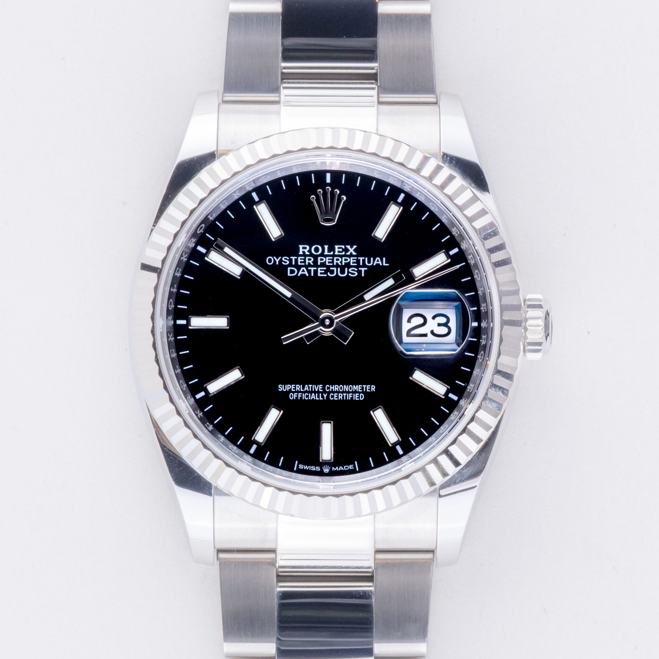 Rolex Oyster Perpetual Datejust reference 126234 from 2023 including full set. The Datejust 126234 measures a 36mm stainless steel case, a stainless steel Oyster bracelet with Oysterclasp and a 18k white gold fluted bezel. This Datejust 126234 features an automatic movement caliber 3235 with quickset date function, scratch resistance sapphire crystal and a black dial with chromalight hands and markers.