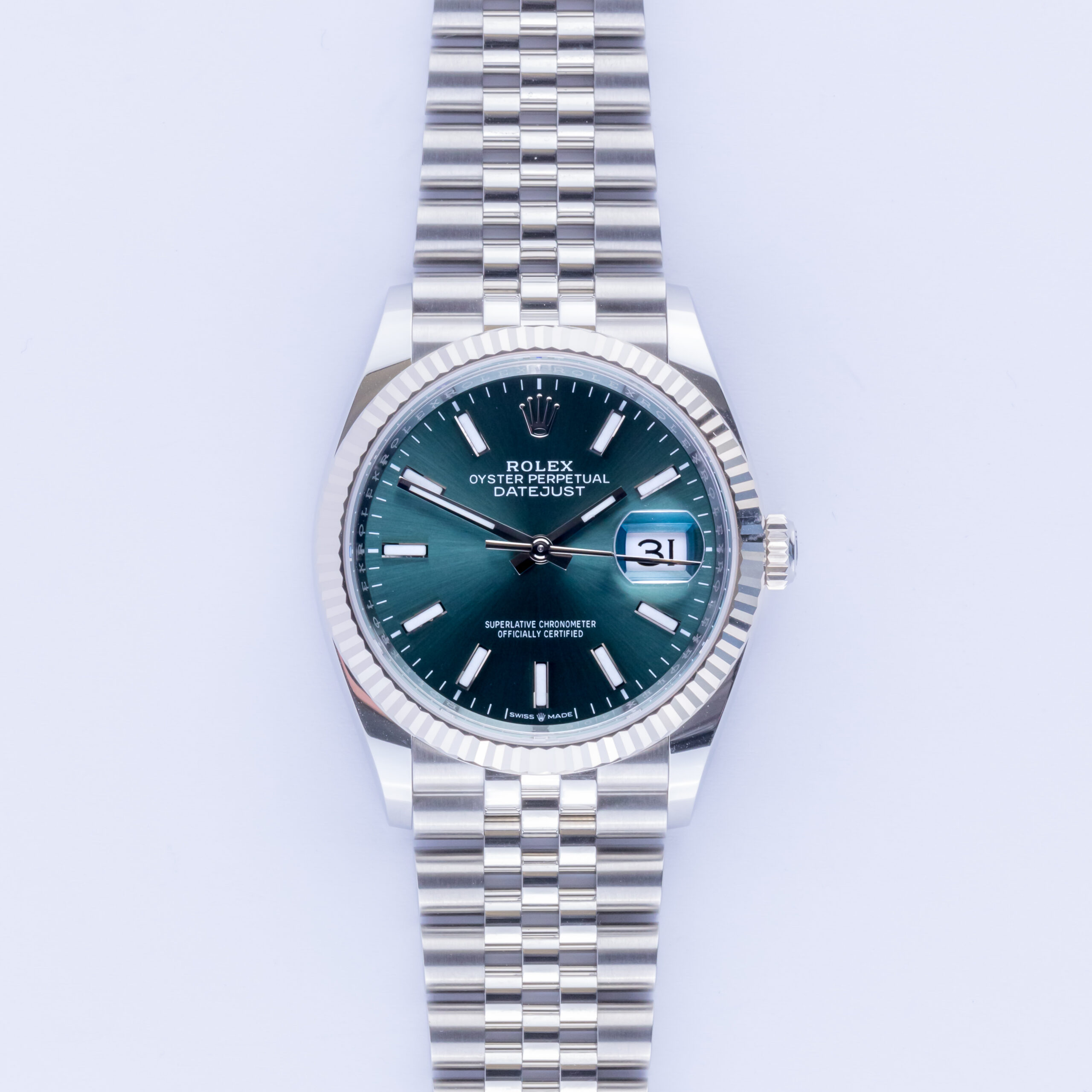 Rolex Oyster Perpetual Datejust reference 126234 from 2023 including full set. The Datejust 126234 measures a 36mm stainless steel case, a stainless steel Jubilee bracelet with Oysterclasp and a 18k white gold fluted bezel. This Datejust 126234 features an automatic movement caliber 3235 with quickset date function, scratch resistance sapphire crystal and a mint green dial with chromalight hands and markers.