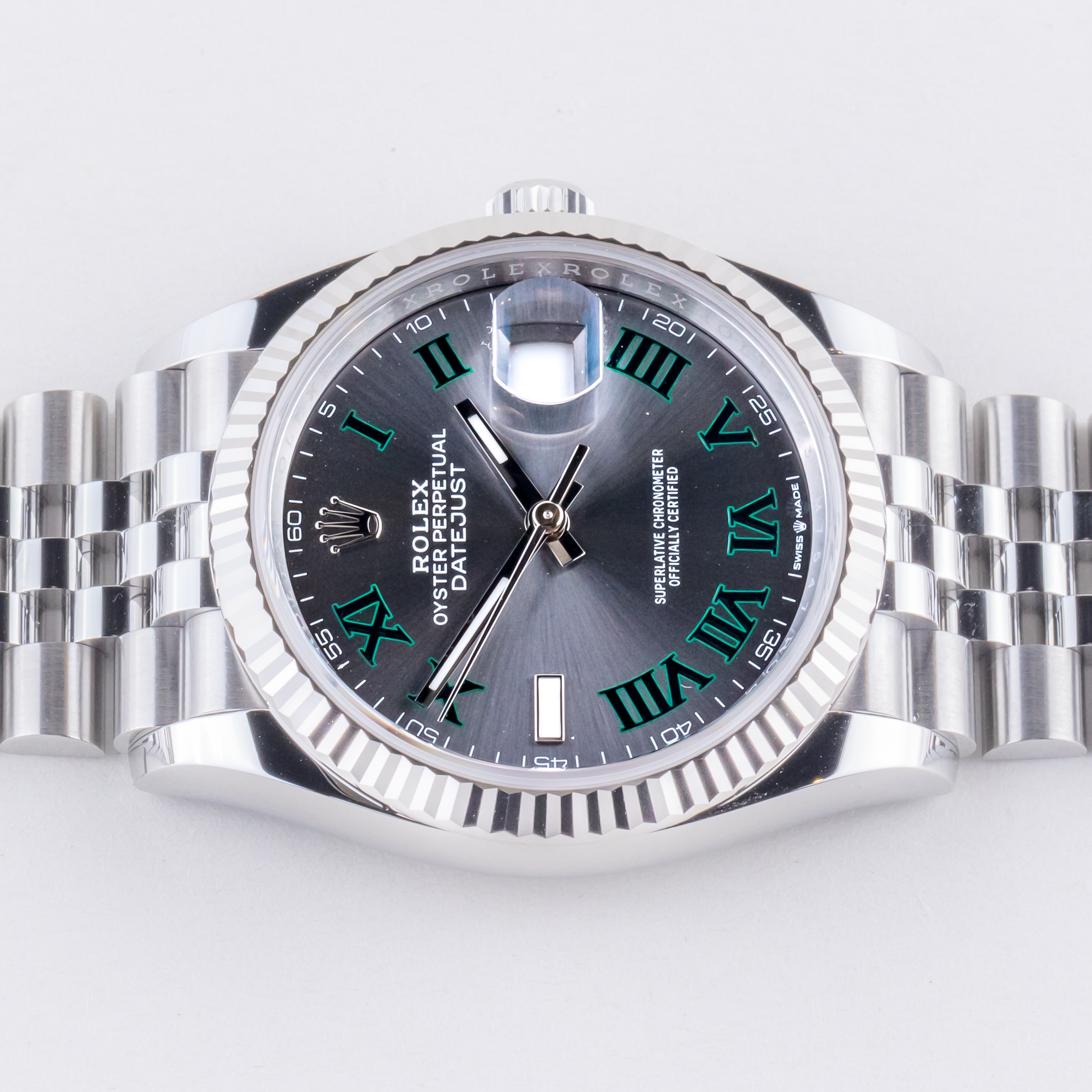 Rolex Oyster Perpetual Datejust reference 126234 from 2025 including full set. The Datejust 126234 measures a 36mm stainless steel case, a stainless steel Jubilee bracelet with Oysterclasp and a 18k white gold fluted bezel. This Datejust 126234 features an automatic movement caliber 3235 with quickset date function, scratch resistance sapphire crystal and a Wimbledon dial with Roman markers.