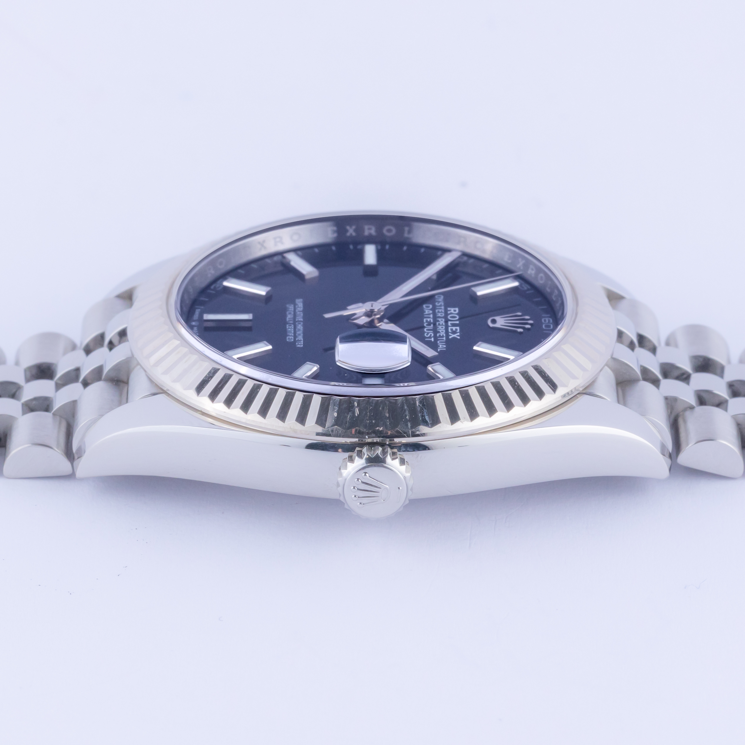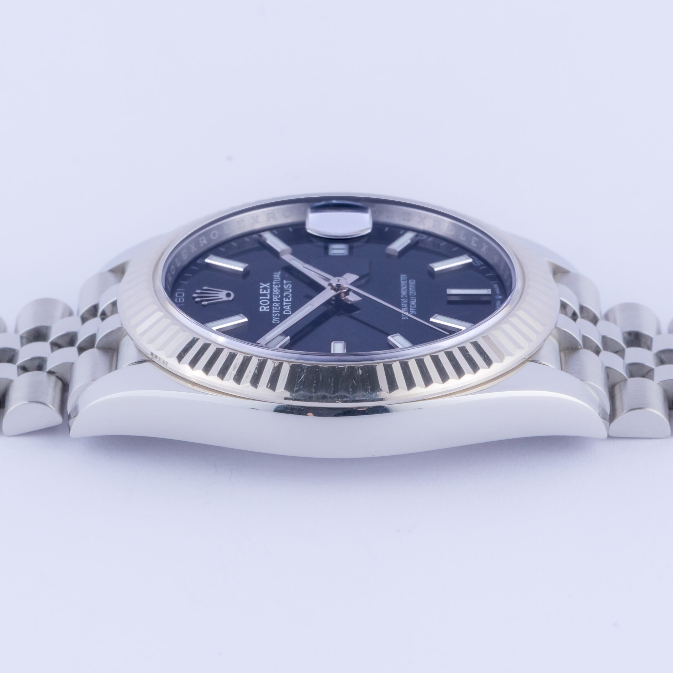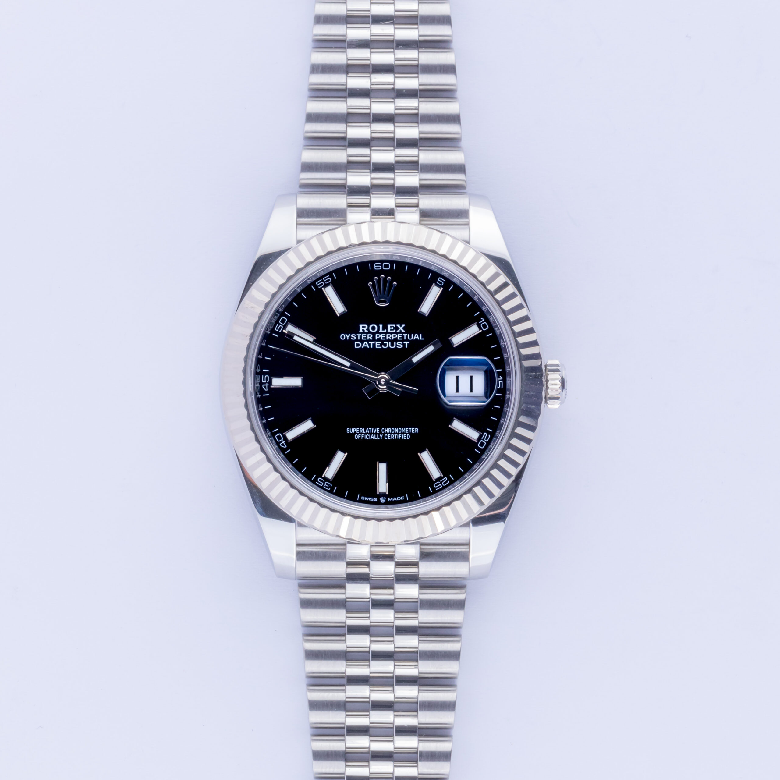 Rolex Datejust reference 126334 from 2023 including full set. The Datejust 126334 measures a 41mm stainless steel case, a stainless steel (904L) Jubilee bracelet with Oysterclasp and a fluted 18K white gold bezel. This Datejust 126334 features an automatic movement caliber 3235 with a quickset date function, a scratch resistance sapphire crystal and black dial with chromalight display.
