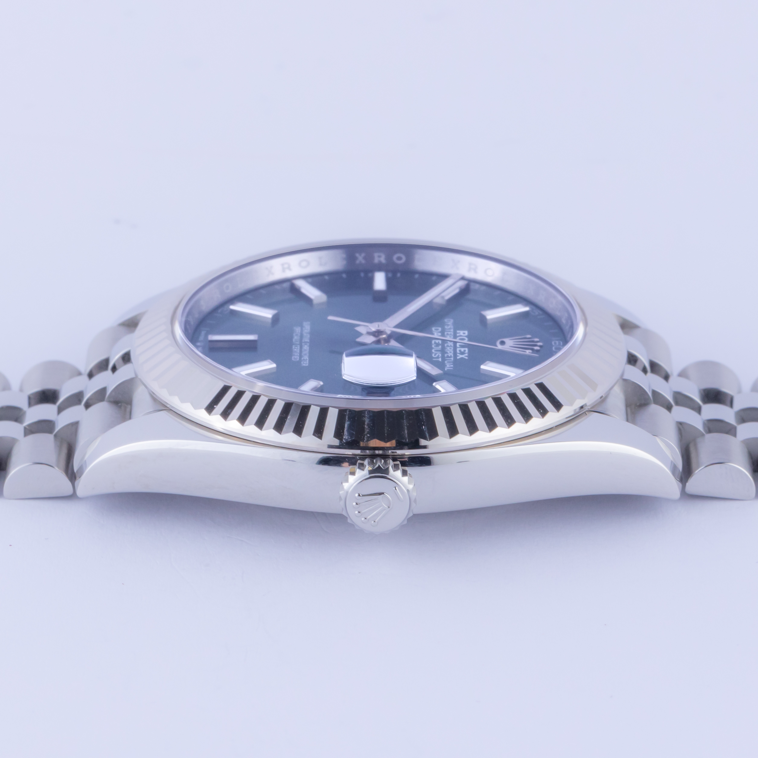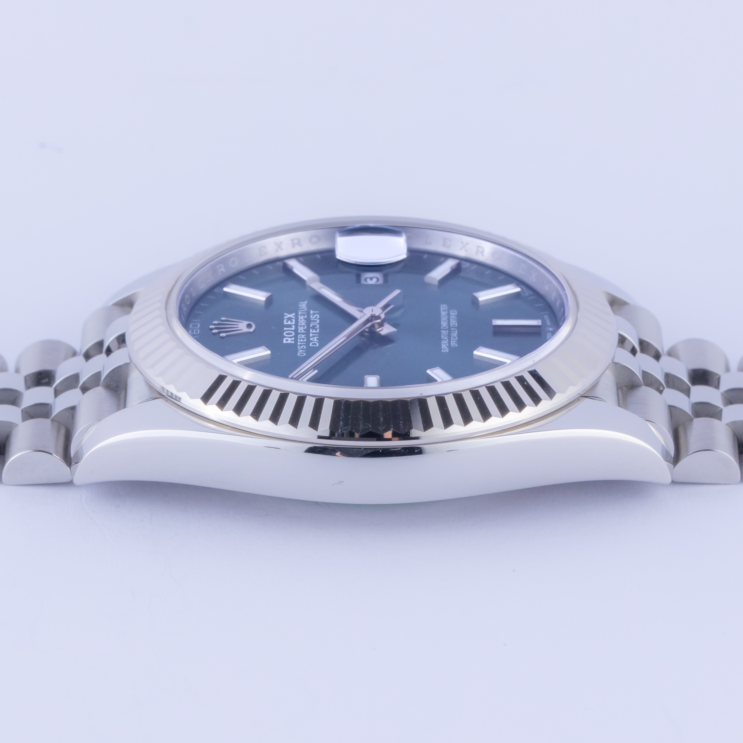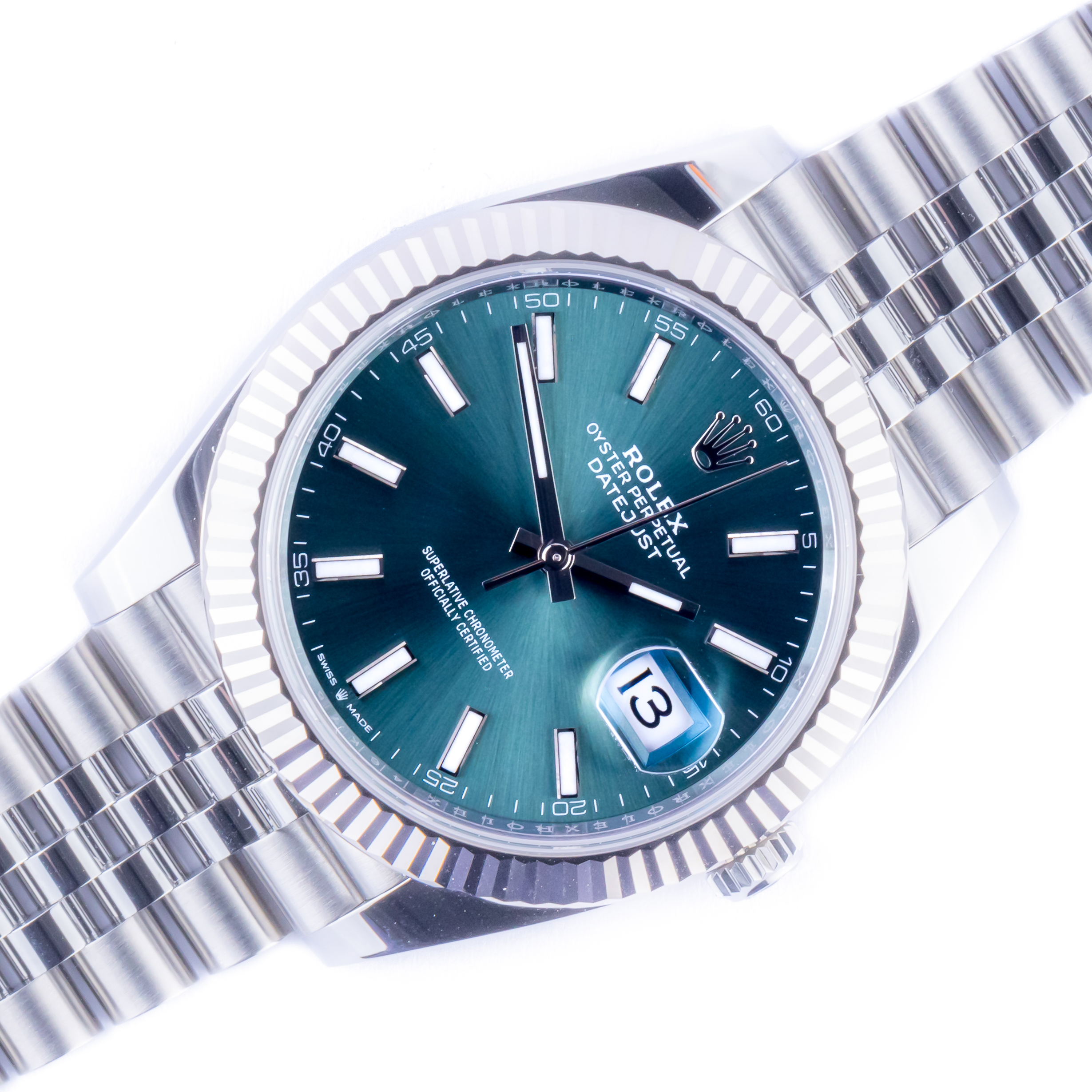 NEW Rolex Oyster Perpetual Datejust reference 126334 from 2024 including full set. The Datejust 126334 measures a 41mm stainless steel case, a stainless steel (904L) Jubilee bracelet with Oysterclasp and a fluted 18K white gold bezel. This Datejust 126334 features an automatic movement caliber 3235 with a quickset date function, a scratch resistance sapphire crystal and a mint green dial.