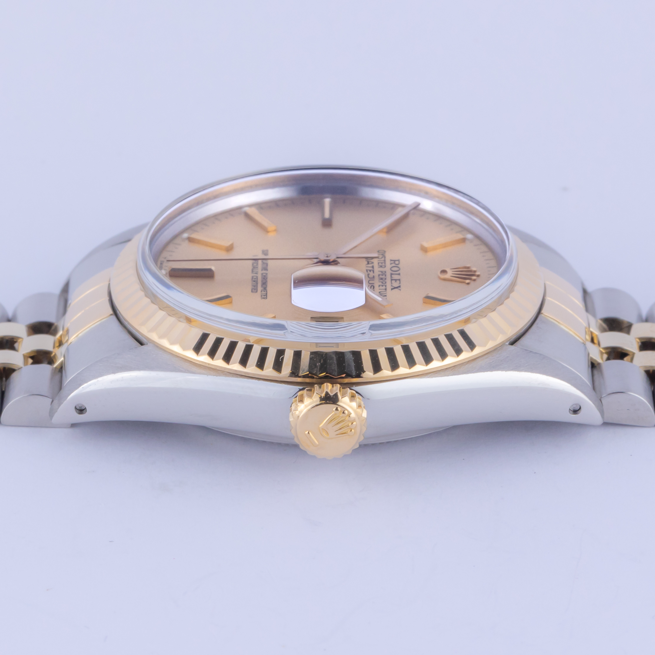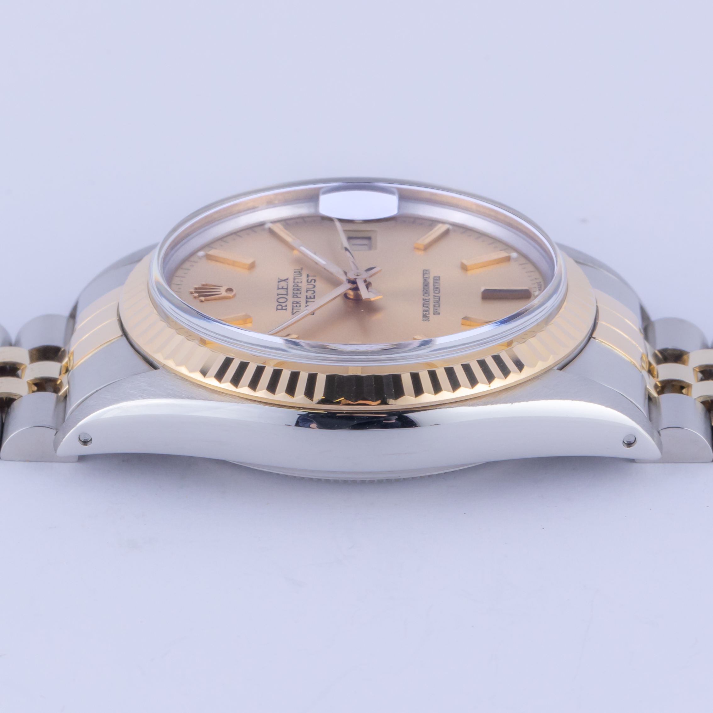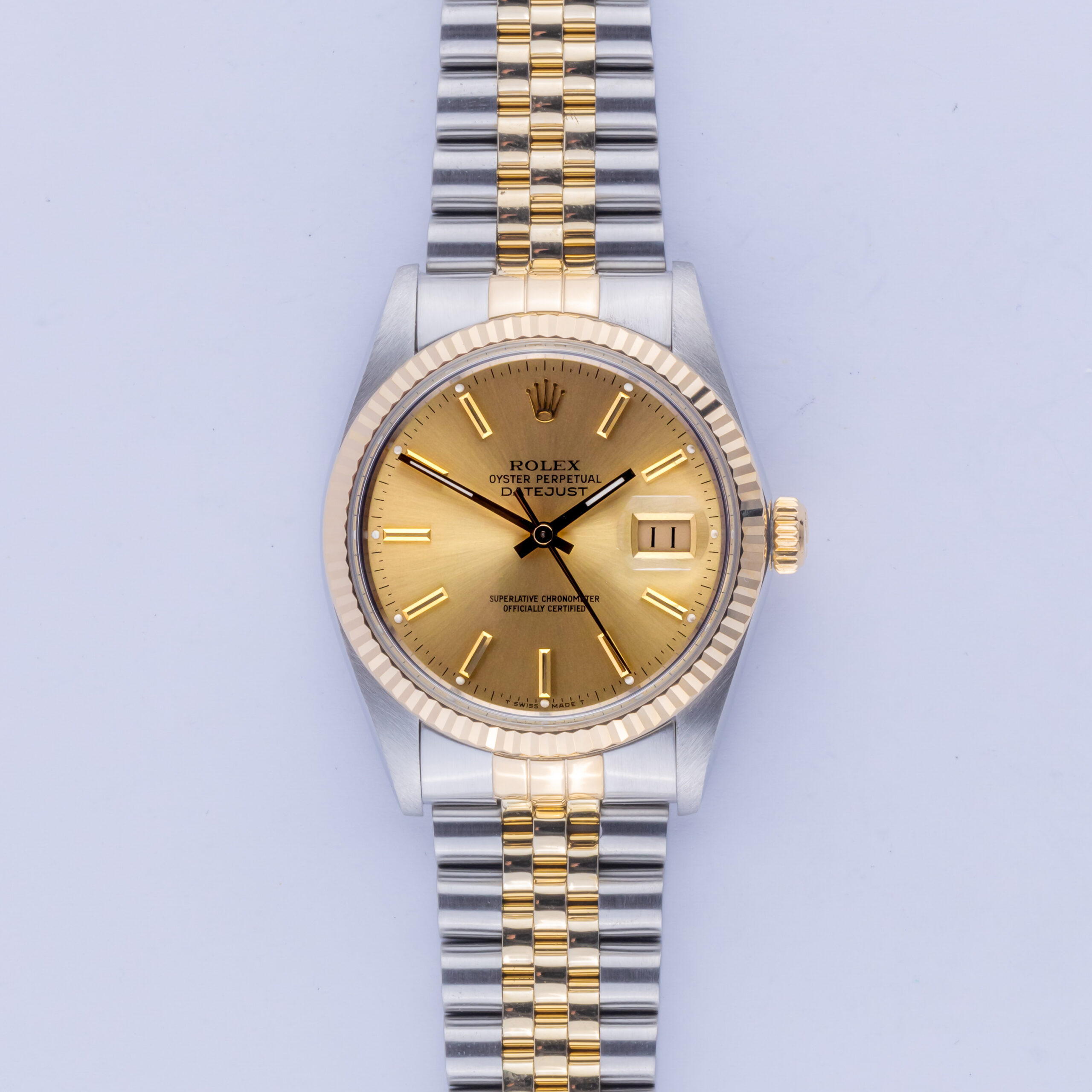 Rolex Oyster Perpetual Datejust reference 16013 from 1985 including full set. The Datejust 16013 measures a 36mm gold and stainless steel case, two-tone Jubilee bracelet and fluted 18k gold bezel. This Datejust 16013 features an automatic movement caliber 3035 with a quickset date function, a plexi glass and a champagne dial.