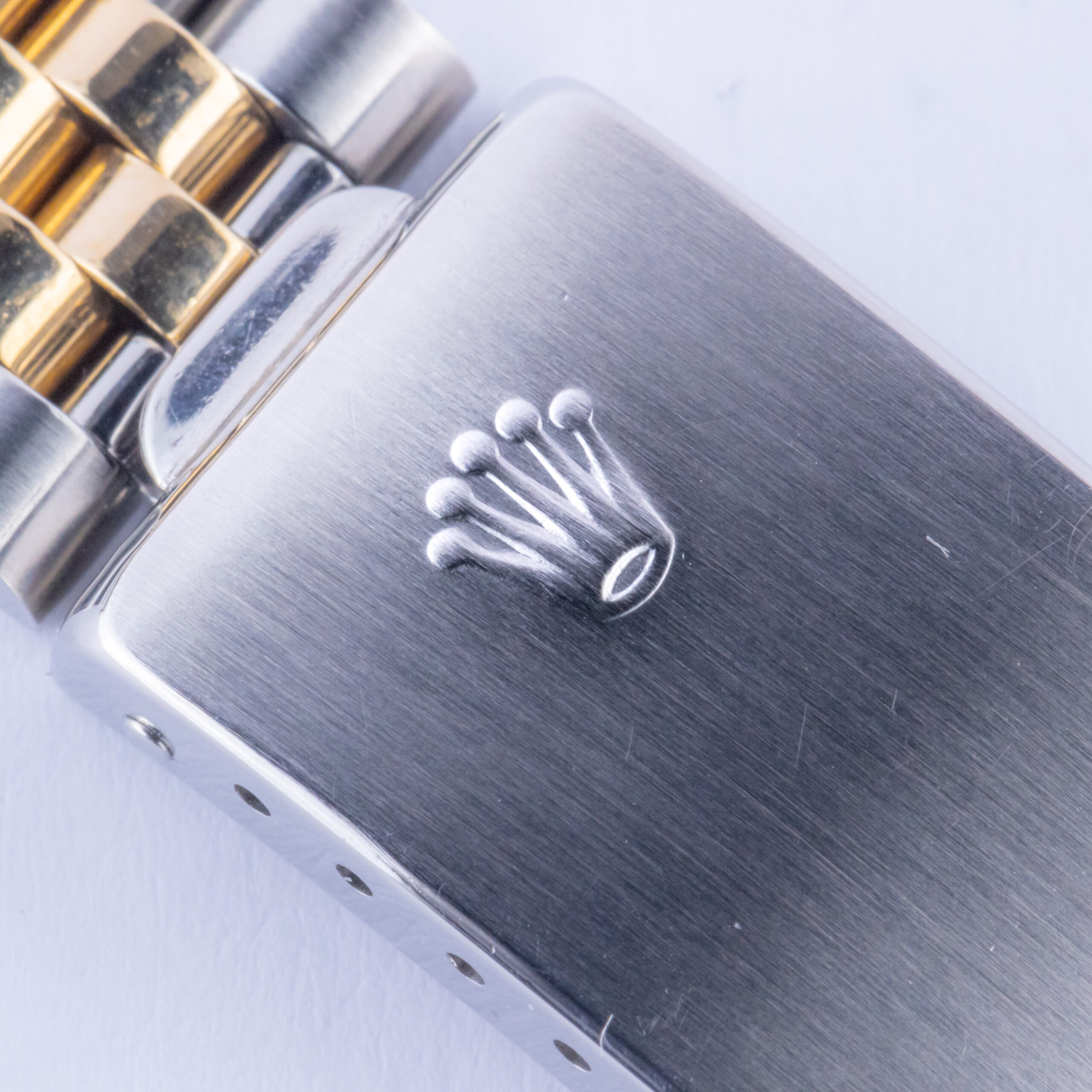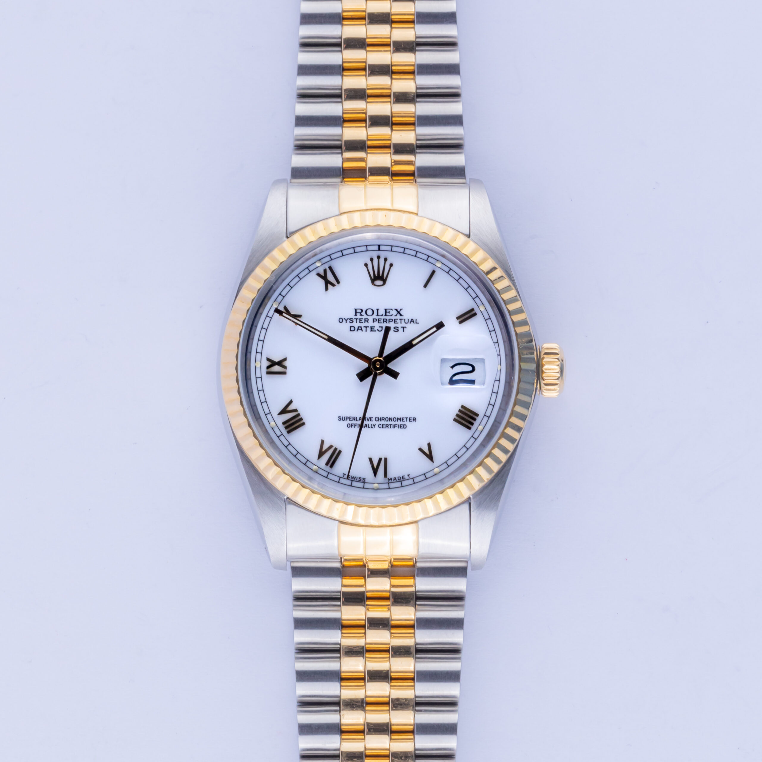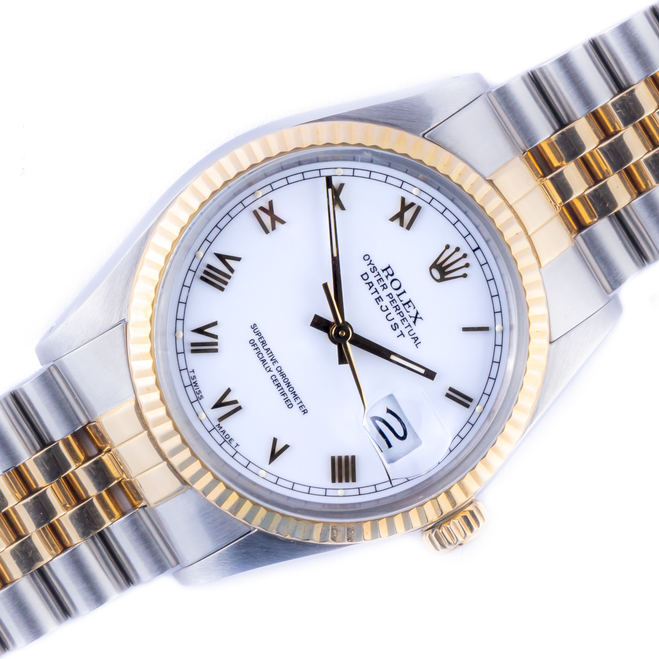 Rolex Oyster Perpetual Datejust reference 16013 from 1986. The Datejust 16013 measures a 36mm gold and stainless steel case, two-tone Jubilee bracelet and fluted 18k gold bezel. This Datejust 16013 features an automatic movement caliber 3035 with a quickset date function, a plexi glass and a white stick dial with Roman markers.
