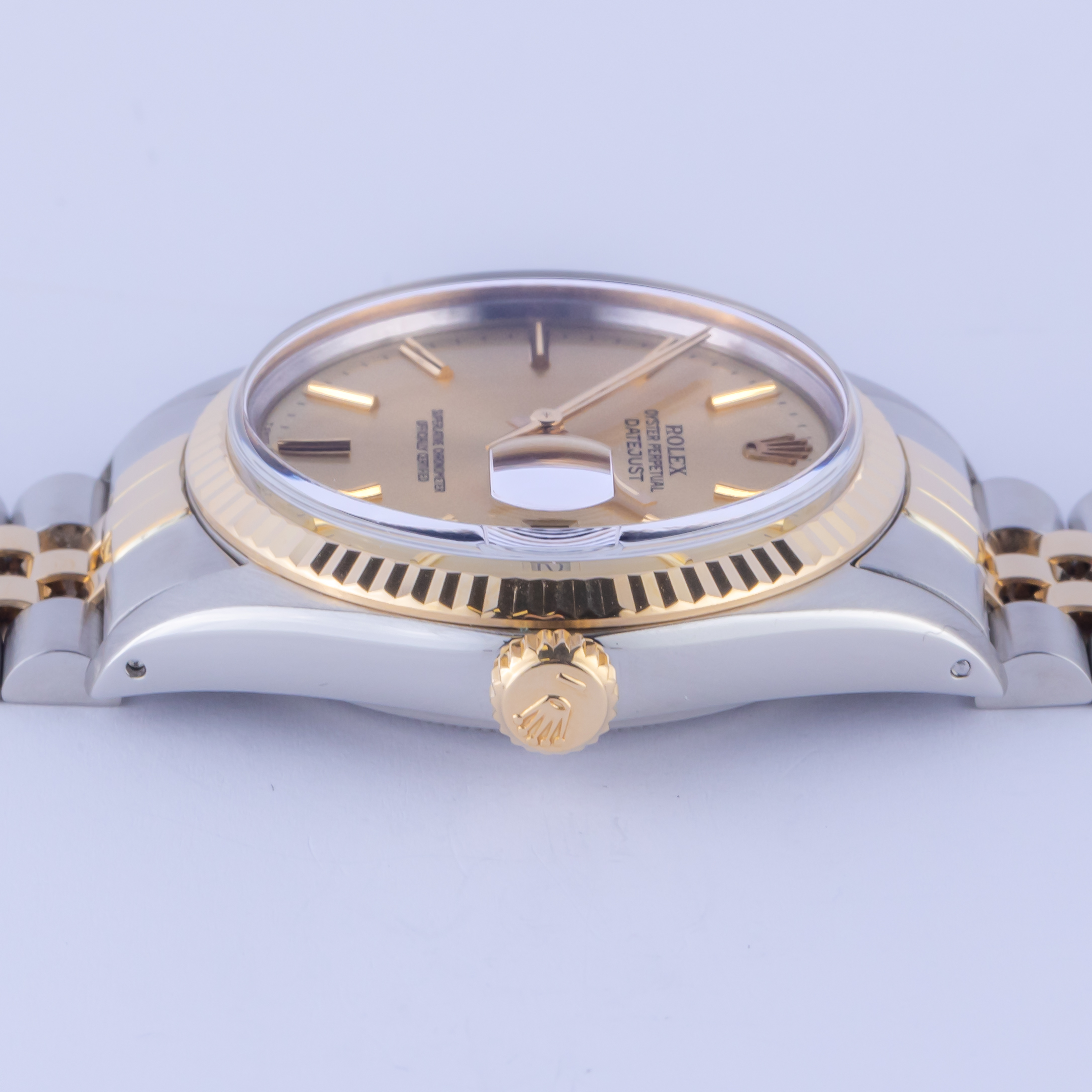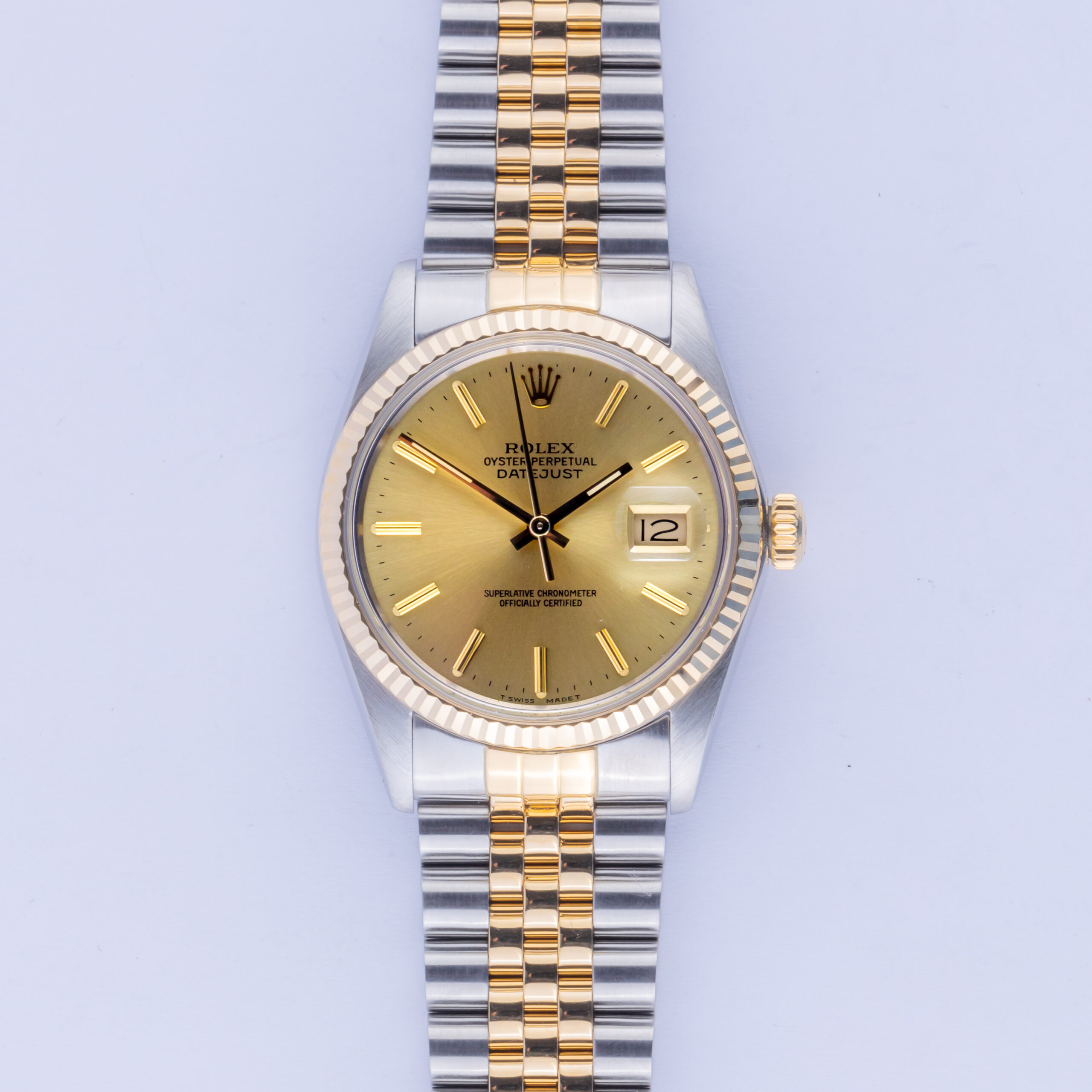 Rolex Oyster Perpetual Datejust reference 16013 from 1986 including full set. The Datejust 16013 measures a 36mm gold and stainless steel case, two-tone Jubilee bracelet and fluted 18k gold bezel. This Datejust 16013 features an automatic movement caliber 3035 with a quickset date function, a plexi glass and a champagne dial.
