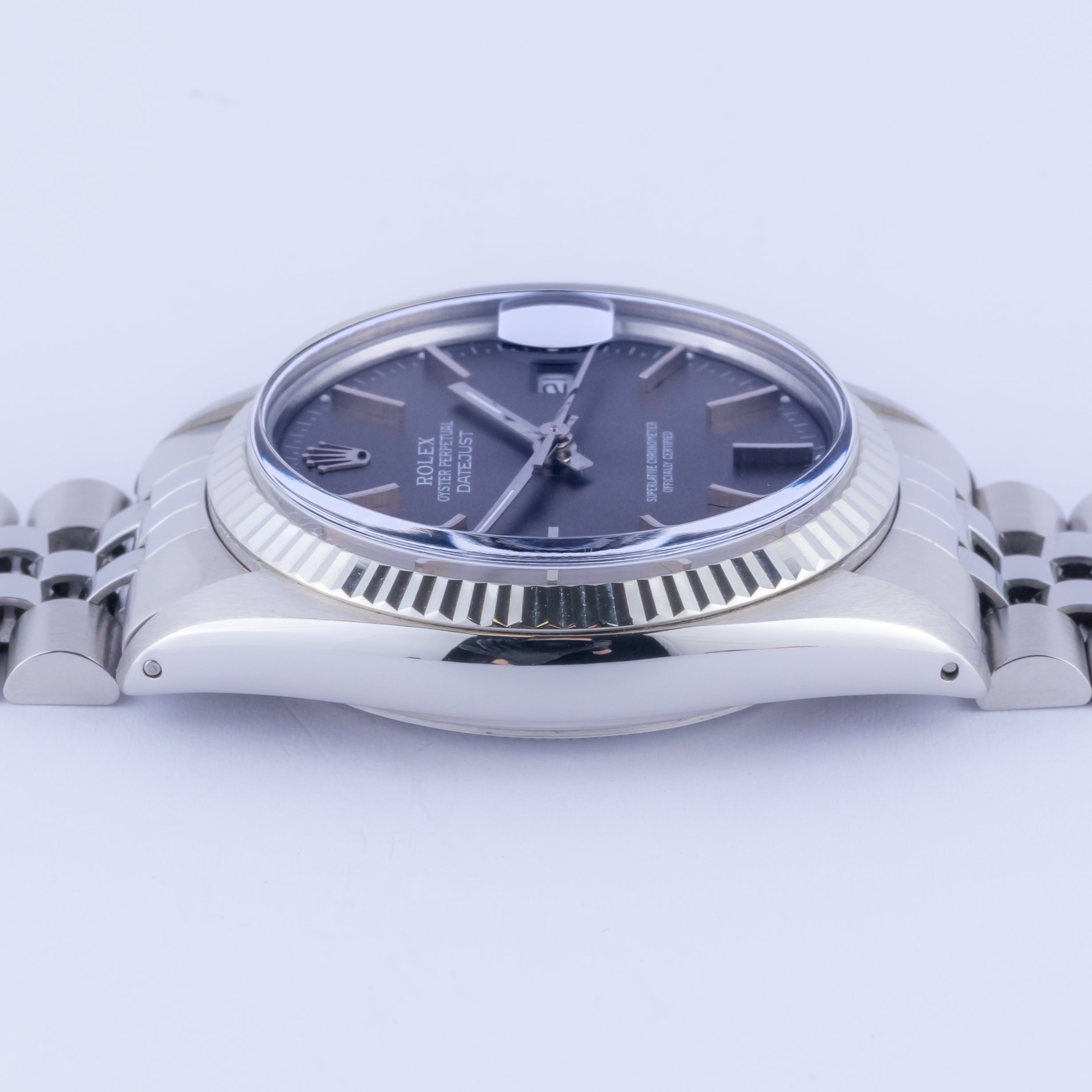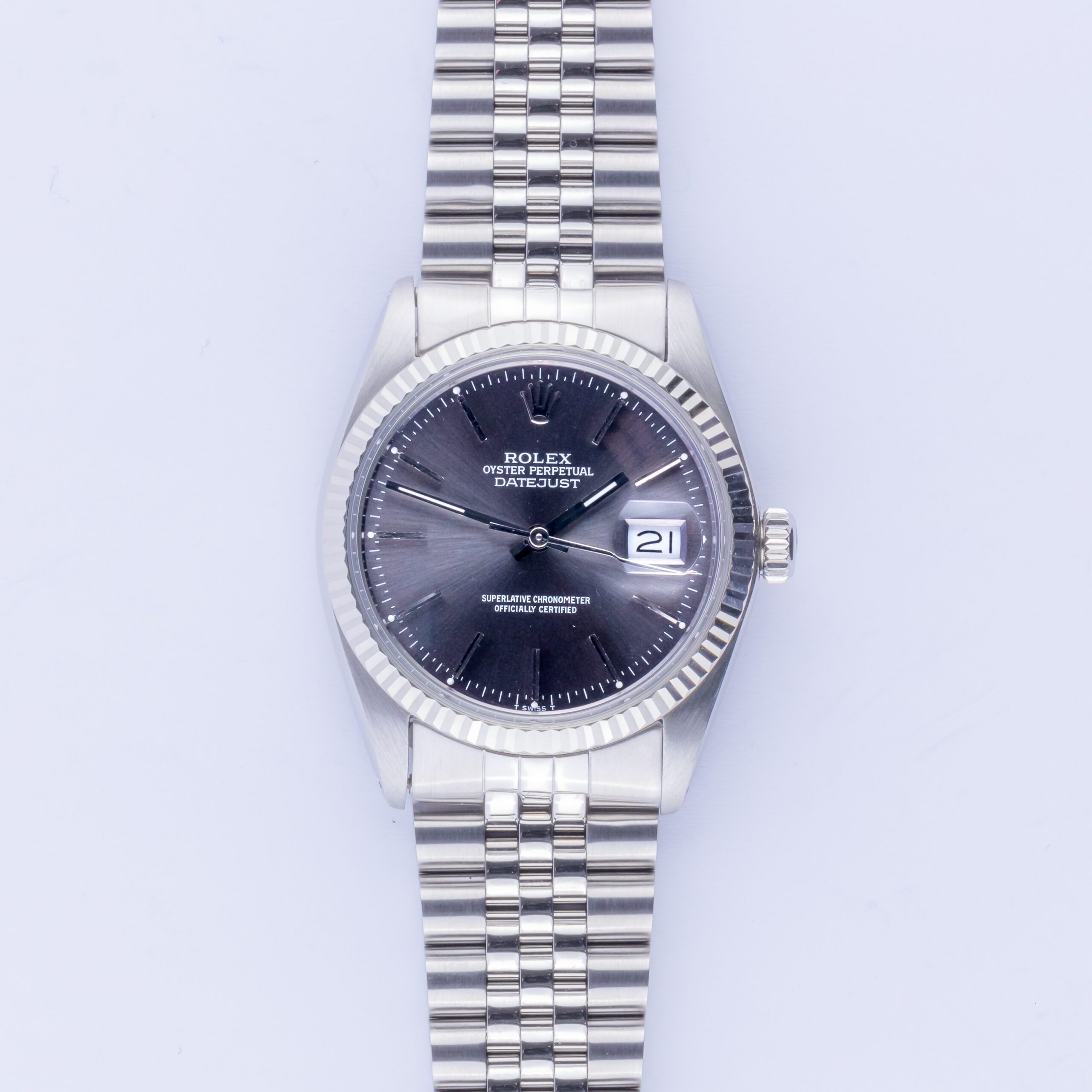 Rolex Oyster Perpetual Datejust reference 16014 from 1987 including full set. The Datejust 16014 measures a 36mm stainless steel case with a 18k white gold bezel and stainless steel Jubilee bracelet. The Datejust 16014 features an automatic movement caliber 3035 with quickset date function, a water resistance plexi glass and a grey dial with tritium hands.