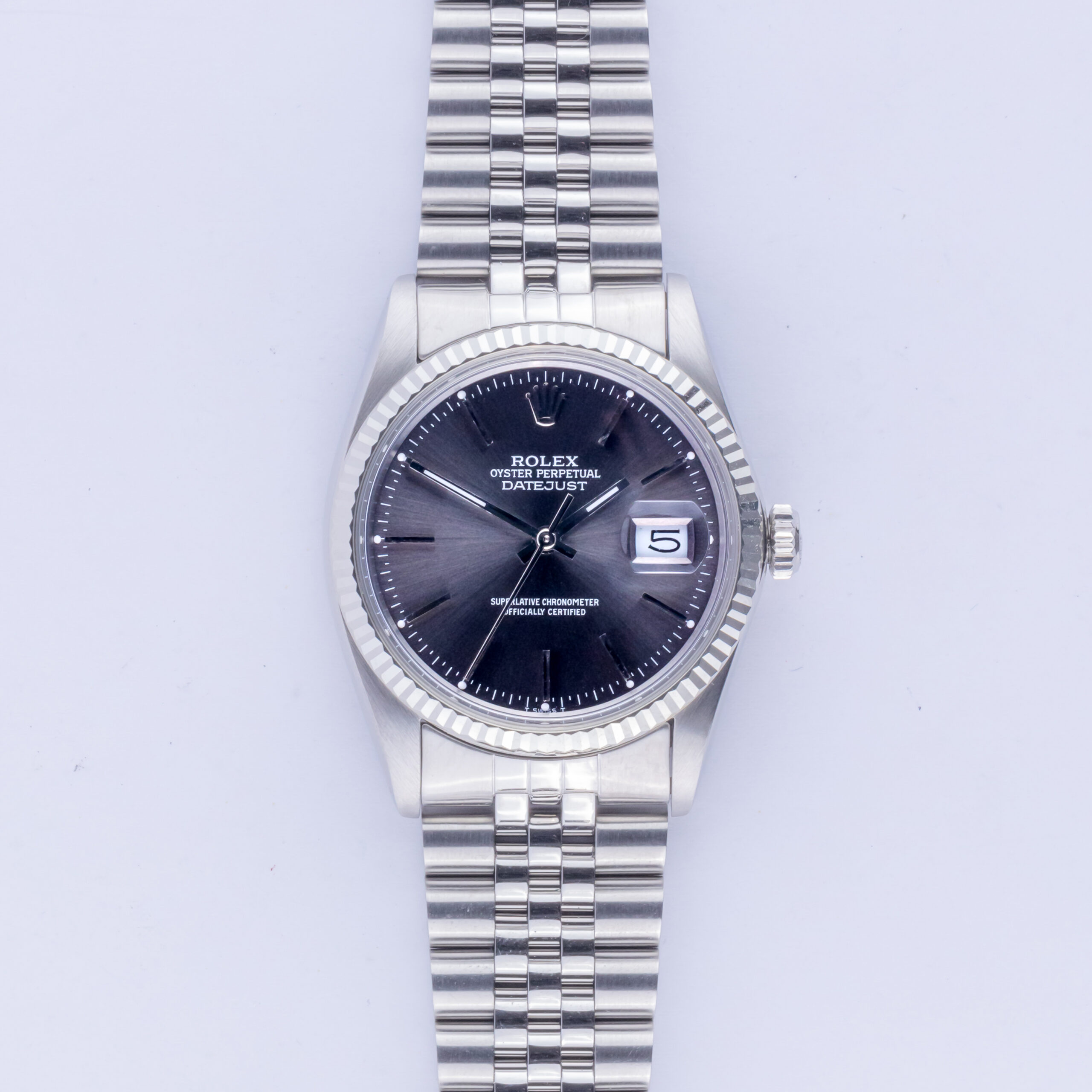 Rolex Oyster Perpetual Datejust reference 16014 from 1985 including full set. The Datejust 16014 measures a 36mm stainless steel case with a 18k white gold bezel and stainless steel Jubilee bracelet. The Datejust 16014 features an automatic movement caliber 3035 with quickset date function, a water resistance plexi glass and a Grey dial with tritium hands.