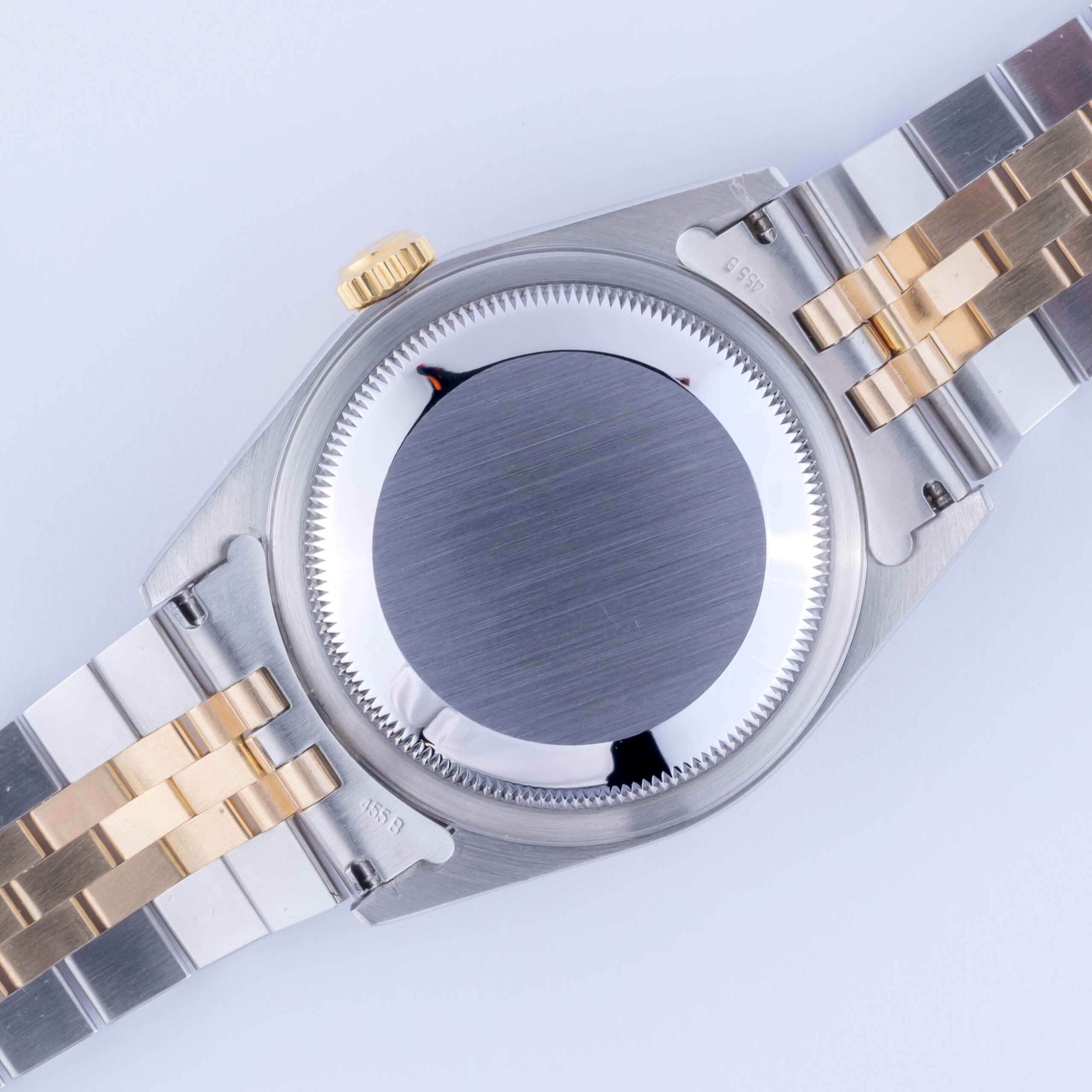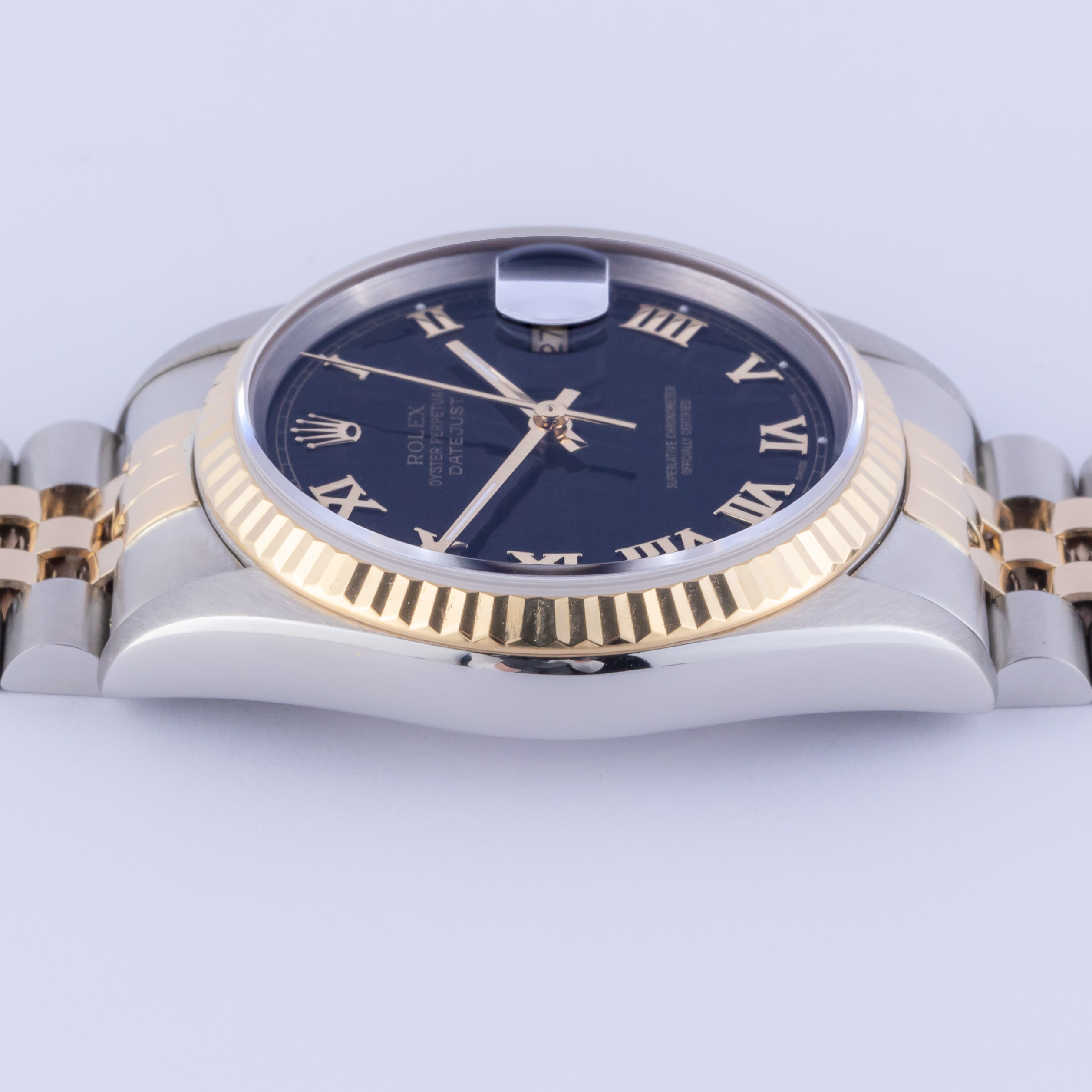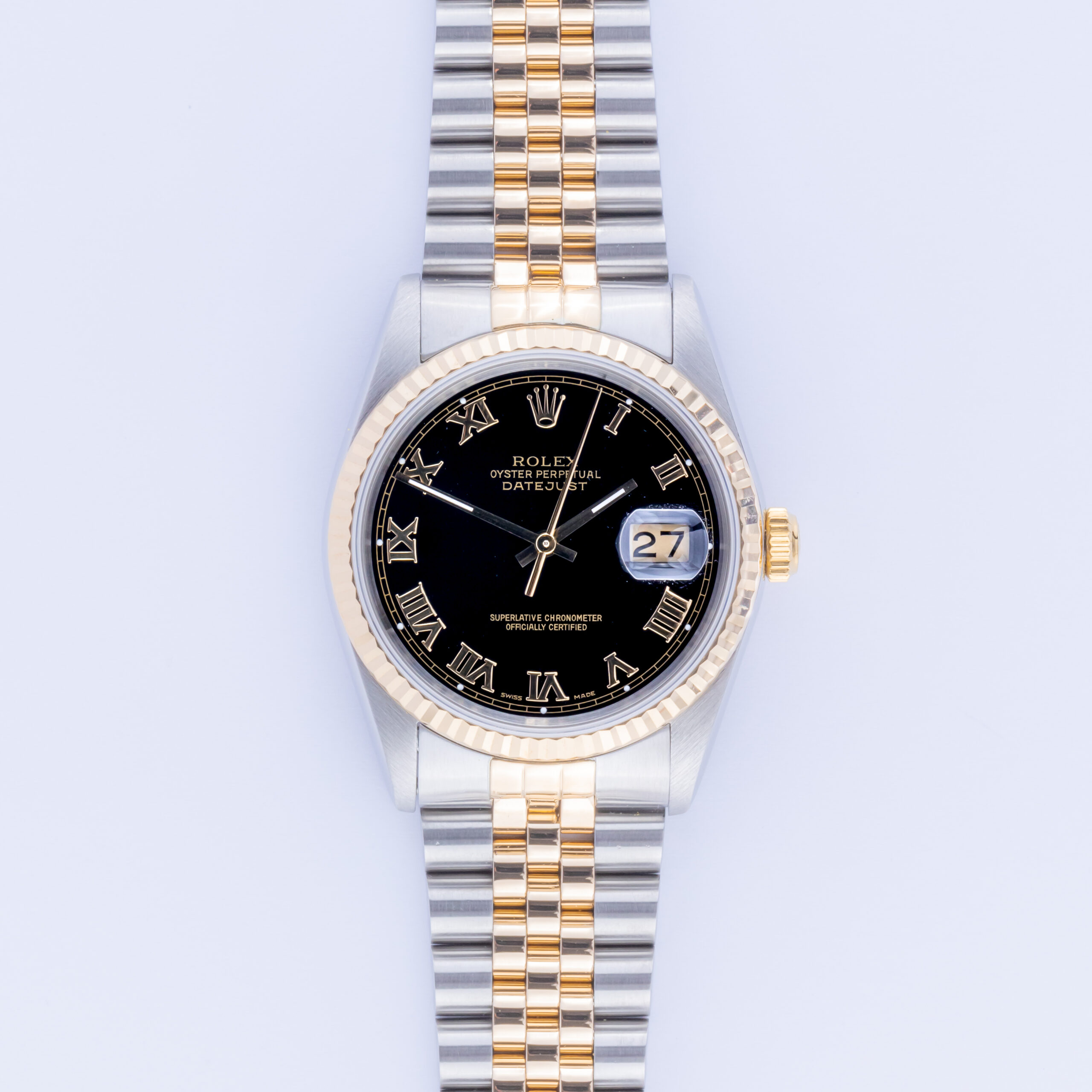 Rolex Oyster Perpetual Datejust reference 16233 from 1997 including full set. The Datejust 16233 measures a 36mm gold and stainless steel case, two-tone Jubilee bracelet and fluted 18k gold bezel. This Datejust 16233 features an automatic movement caliber 3135 with a quickset date function, a scratch resistance sapphire crystal and a black dial with Roman markers and tritium hands.
