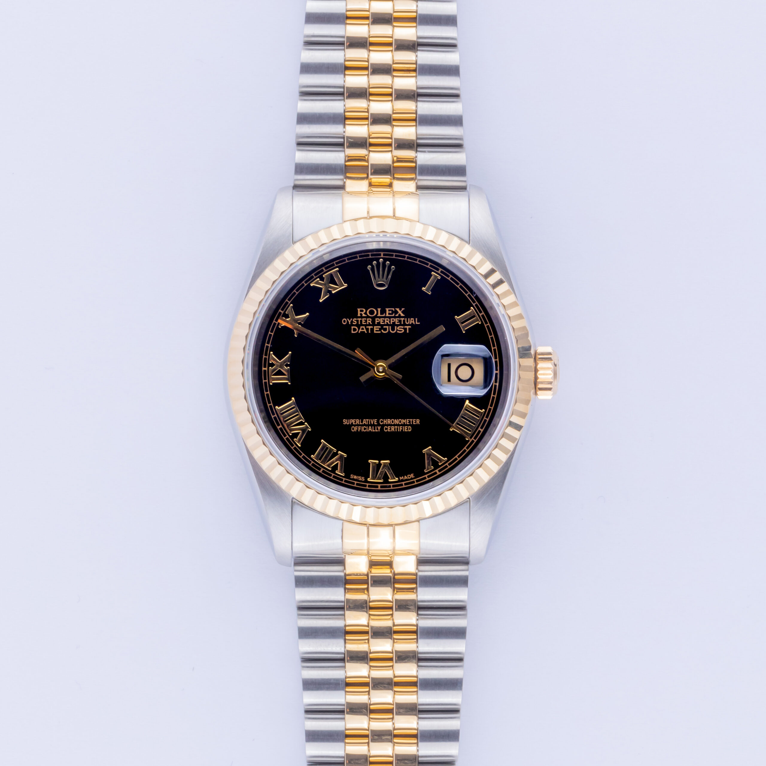Rolex Oyster Perpetual Datejust reference 16233 from 1998 including full set. The Datejust 16233 measures a 36mm gold and stainless steel case, two-tone Jubilee bracelet and fluted 18k gold bezel. This Datejust 16233 features an automatic movement caliber 3135 with a quickset date function, a scratch resistance sapphire crystal and a black Pyramid dial with tritium hands.