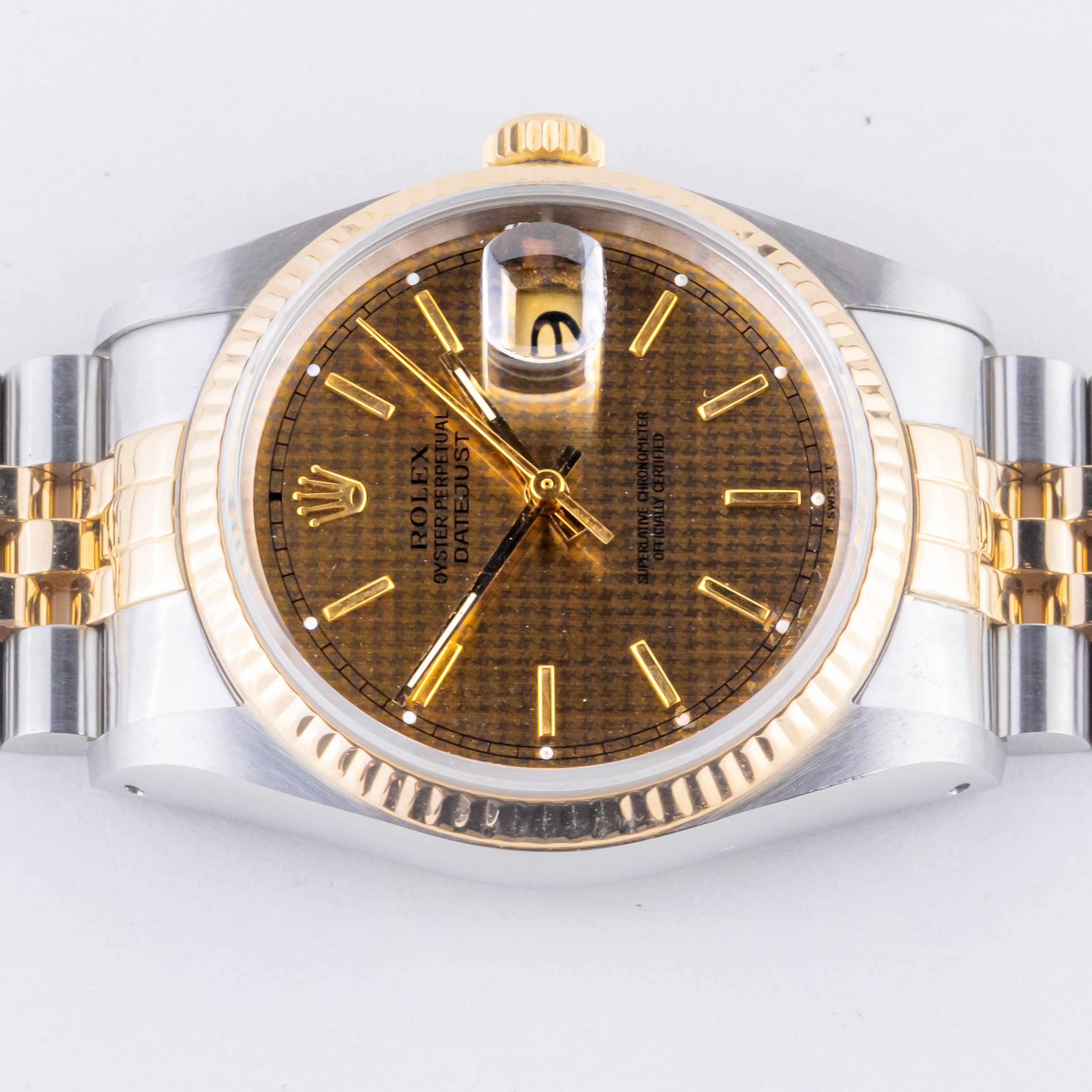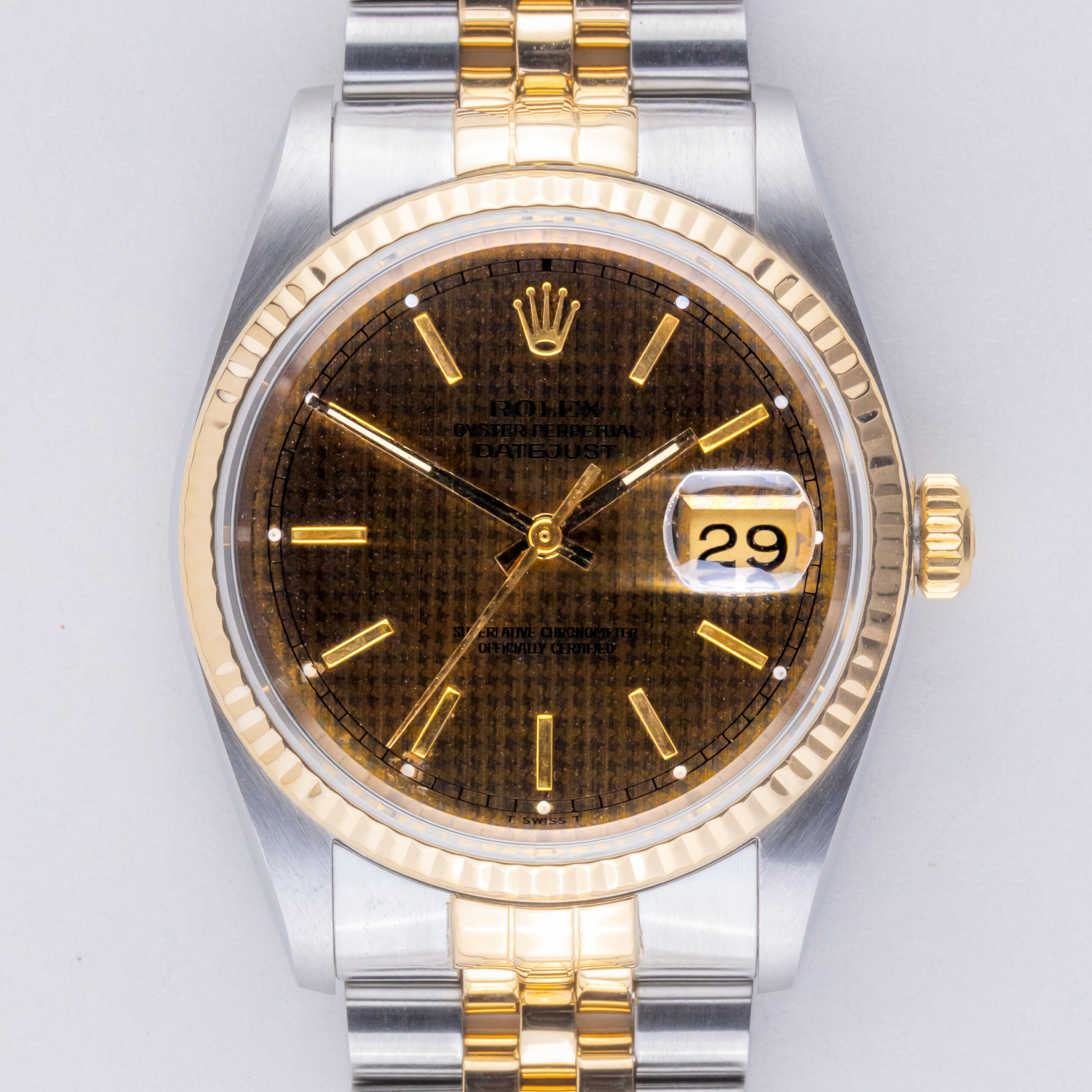 Rolex Oyster Perpetual Datejust reference 16233 from 1991. The Datejust 16233 measures a 36mm gold and stainless steel case, two-tone Jubilee bracelet and fluted 18k gold bezel. This Datejust 16233 features an automatic movement caliber 3135 with a quickset date function, a scratch resistance sapphire crystal and a houndstooth dial.