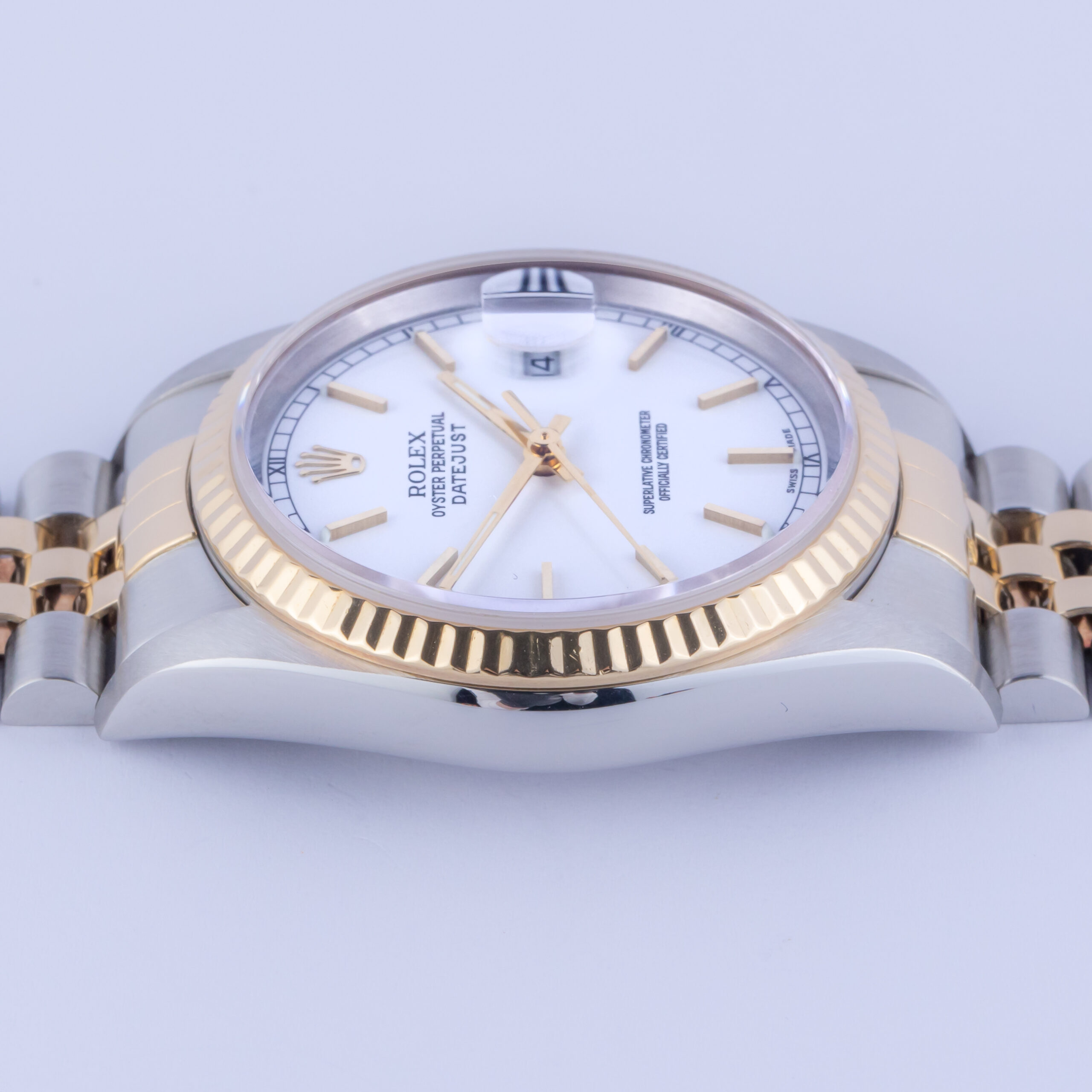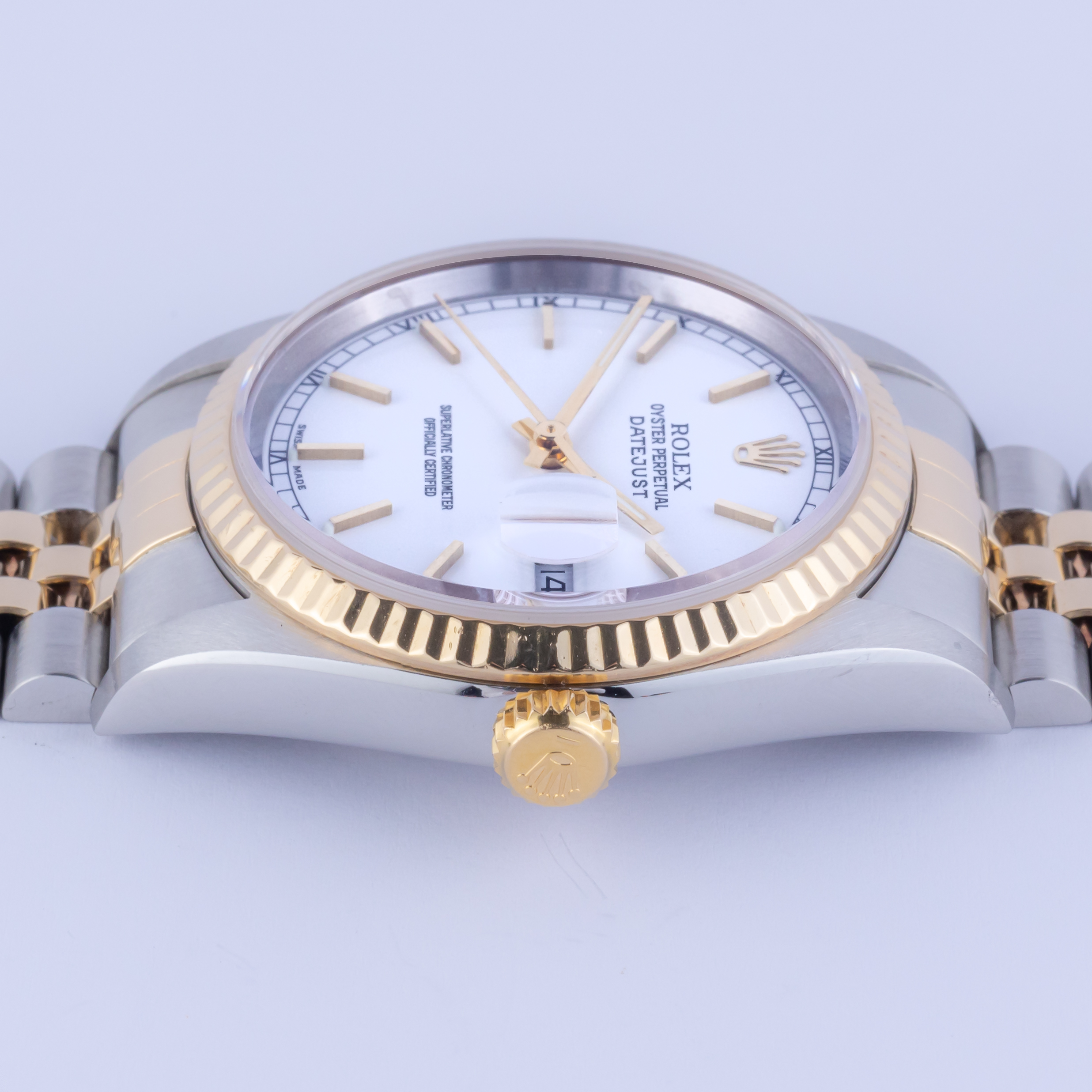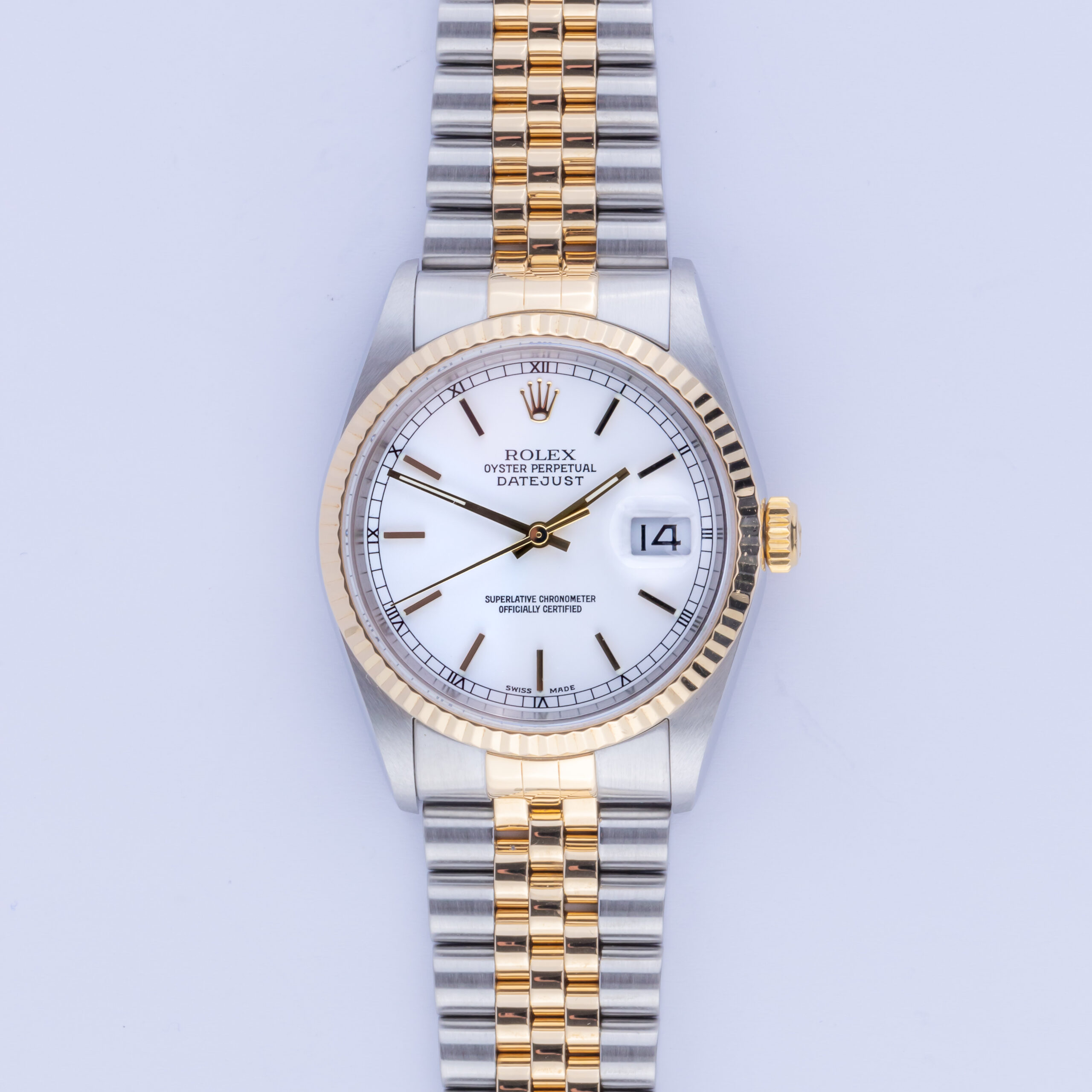Rolex Oyster Perpetual Datejust reference 16233 from 2001. The Datejust 16233 measures a 36mm gold and stainless steel case, two-tone Jubilee bracelet and fluted 18k gold bezel. This Datejust 16233 features an automatic movement caliber 3135 with a quickset date function, a scratch resistance sapphire crystal and a white dial.