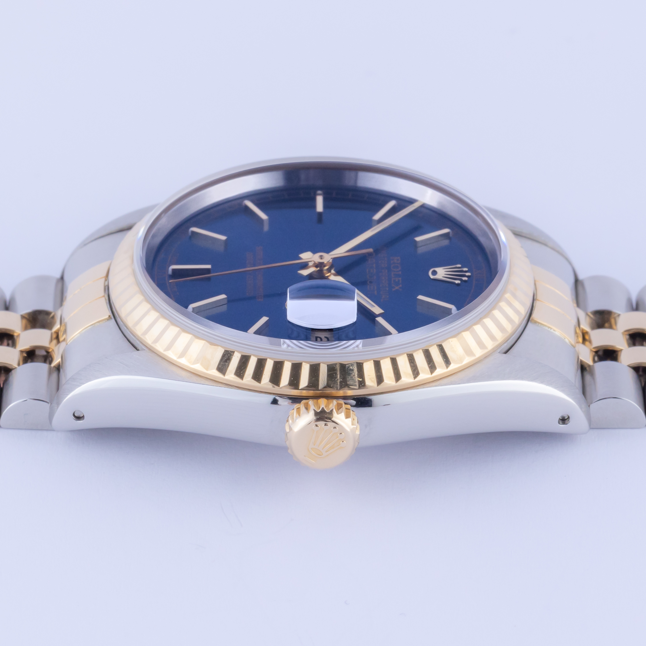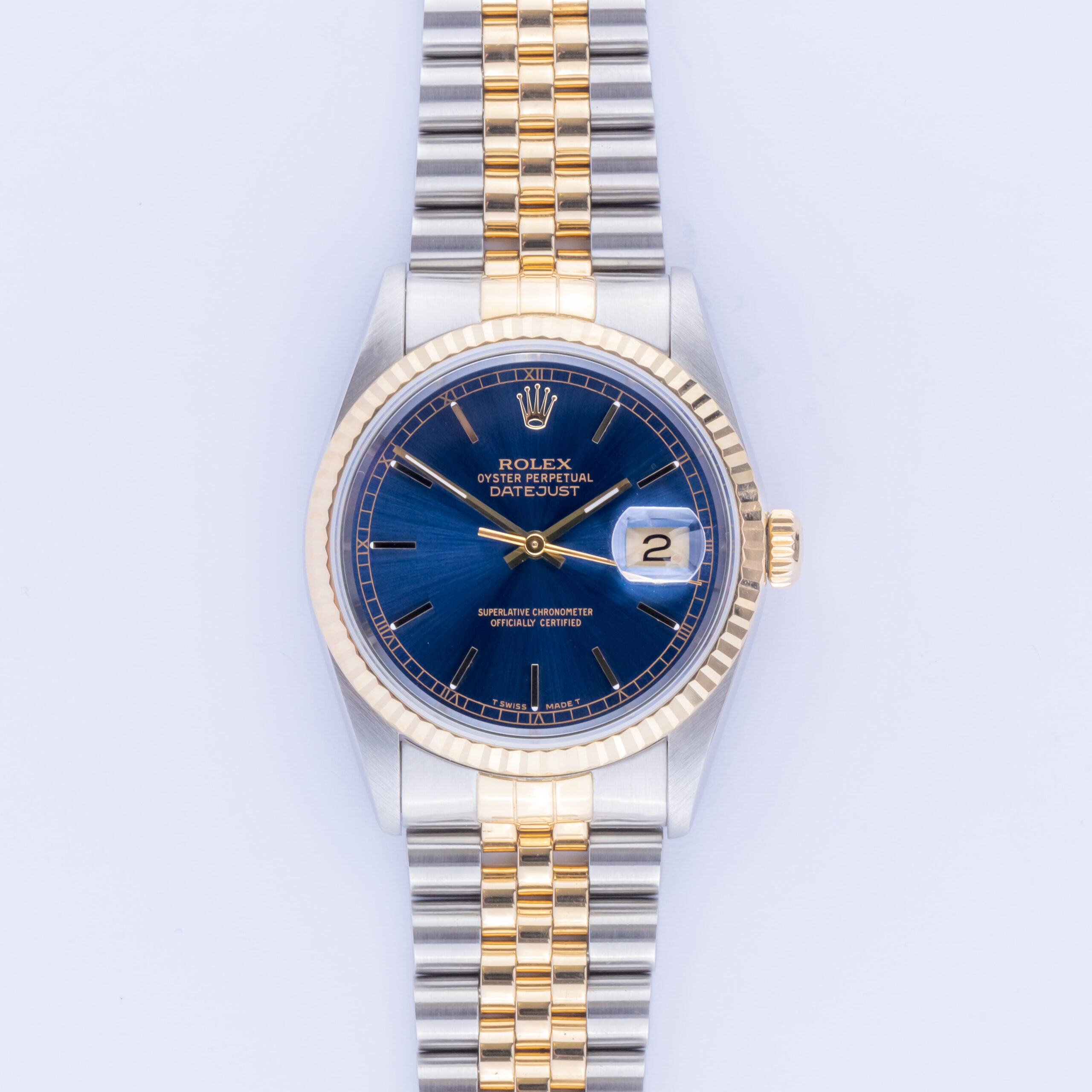 Rolex Oyster Perpetual Datejust reference 16233 from 1993 including full set. The Datejust 16233 measures a 36mm gold and stainless steel case, two-tone Jubilee bracelet and fluted 18k gold bezel. This Datejust 16233 features an automatic movement caliber 3135 with a quickset date function, a scratch resistance sapphire crystal and a blue dial with tritium hands.