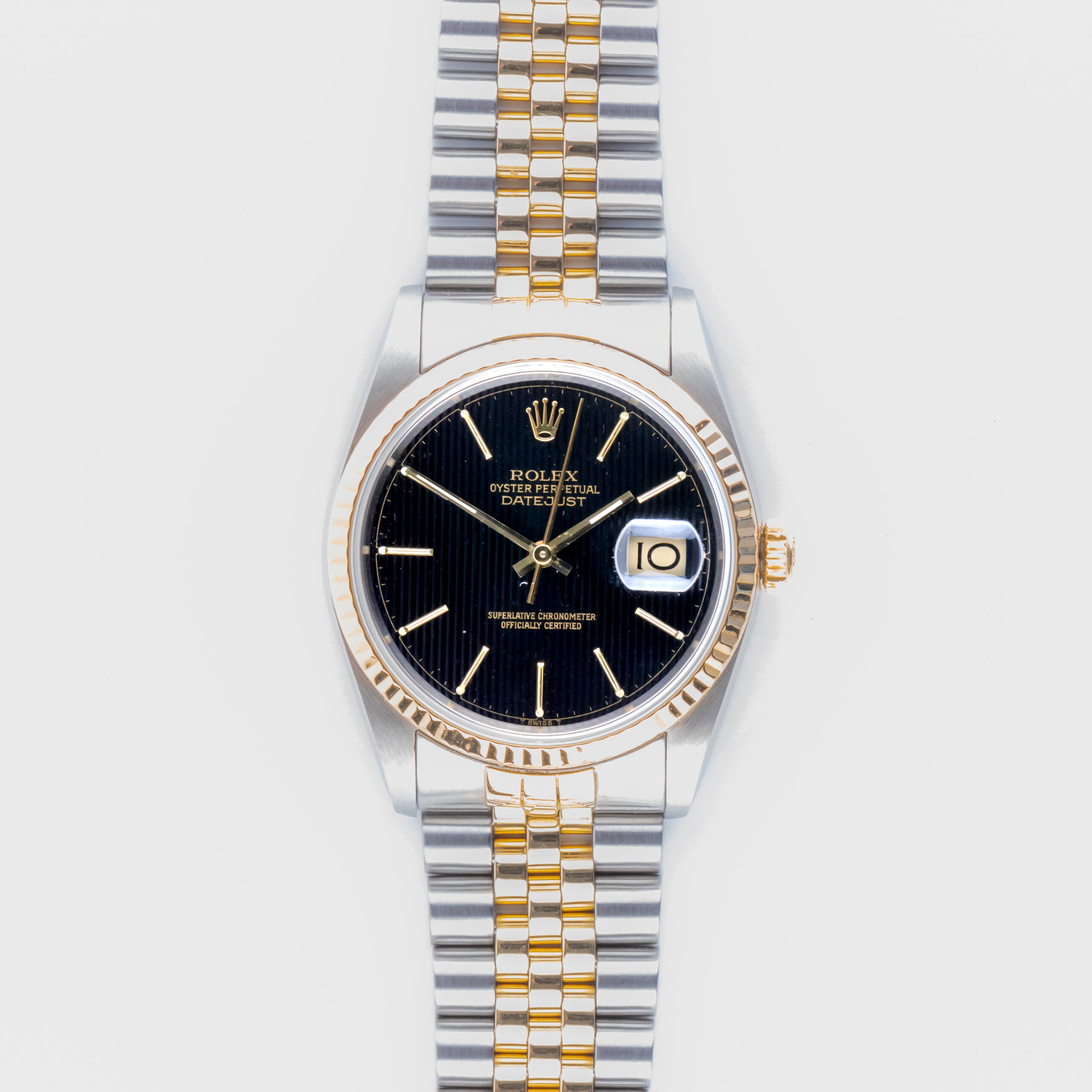 Rolex Oyster Perpetual Datejust reference 16233 from 1988 including full set. The Datejust 16233 measures a 36mm gold and stainless steel case, two-tone Jubilee bracelet and fluted 18k gold bezel. This Datejust 16233 features an automatic movement caliber 3135 with a quickset date function, a scratch resistance sapphire crystal and a black tapestry dial.