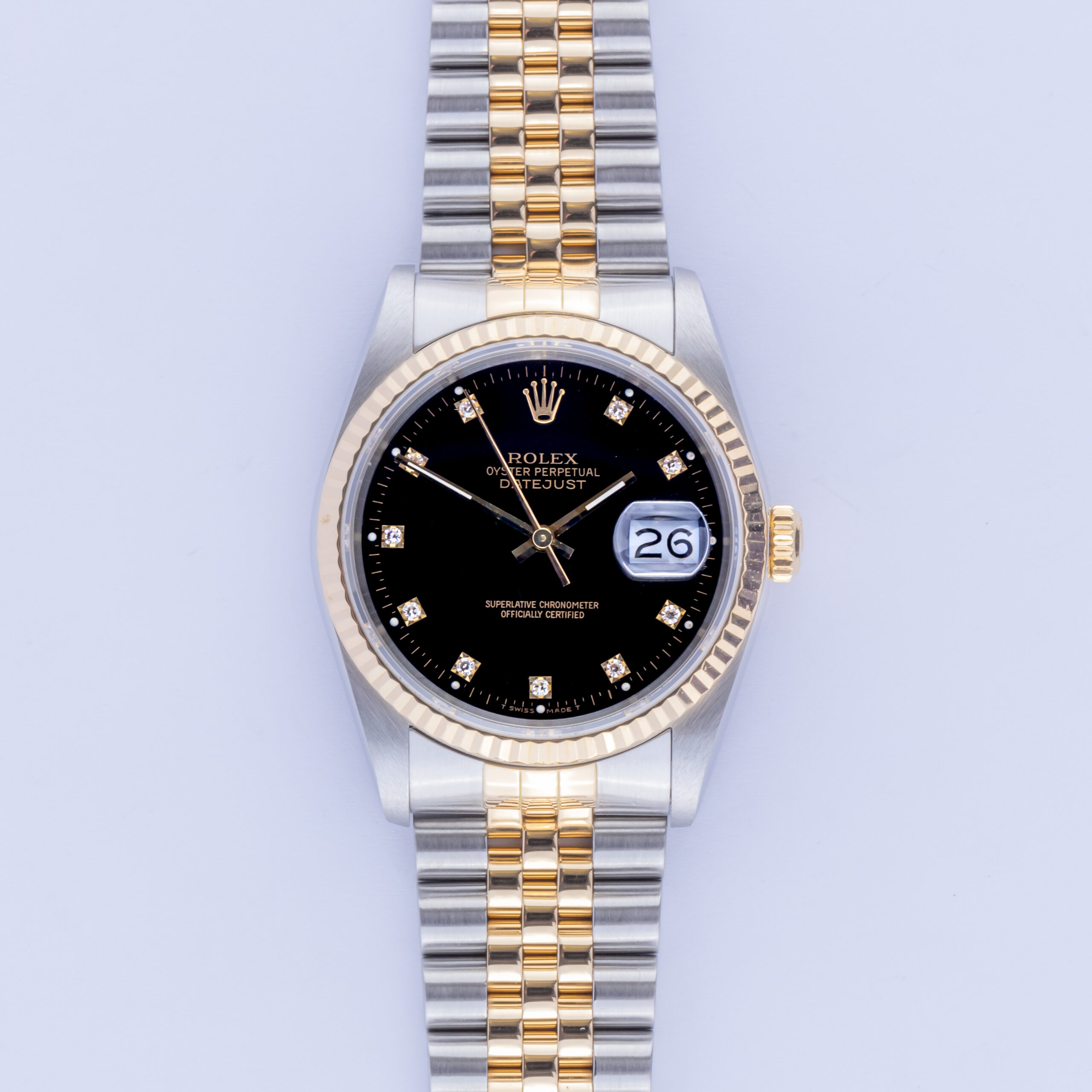 Rolex Oyster Perpetual Datejust reference 16233 from 1988. The Datejust 16233 measures a 36mm gold and stainless steel case, two-tone Jubilee bracelet and fluted 18k gold bezel. This Datejust 16233 features an automatic movement caliber 3135 with a quickset date function, a scratch resistance sapphire crystal and a black dial with tritium hands and diamond markers.