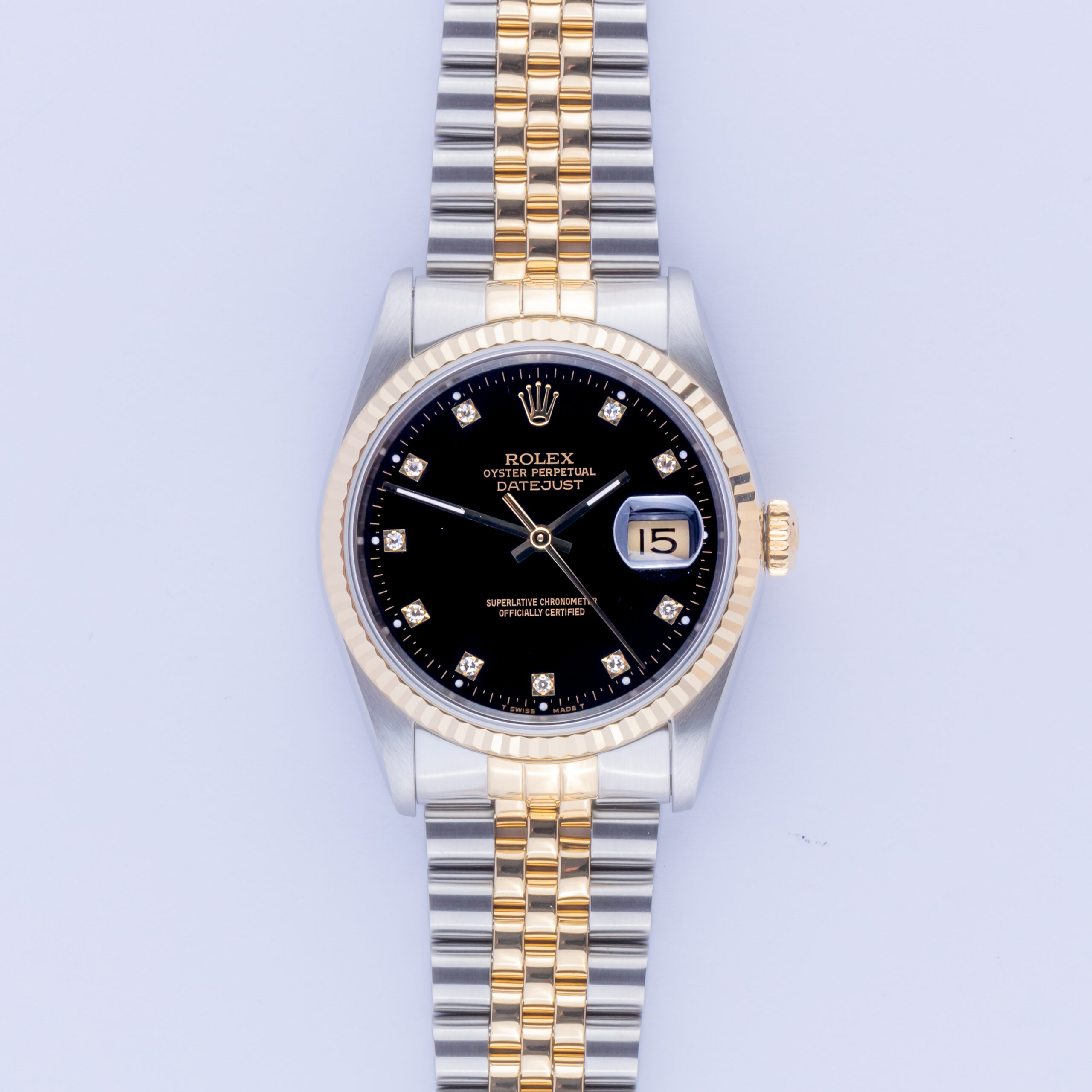 Rolex Oyster Perpetual Datejust reference 16233 from 1991 including full set. The Datejust 16233 measures a 36mm gold and stainless steel case, two-tone Jubilee bracelet and fluted 18k gold bezel. This Datejust 16233 features an automatic movement caliber 3135 with a quickset date function, a scratch resistance sapphire crystal and a black dial with tritium hands and diamond markers.
