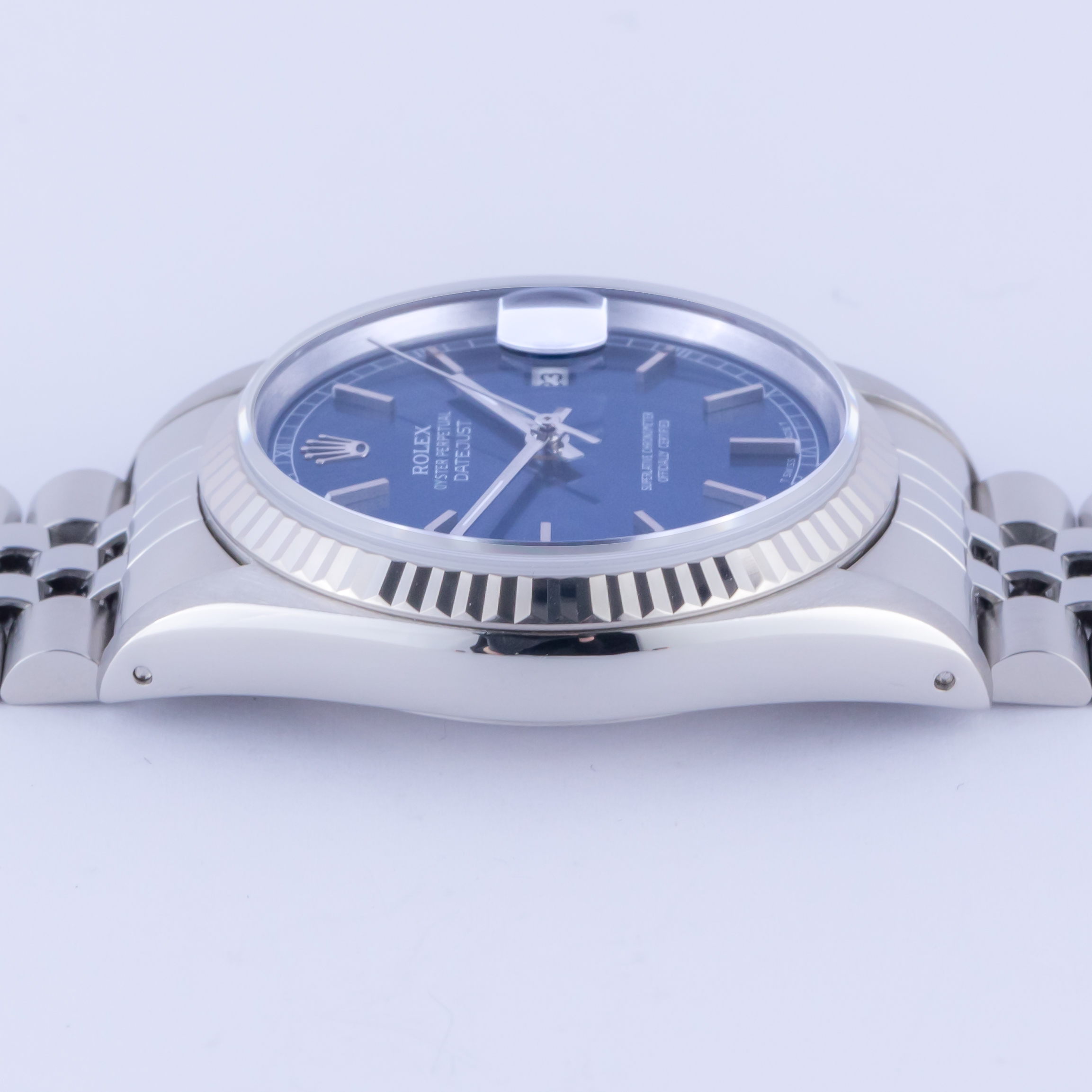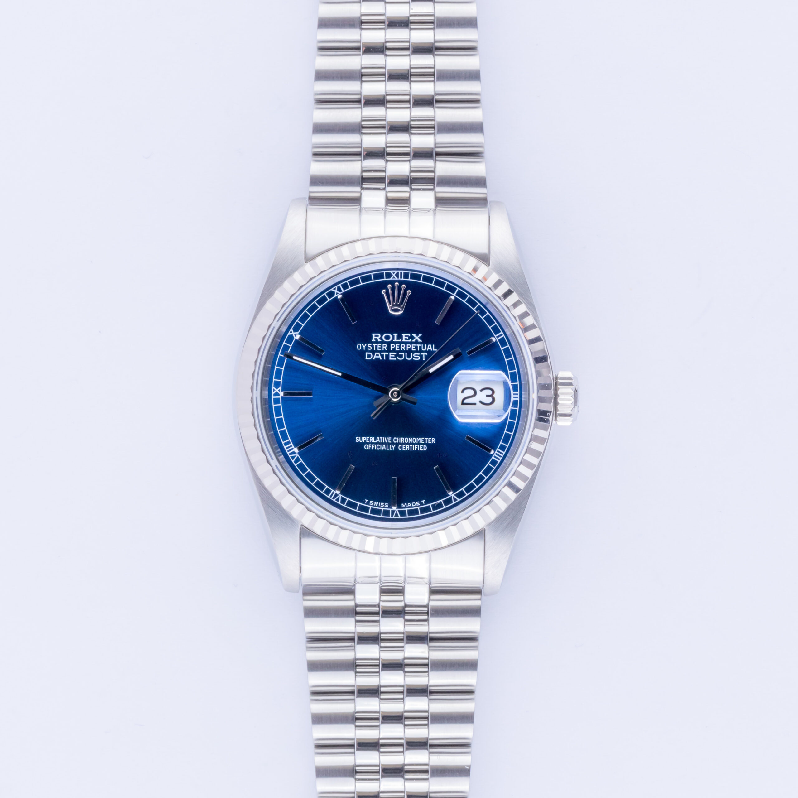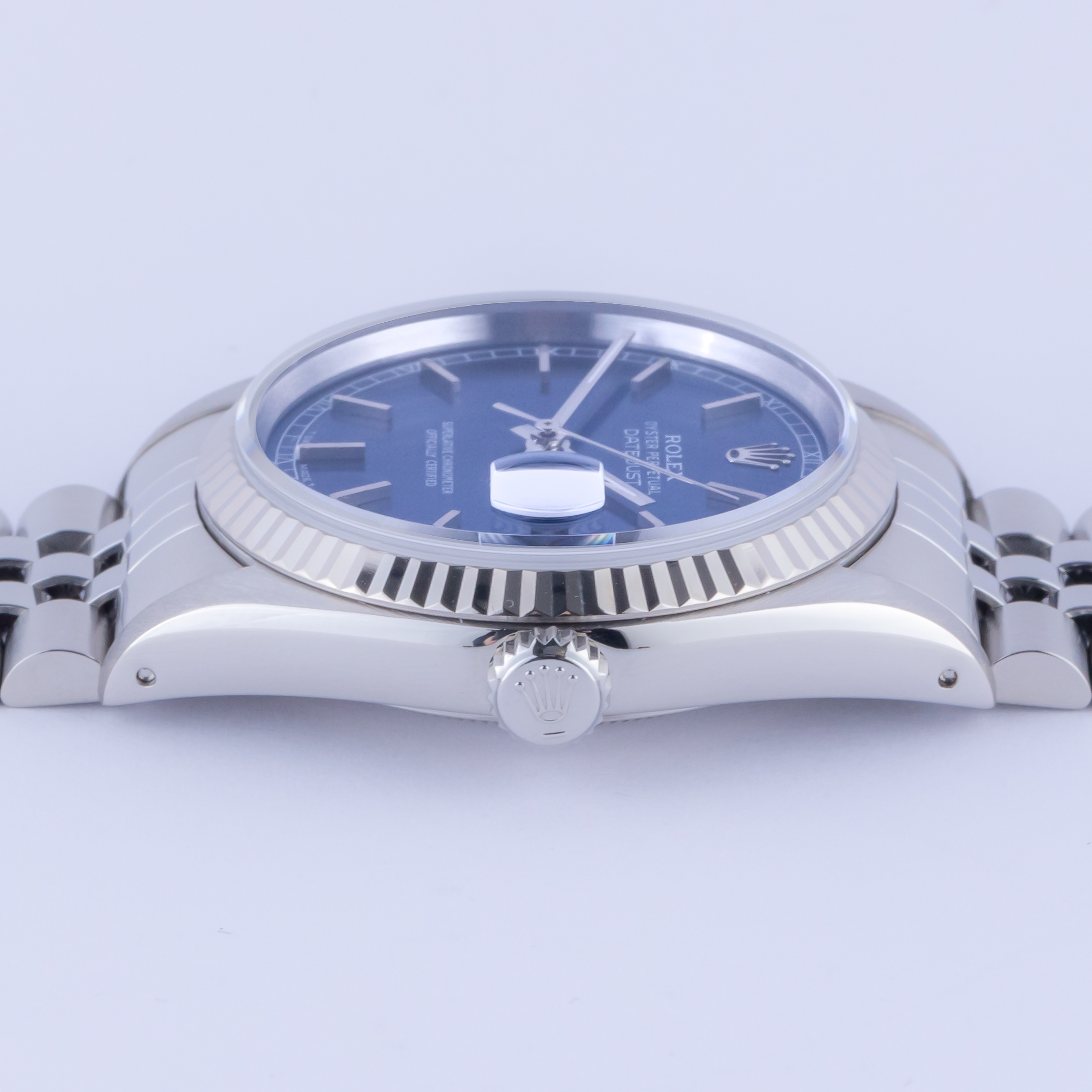 Rolex Oyster Perpetual Datejust reference 16234 from 1991 including full set. The Datejust 16234 Datejust measures a 36mm stainless steel case, a stainless steel Jubilee bracelet and a fluted 18k white gold bezel. This Datejust 16234 features an automatic movement caliber 3135 with quickset date function, a scratch resistance sapphire crystal and a blue stick dial with roman minute track.
