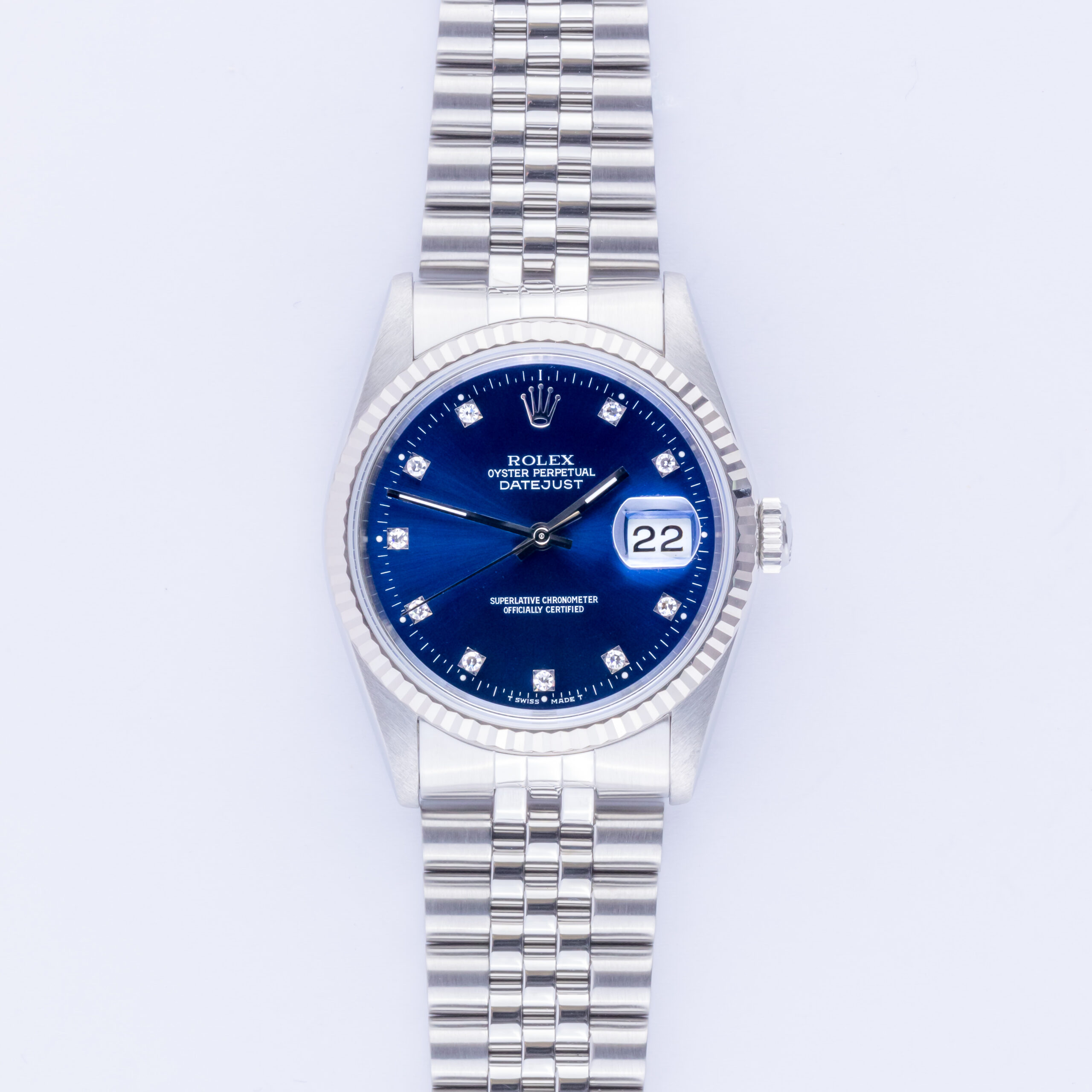 Rolex Oyster Perpetual Datejust reference 16234 from 1991 including full set. The Datejust 16234 Datejust measures a 36mm stainless steel case, a stainless steel Jubilee bracelet and a fluted 18k white gold bezel. This Datejust 16234 features an automatic movement caliber 3135 with quickset date function, a scratch resistance sapphire crystal and a blue dial with diamond markers.