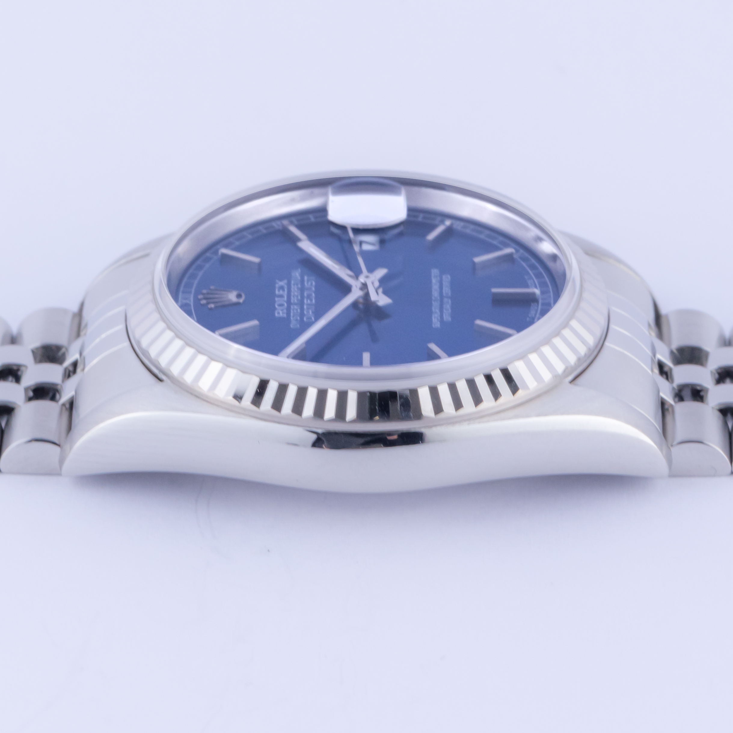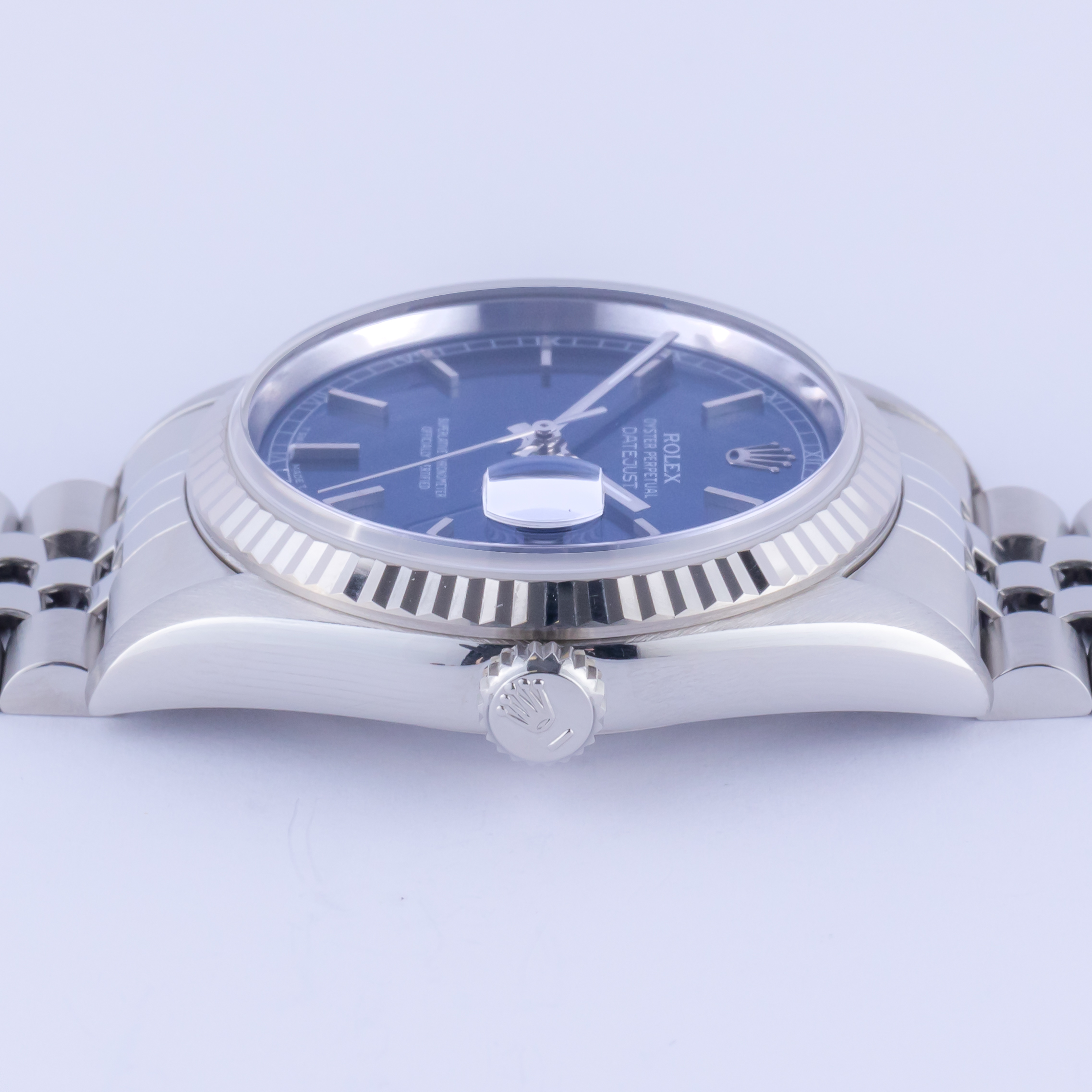 Rolex Oyster Perpetual Datejust reference 16234 from 1995 including full set. The Datejust 16234 Datejust measures a 36mm stainless steel case, a stainless steel Jubilee bracelet and a fluted 18k white gold bezel. This Datejust 16234 features an automatic movement caliber 3135 with quickset date function, a scratch resistance sapphire crystal and a blue dial.