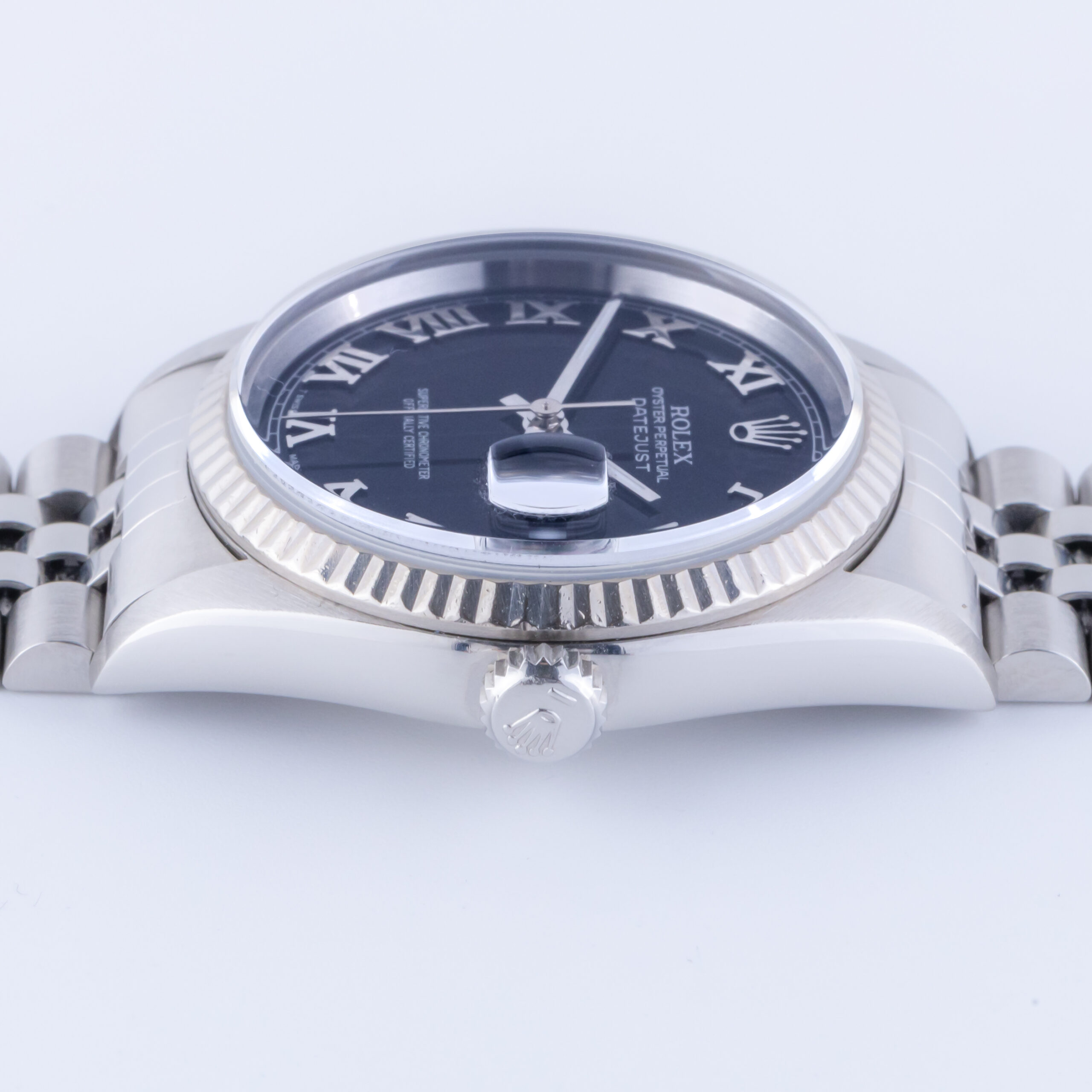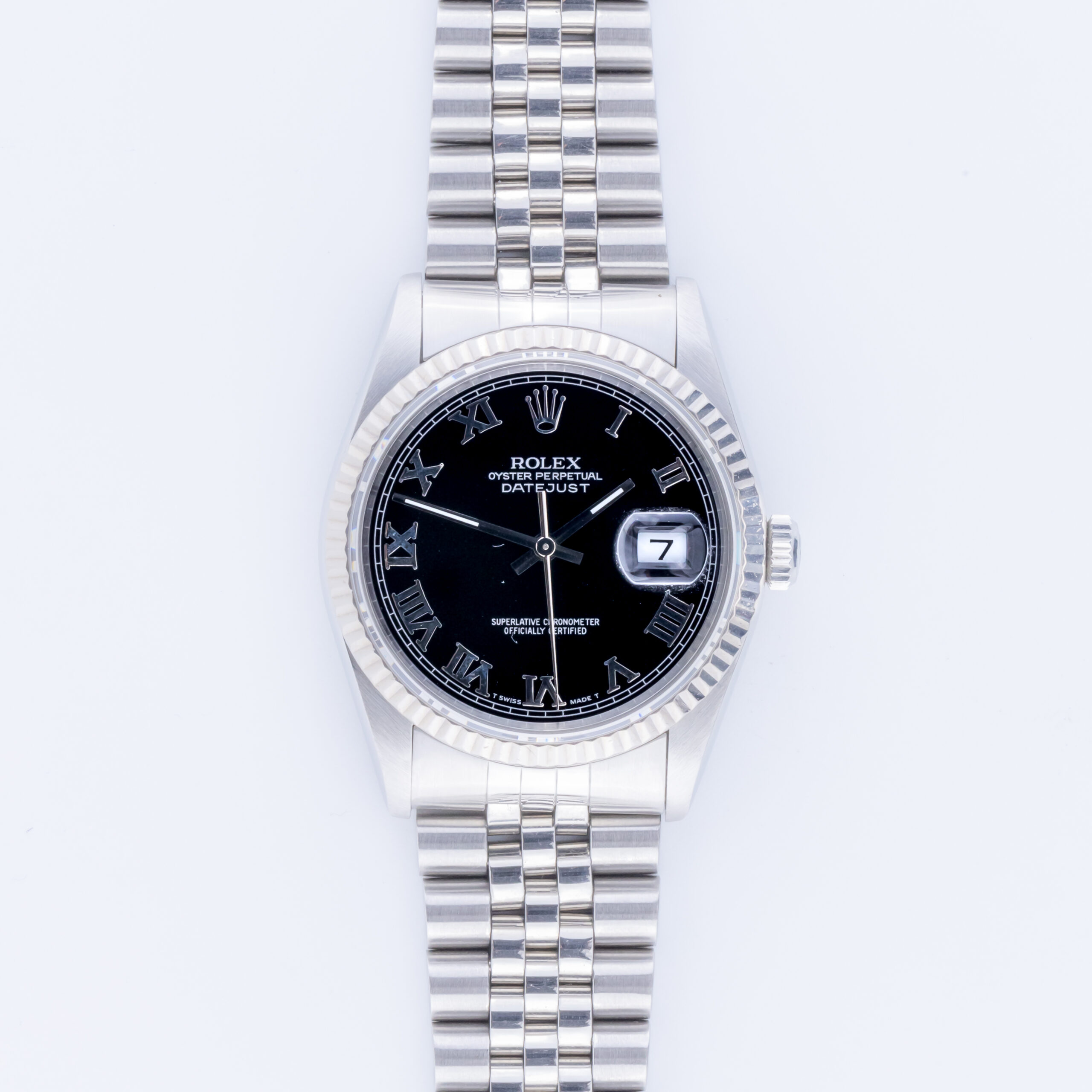 Rolex Oyster Perpetual Datejust reference 16234 from 1996. The Datejust 16234 Datejust measures a 36mm stainless steel case, a stainless steel Jubilee bracelet and a fluted 18k white gold bezel. This Datejust 16234 features an automatic movement caliber 3135 with quickset date function, a scratch resistance sapphire crystal and a black dial with Roman markers.