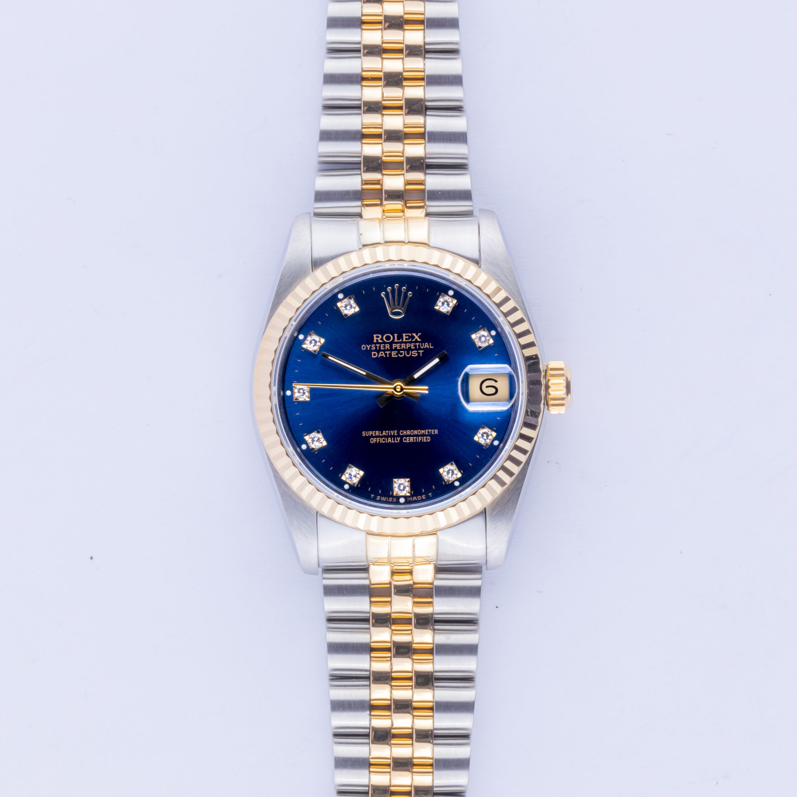 Rolex Oyster Perpetual Datejust Mid-Size reference 68273 from 1994 including full set. The Datejust 68273 measures a 31mm gold/stainless steel case, a gold/stainless steel Jubilee bracelet and a fluted 18k gold bezel. This Datejust 68273 features an automatic movement caliber 3135 with quickset date function, a scratch resistance sapphire crystal and a blue dial with tritium hands and diamond markers.
