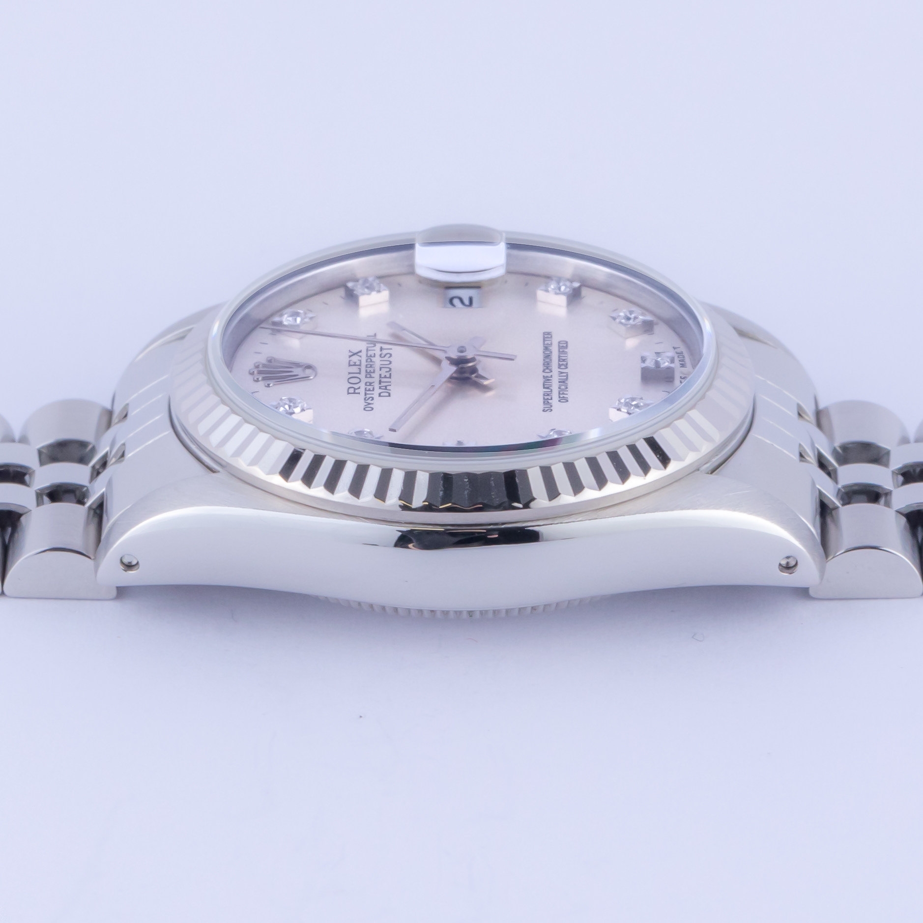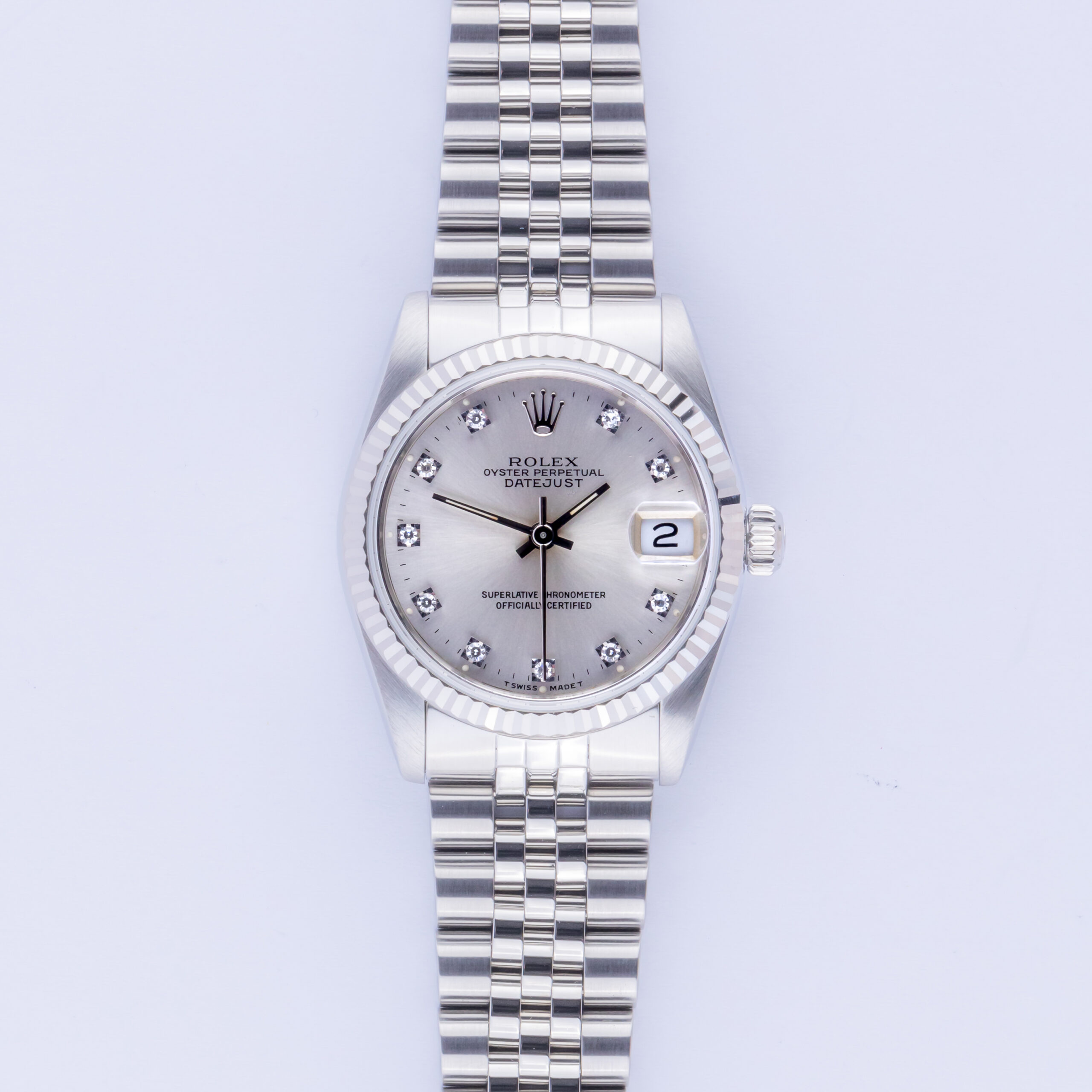 Rolex Oyster Perpetual Datejust Mid-Size reference 68274 from 1990 including full set. The Datejust 68274 measures a 31mm stainless steel case, a stainless steel Jubilee bracelet and a fluted 18k white gold bezel. This Datejust 68274 features an automatic movement caliber 3135 with quickset date function, a scratch resistance sapphire crystal and a silver dial with tritium hands and diamond markers.