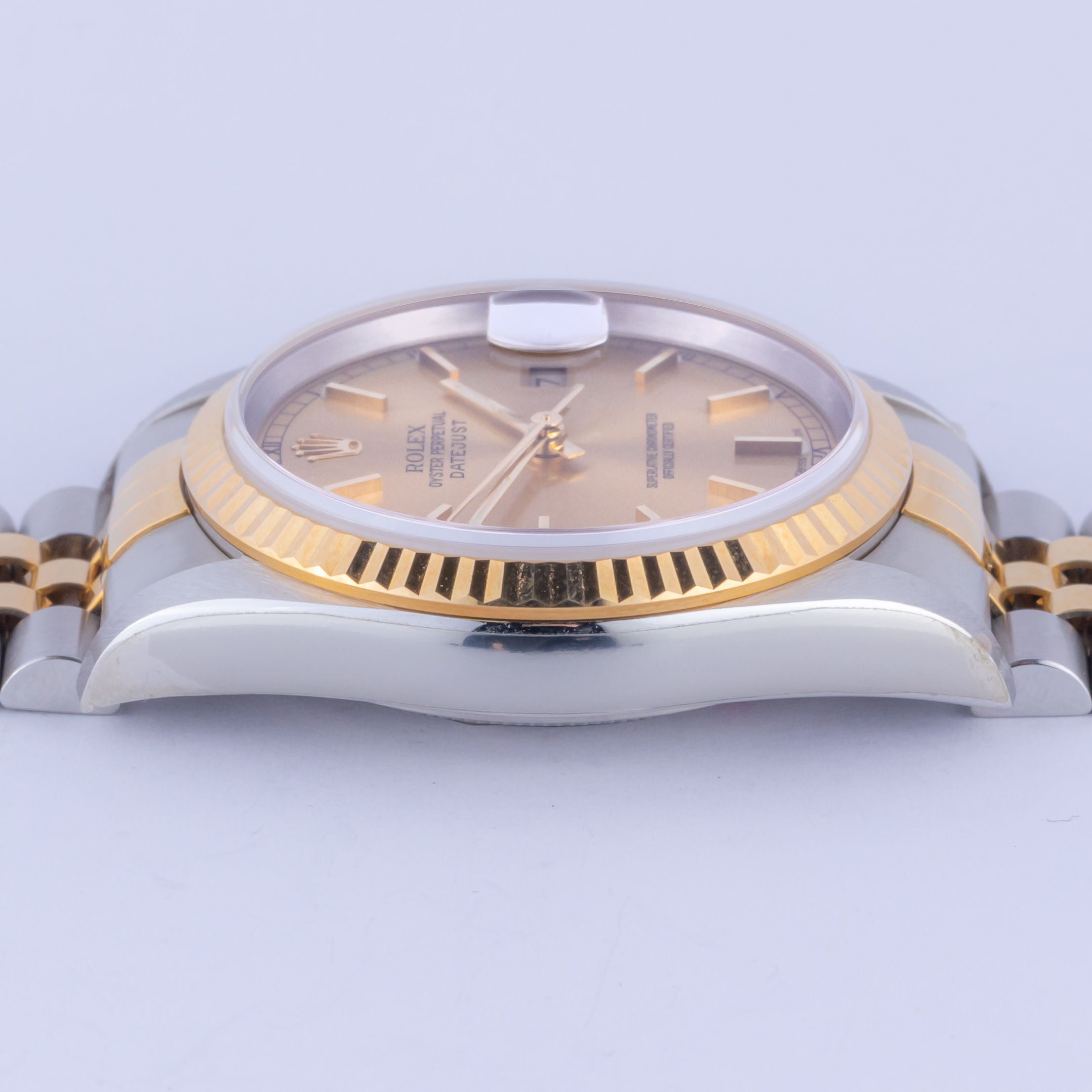Rolex Oyster Perpetual Datejust reference 16233 from 2000 including full set. The Datejust 16233 measures a 36mm gold and stainless steel case, two-tone Jubilee bracelet and fluted 18k gold bezel. This Datejust 16233 features an automatic movement caliber 3135 with a quickset date function, a scratch resistance sapphire crystal and a champagne dial.