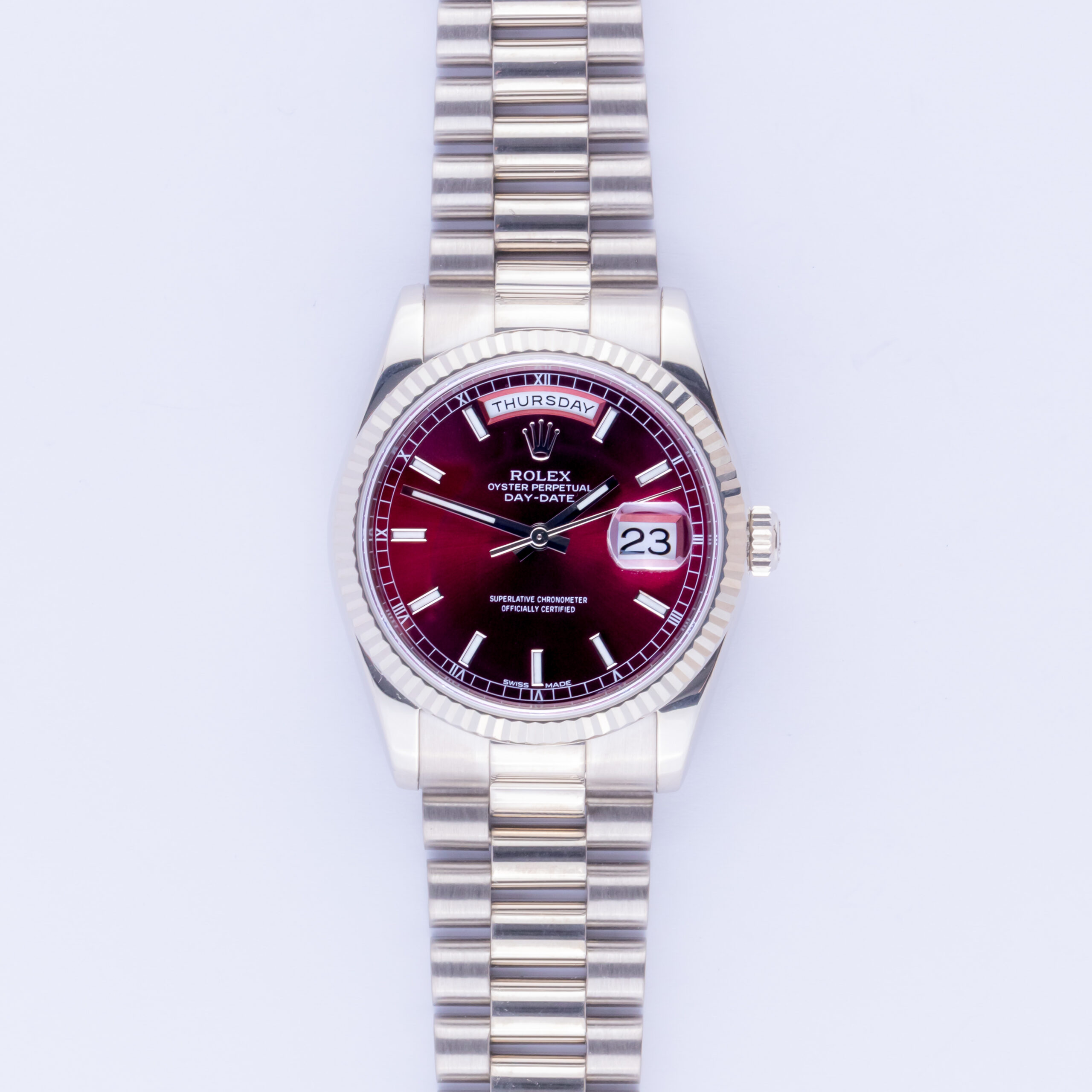 Rolex Oyster Perpetual Day-Date Reference 118239 from 2000 including full set. The Day-Date 118239 measures a 36mm 18k whitegold case, a 18k whitegold president bracelet with Crownclasp and fluted 18k whitegold bezel. This Day-Date 118239 features an automatic movement caliber 3255 with a double quickset date and day function, a scratch resistance sapphire crystal, and a cherry dial with luminova.