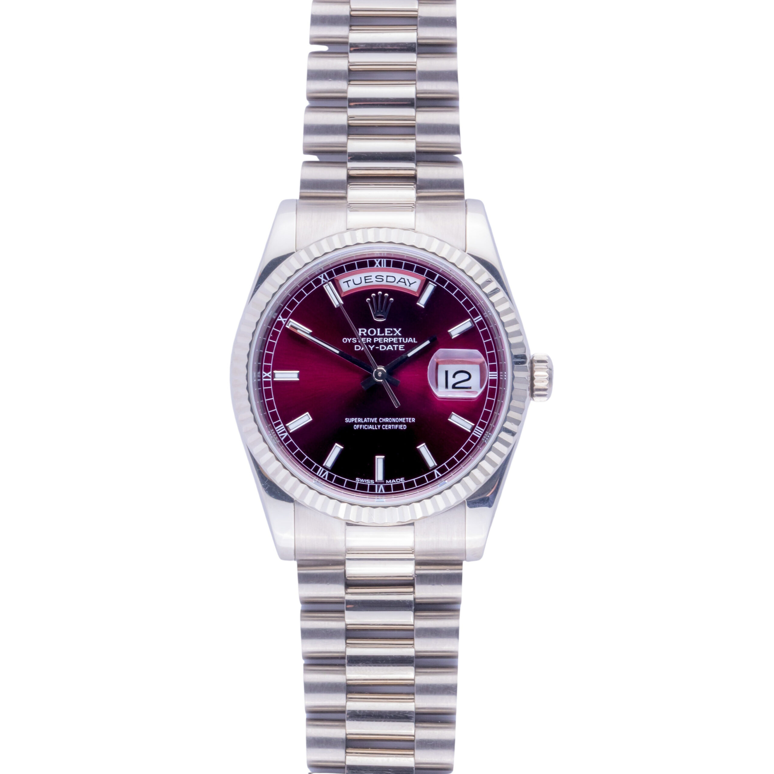 Rolex Oyster Perpetual Day-Date Reference 118239 from 2000 including full set. The Day-Date 118239 measures a 36mm 18k whitegold case, a 18k whitegold president bracelet with Crownclasp and fluted 18k whitegold bezel. This Day-Date 118239 features an automatic movement caliber 3255 with a double quickset date and day function, a scratch resistance sapphire crystal, and a cherry dial with luminova.