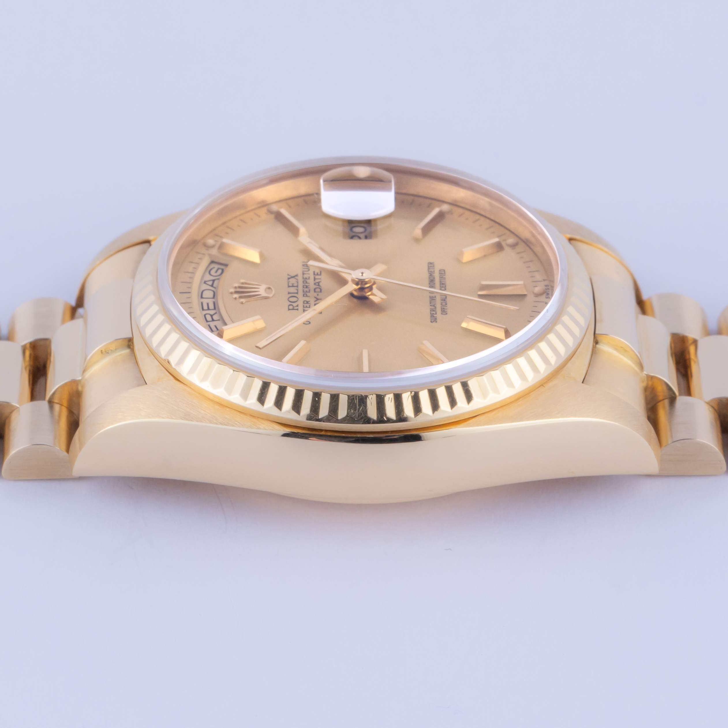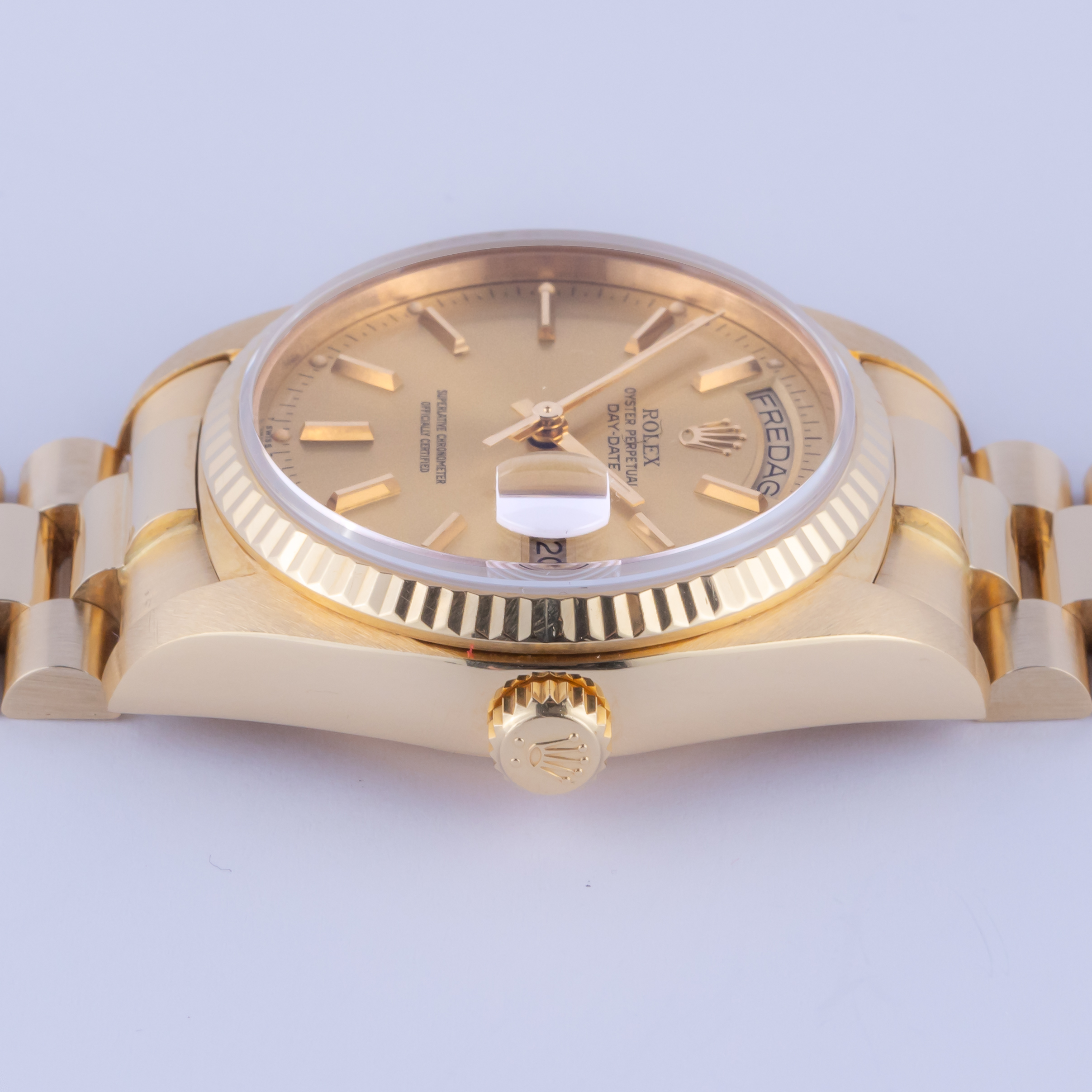 Rolex Oyster Perpetual Day-Date Reference 18038 from 1983. The Day-Date 18038 measures a 36mm 18k gold case, a 18k gold president bracelet with Crownclasp and fluted 18k gold bezel. The Day-Date 18038 features an automatic movement caliber 3055 with a quickset date and day function, a scratch resistance sapphire crystal and a champagne stick dial with tritium hands.
