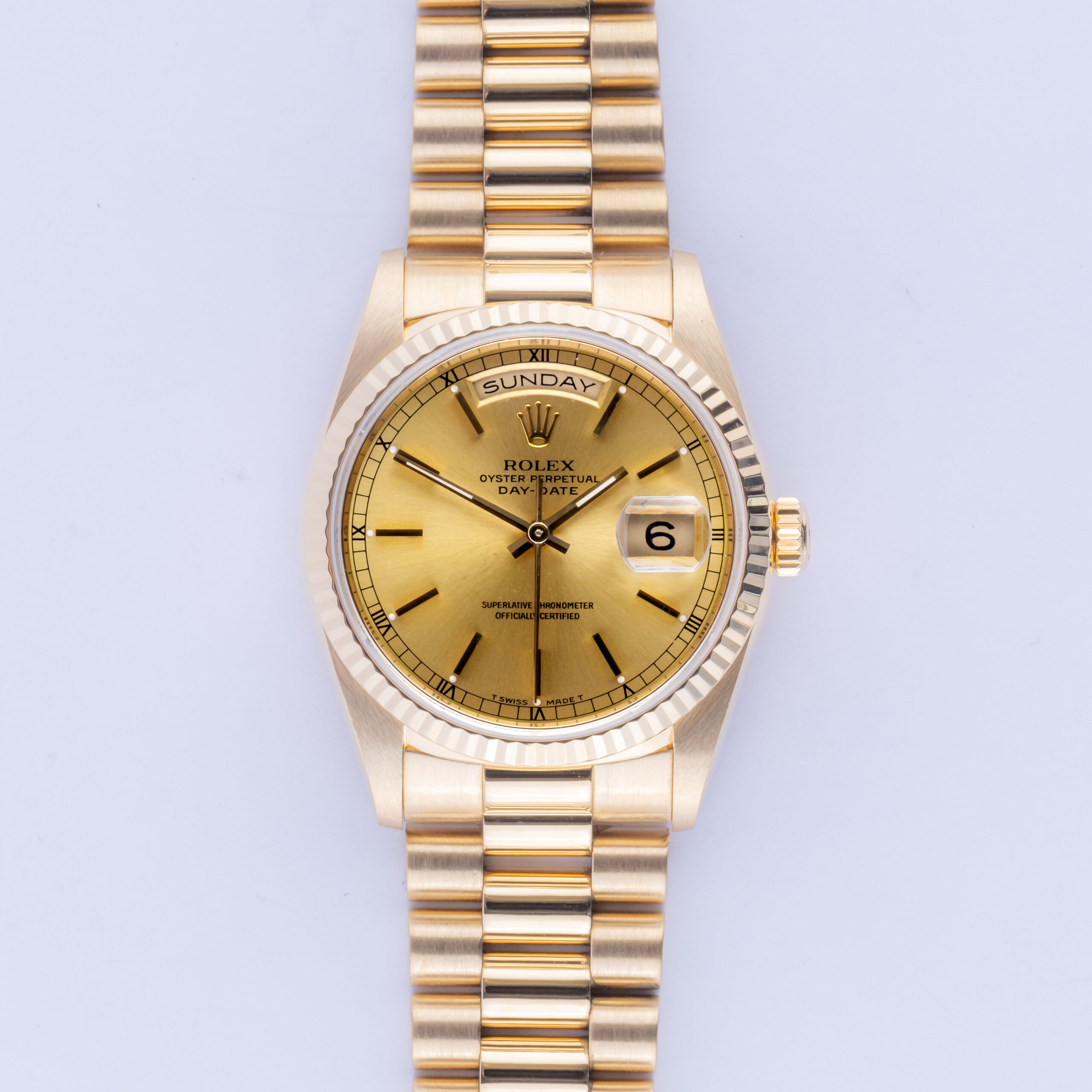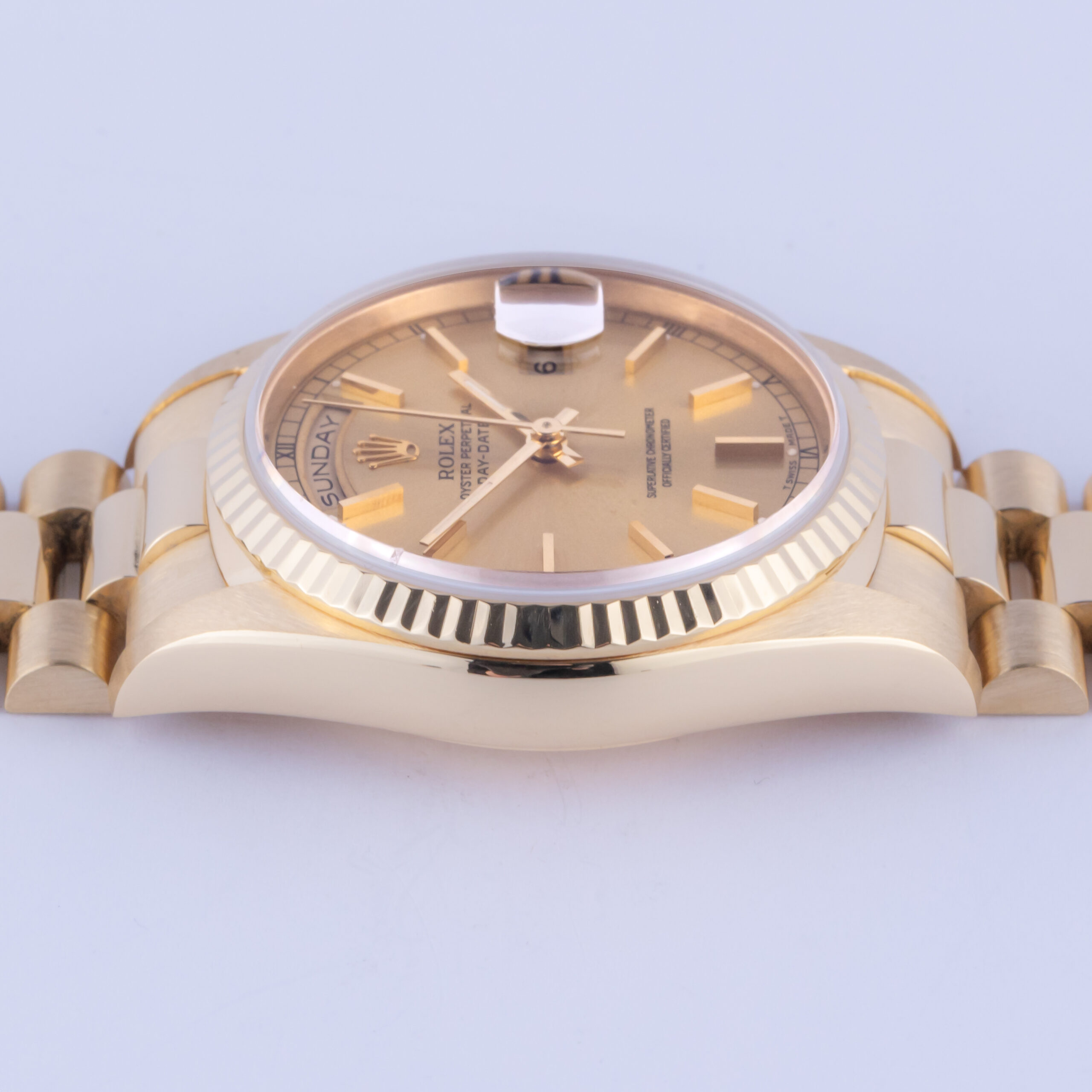 Rolex Oyster Perpetual Day-Date Champagne Reference 18238 from 1990 including box. The Day-Date 18238 measures a 36mm 18k gold case, a 18k gold president bracelet with Crownclasp and fluted 18k gold bezel. The Day-Date 18238 features an automatic movement caliber 3155 with a double quickset date and day function, a scratch resistance sapphire crystal and a champagne stick dial.