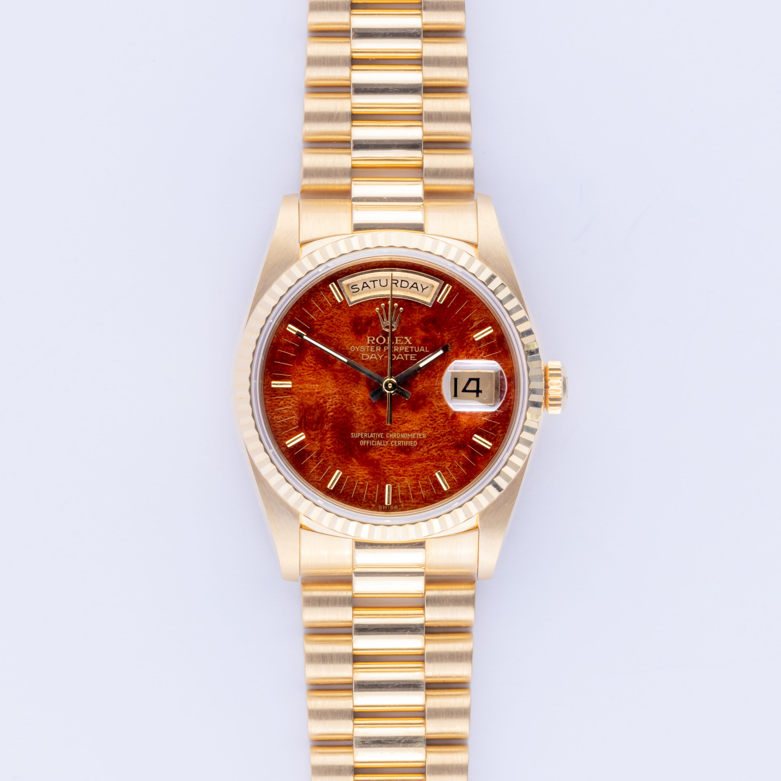 Rolex Day-Date Reference 18238 from 1990. The Day-Date 18238 measures a 36mm 18k gold case, a 18k gold president bracelet with Crownclasp and 18k gold fluted bezel. The Day-Date 18238 features an automatic movement caliber 3155 with a double quickset date and day function, a scratch resistance sapphire crystal and a wooden dial with tritium hands.