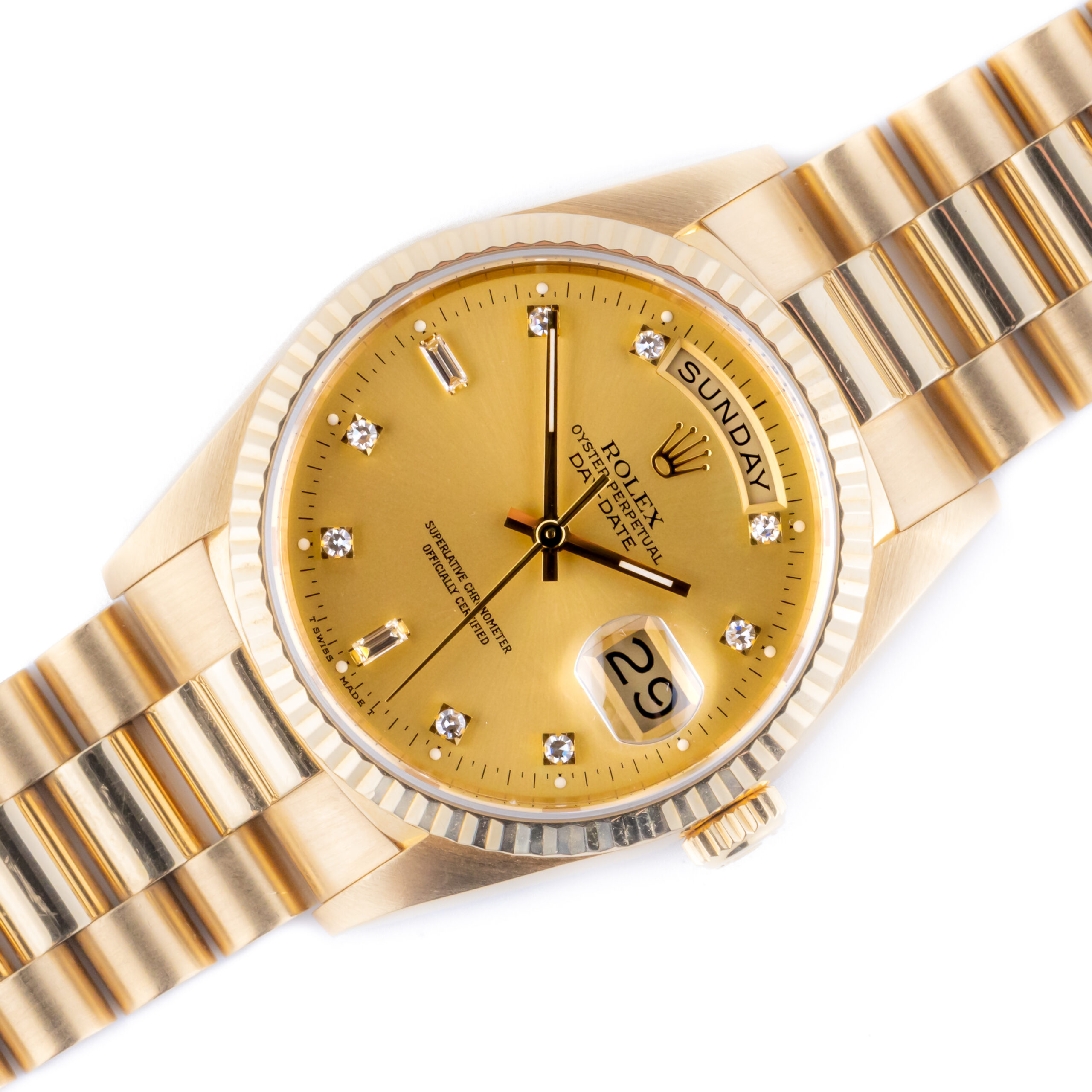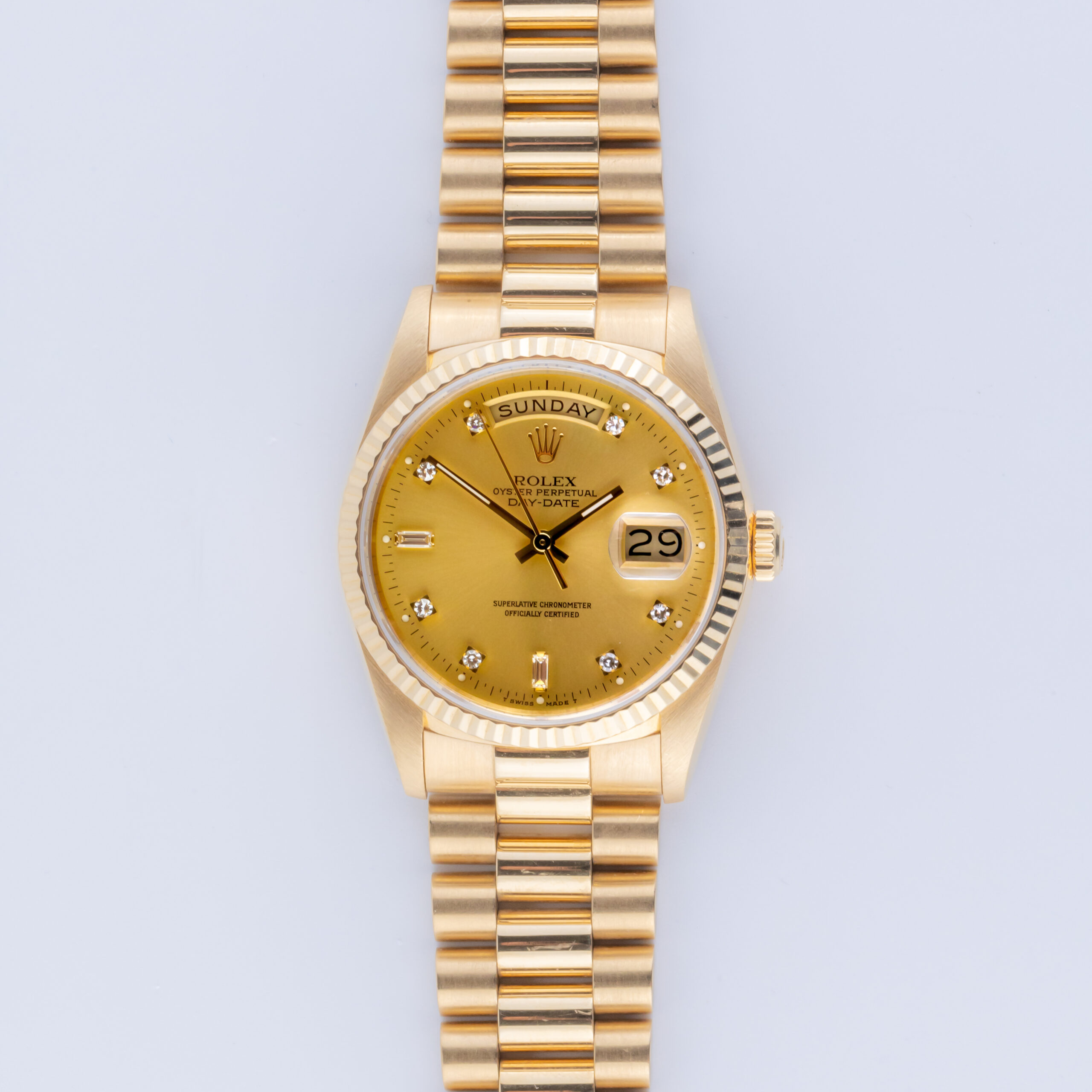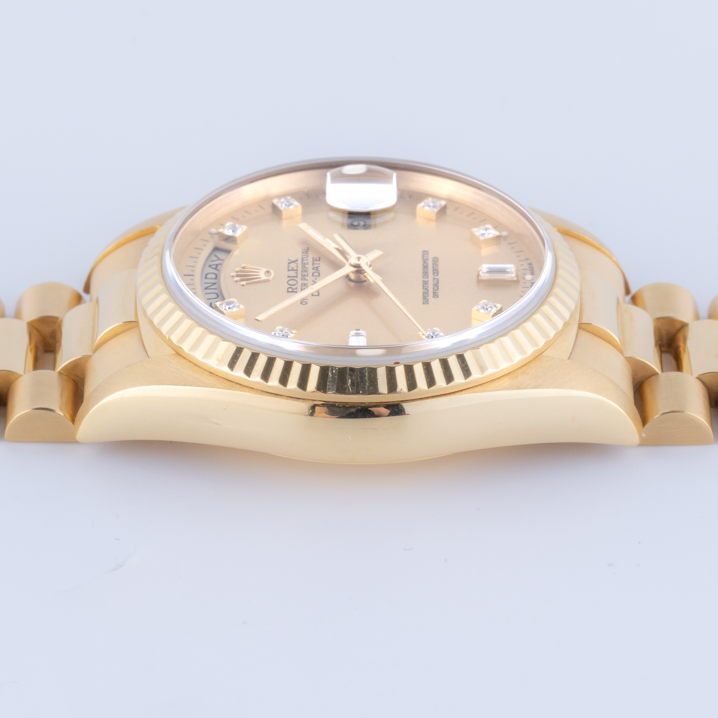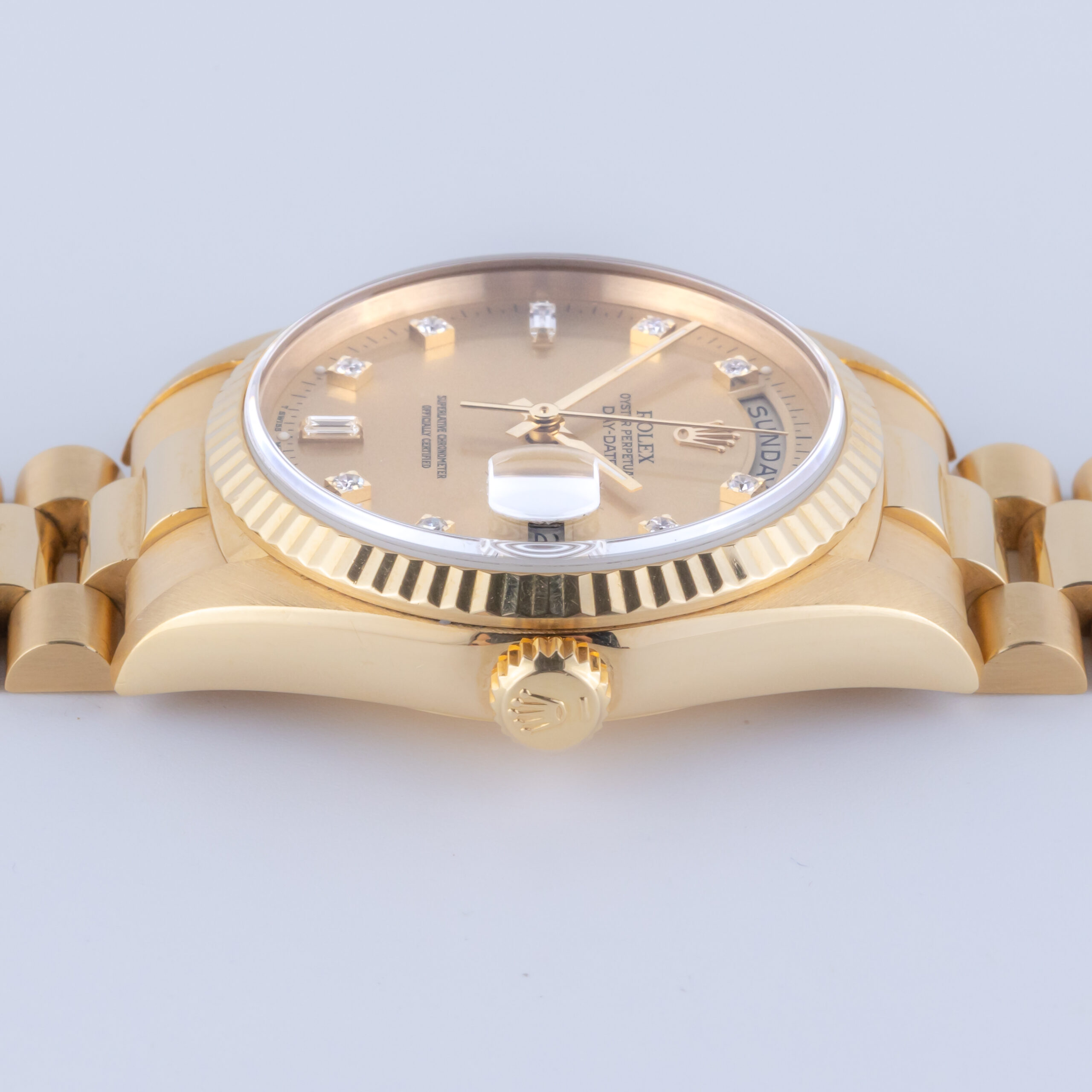 Rolex Oyster Perpetual Day-Date Reference 18238 from 1989 including full set. The Day-Date 18238 measures a 36mm 18k gold case, a 18k gold president bracelet with Crownclasp and fluted 18k gold bezel. The Day-Date 18238 features an automatic movement caliber 3155 with a double quickset date and day function, a scratch resistance sapphire crystal and a champagne dial with diamond markers.