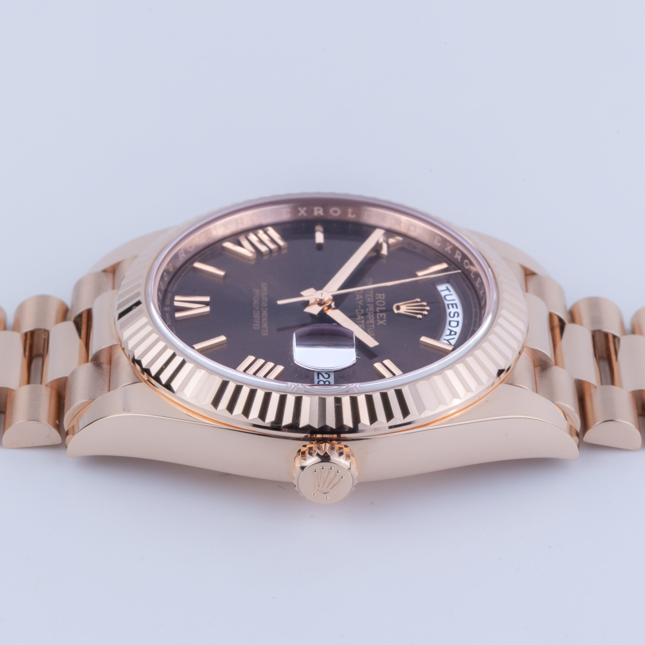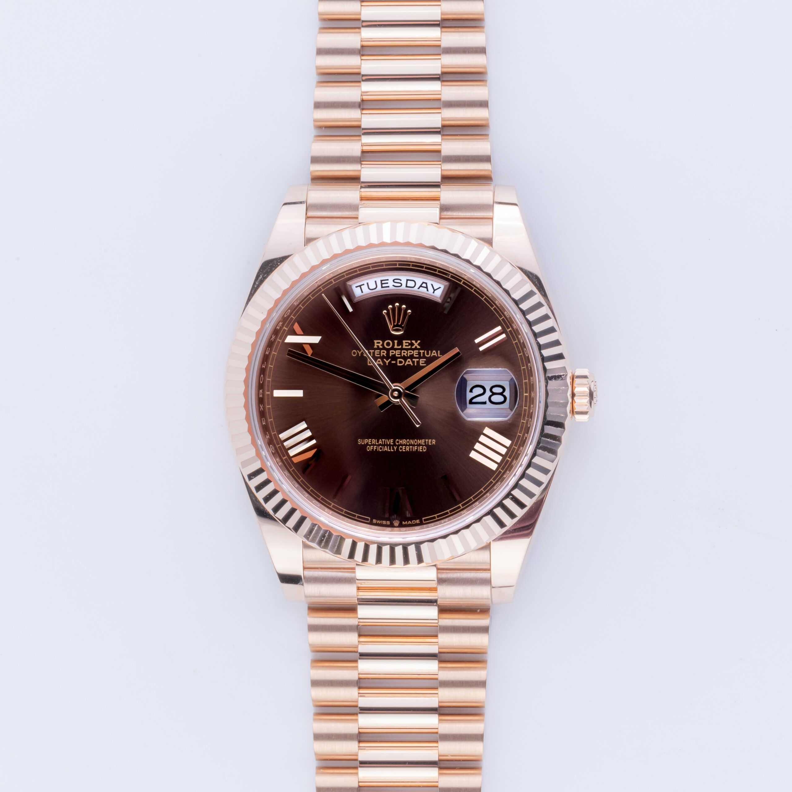 NEW Rolex Day-Date Reference 228235 from 2023 including full set. The Day-Date 228235 measures a 40mm 18k rosegold case, a 18k rosegold President bracelet with Crownclasp and fluted 18k rosegold bezel. The Day-Date 228235 features an automatic movement caliber 3255 with a double quickset date and day function, a scratch resistance sapphire crystal and a chocolate dial.