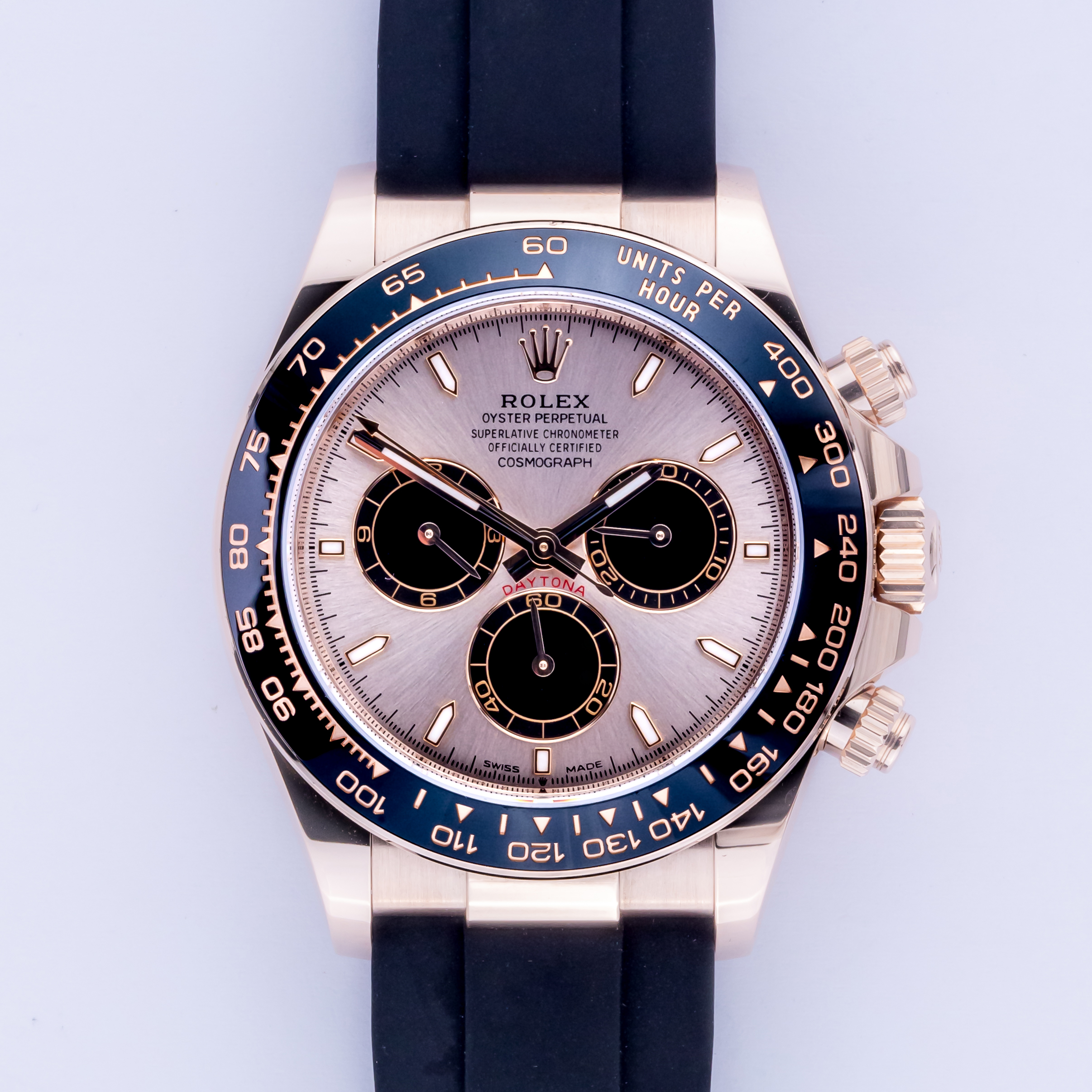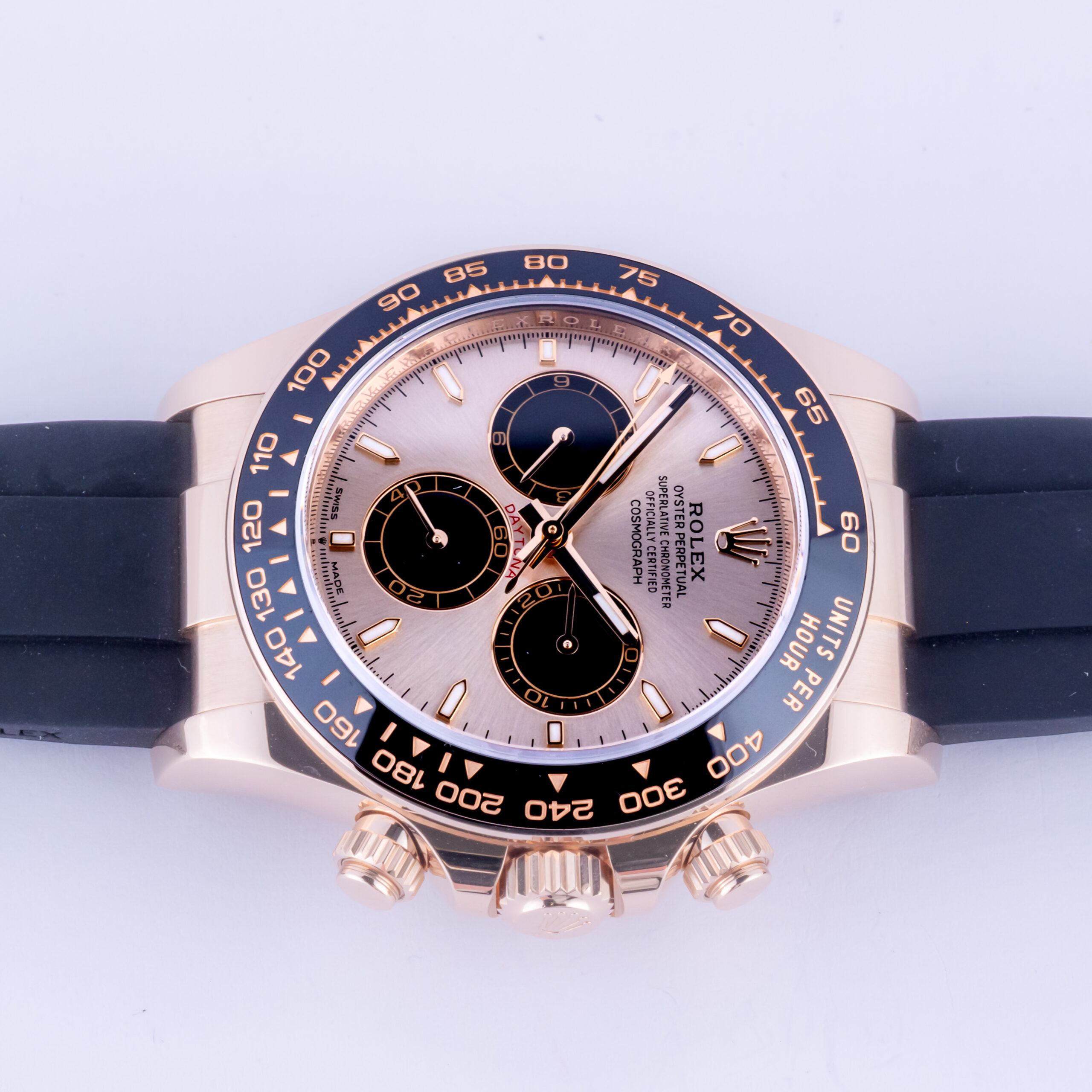 Rolex Daytona reference 126515 from 2023 including full set. The Rolex Daytona reference 126515 measures a 40mm 18k rose gold case, features a black rubber bracelet, ceramic bezel and a black dial with sapphire crystal. The Rolex Daytona 126515 is powered by an in-house Caliber 4131 movement that features a chronograph function, allowing you to time your activities with accuracy and ease.