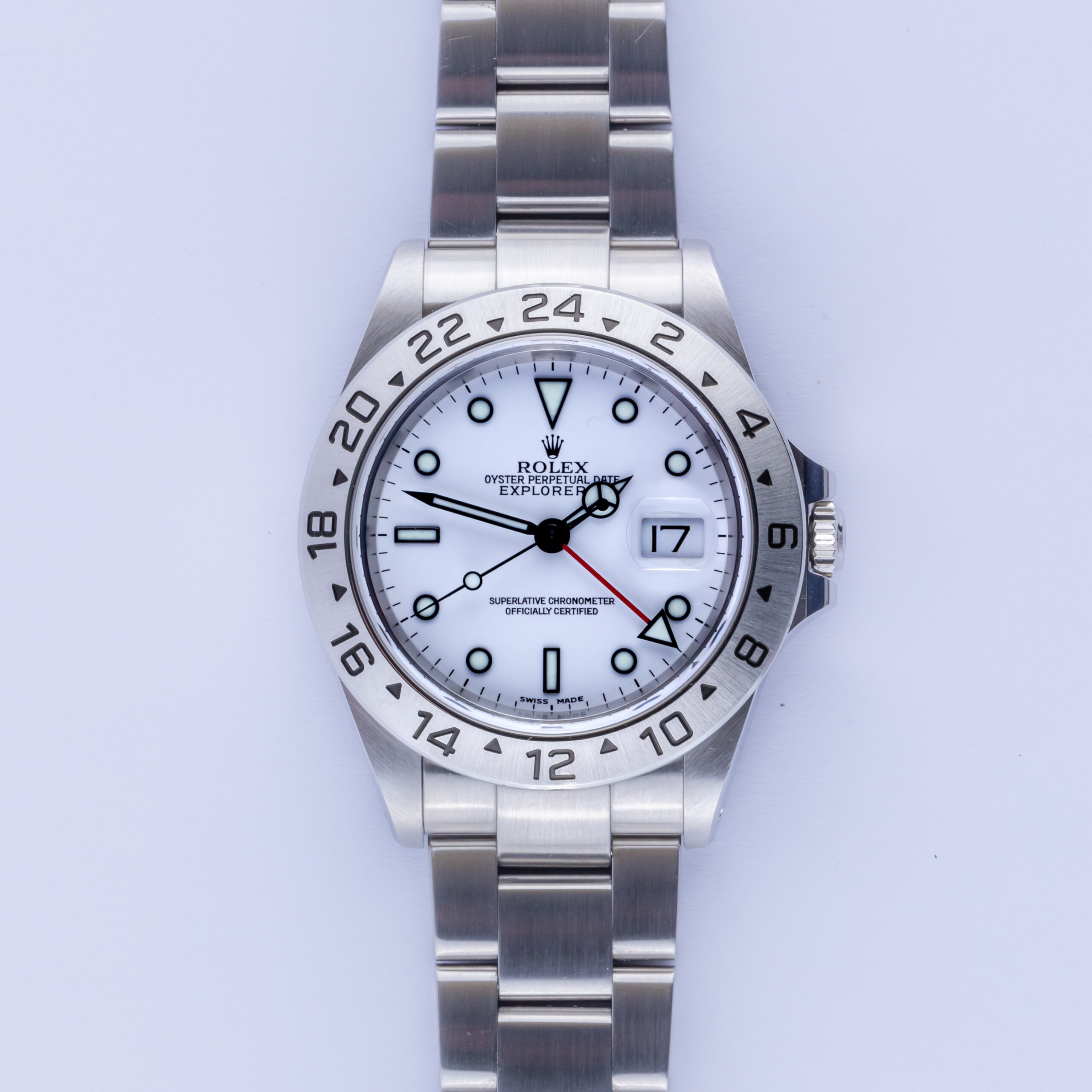 Rolex Oyster Perpetual Explorer II reference 16570 from 2001 including full set. The Explorer II 16570 measures a 40mm stainless steel case, a stainless steel Oyster bracelet with Fliplock clasp and a stainless steel 24h-bezel. The Explorer II 16570 features an automatic movement caliber 3185 with a water resistance sapphire crystal and white dial with superluminova markers and hands.