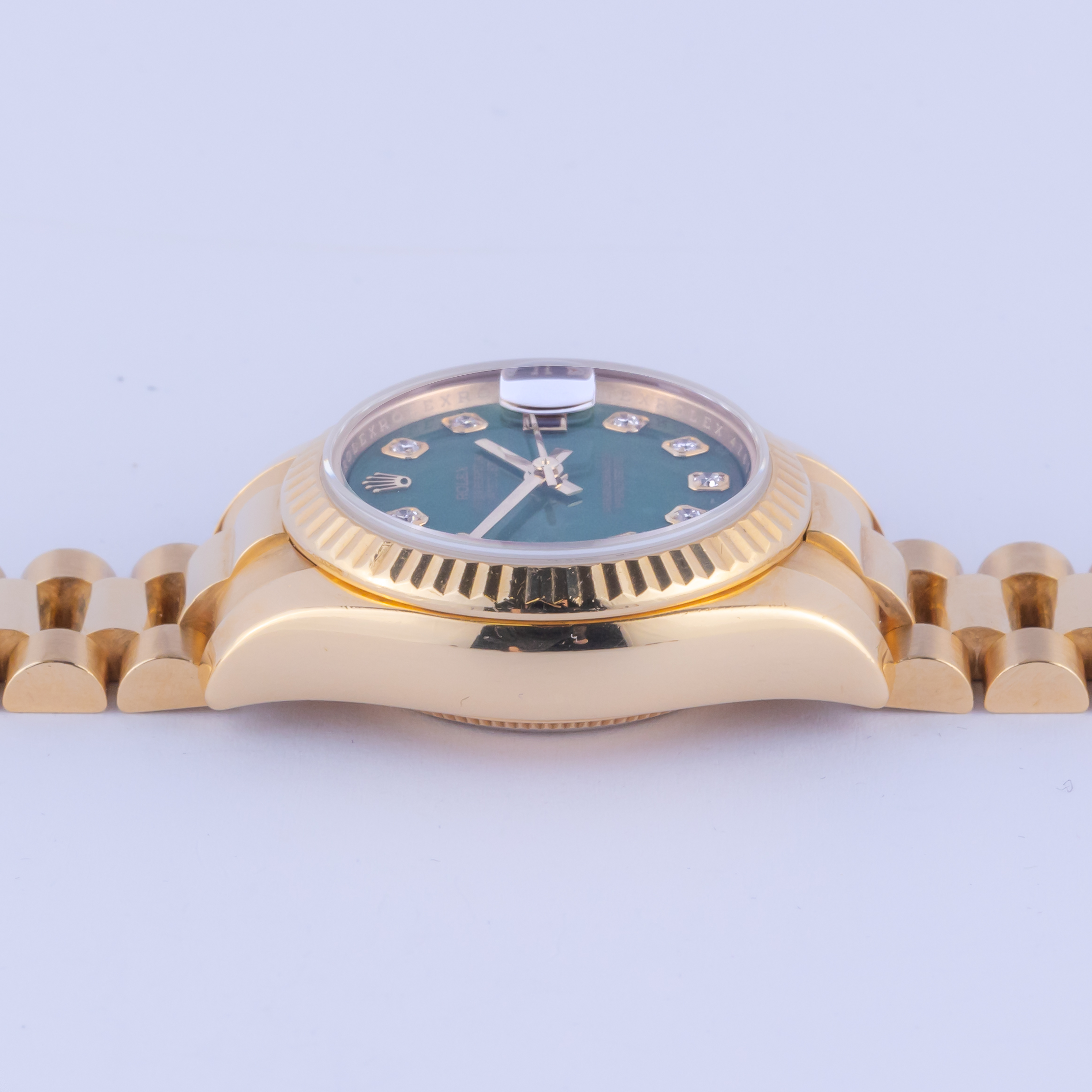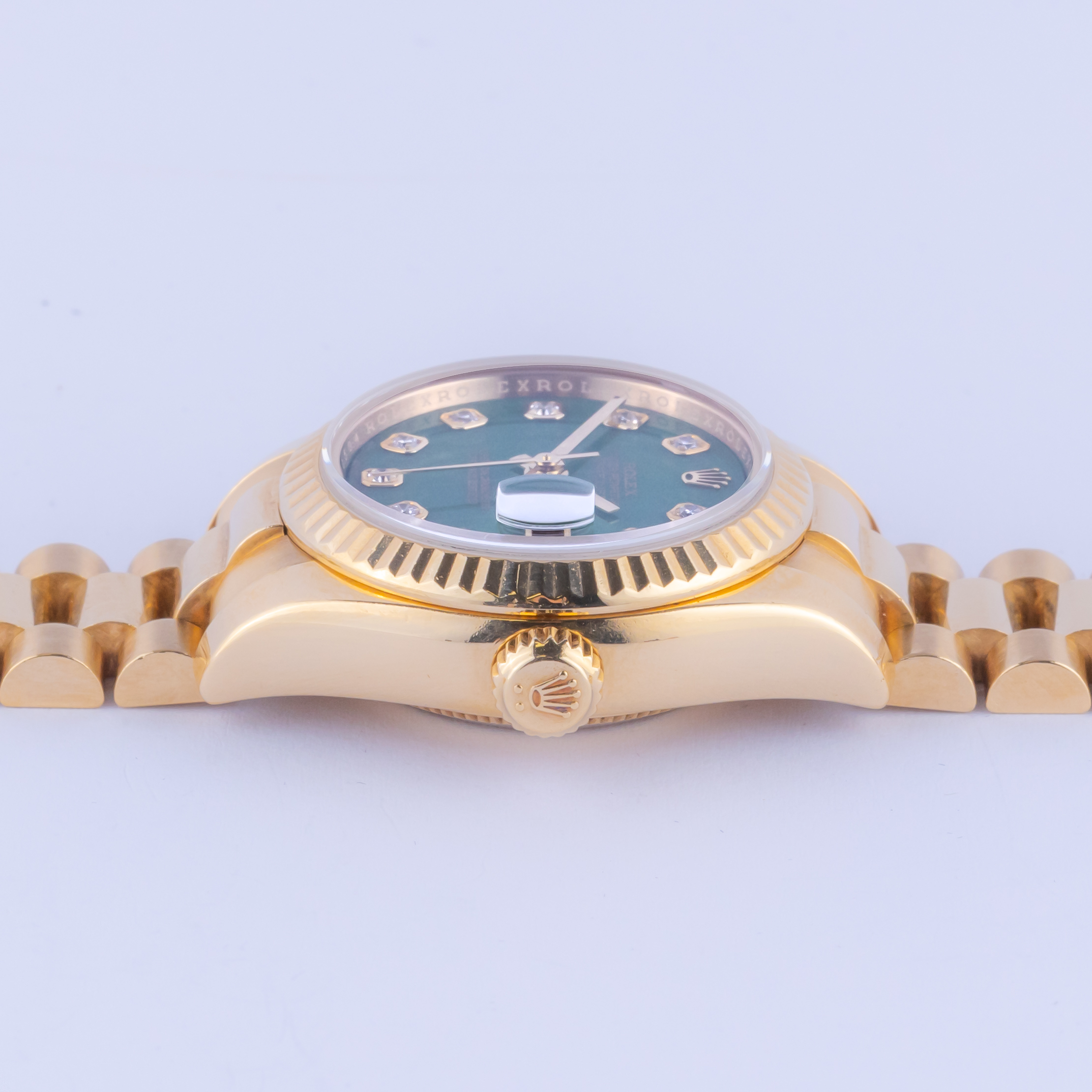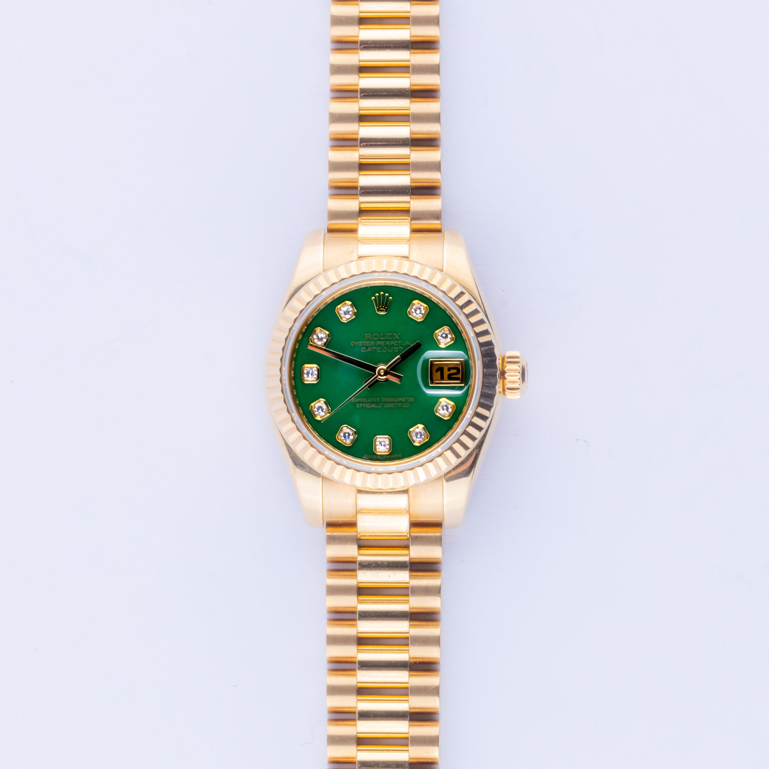 Rolex Oyster Perpetual Lady-Datejust reference 179178 from 2014 including full set. The Lady-Datejust 179178 measures a 26mm yellow gold case, a yellow gold jubilee bracelet with concealed crownclasp, and a fluted 18k yellow gold bezel. This Lady-Datejust 179178 features an automatic movement caliber 2235 with quickset date function, a scratch resistance sapphire crystal and Jade dial with Diamond markers.