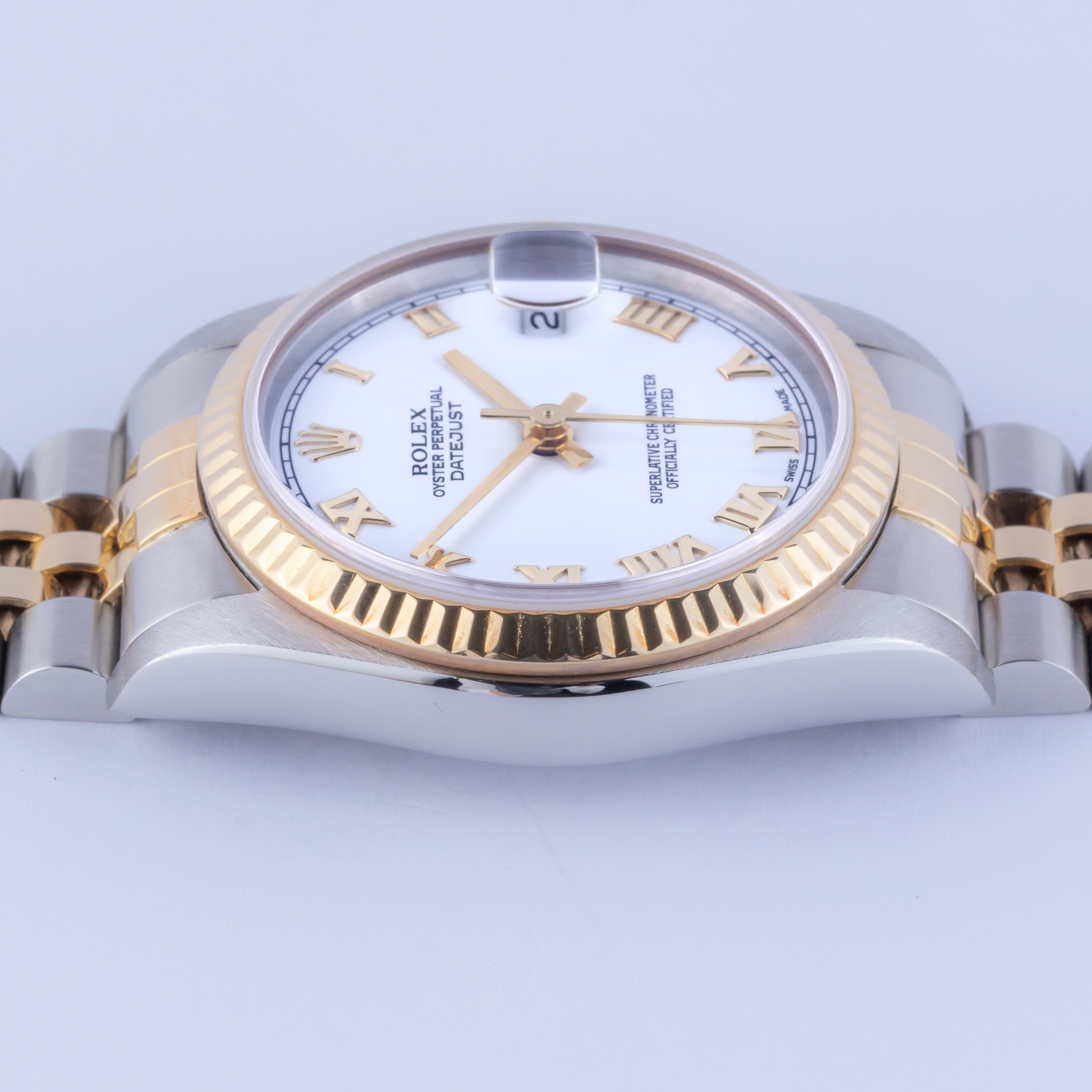Rolex Oyster Perpetual Datejust Mid-Size reference 68273 from 1996 including full set. The Datejust 68273 measures a 31mm gold/stainless steel case, a gold/stainless steel Jubilee bracelet and a fluted 18k gold bezel. This Datejust 68273 features an automatic movement caliber 3135 with quickset date function, a scratch resistance sapphire crystal and a white dial with tritium hands and Roman markers.