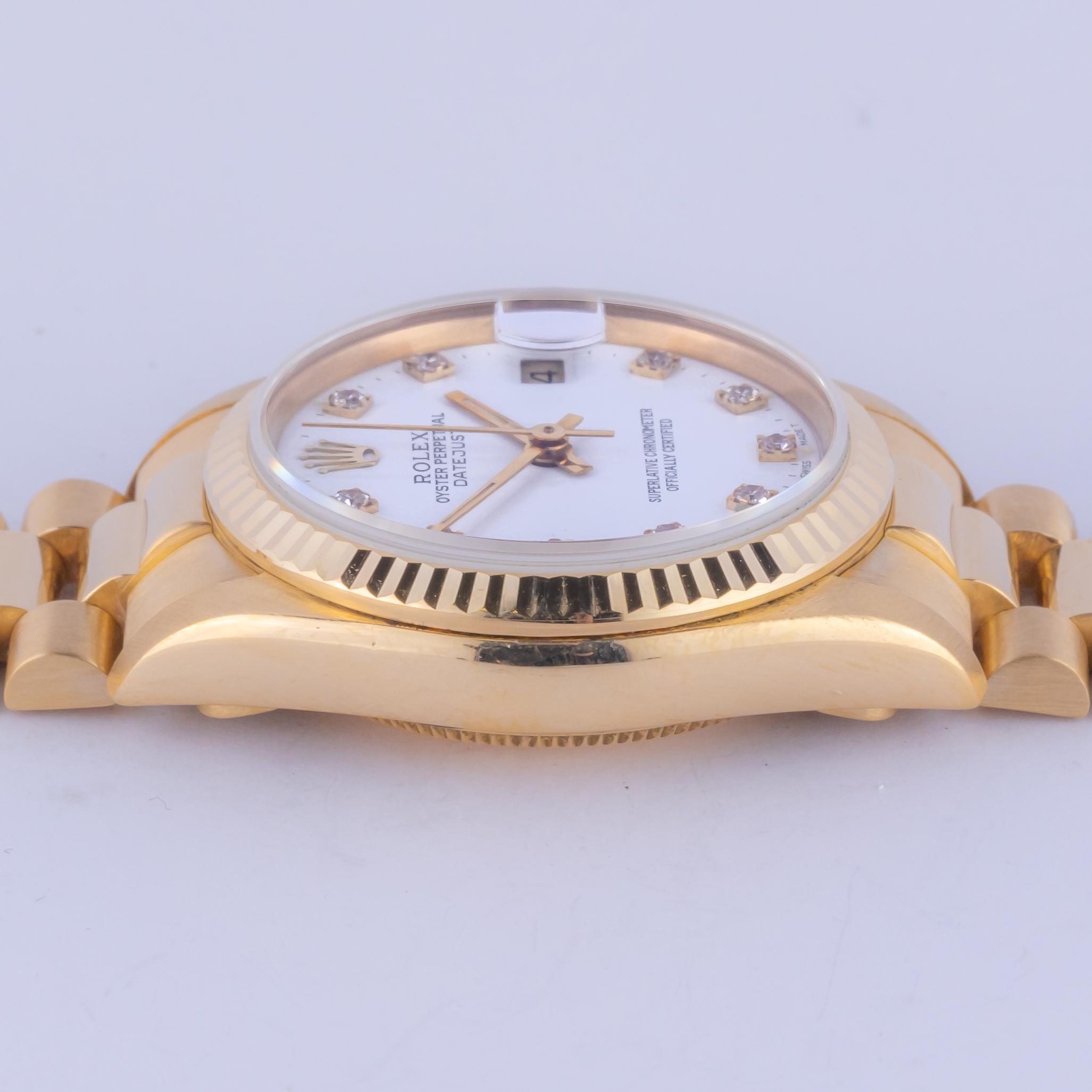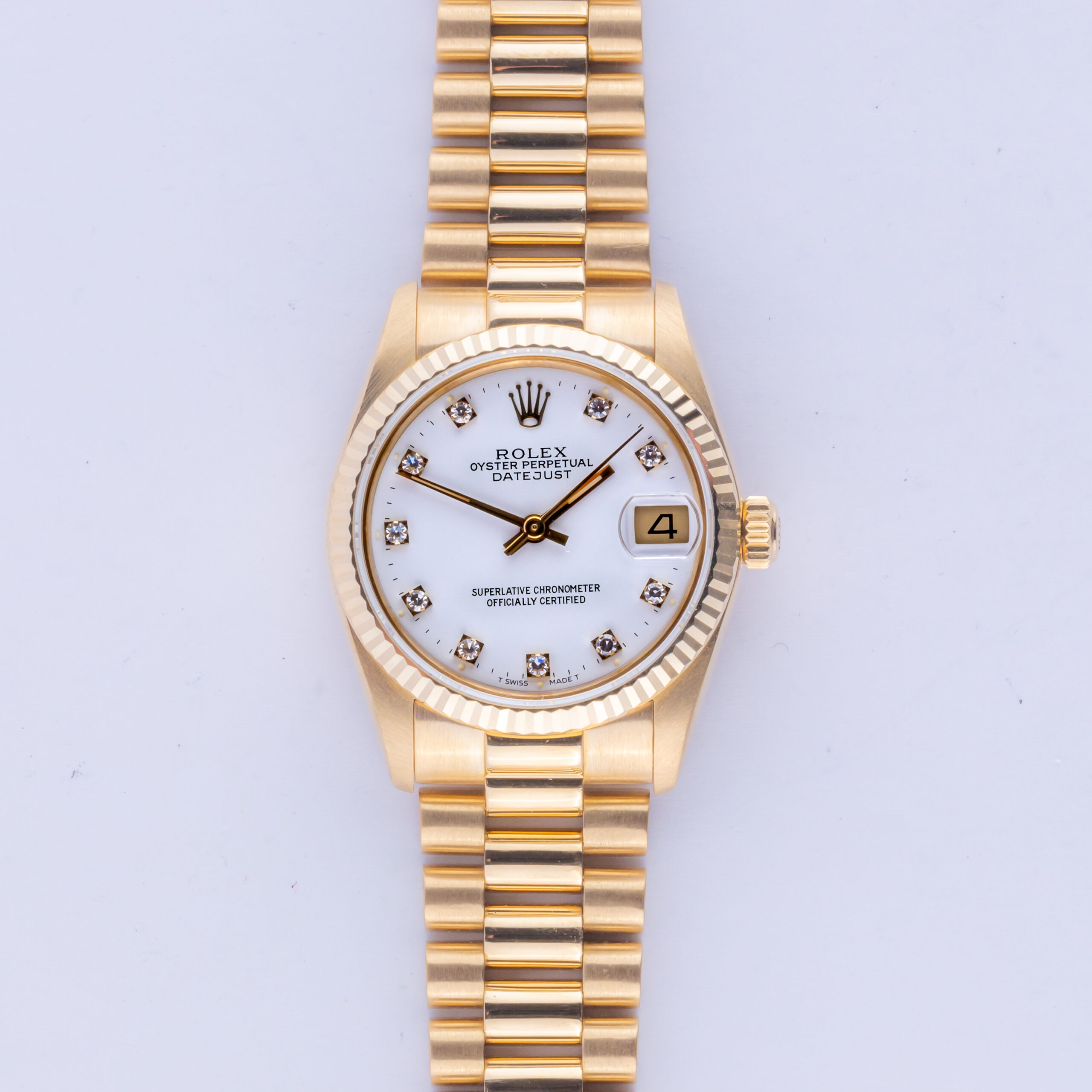 Rolex Oyster Perpetual Lady-Datejust reference 68278 from 1989 including full set. The Lady-Datejust 68278 measures a 31mm gold case, gold President bracelet, and fluted 18k gold bezel. The Lady-Datejust 68278 features an automatic movement caliber 2135 with quickset date function, sapphire crystal and a White dial with diamond markers.