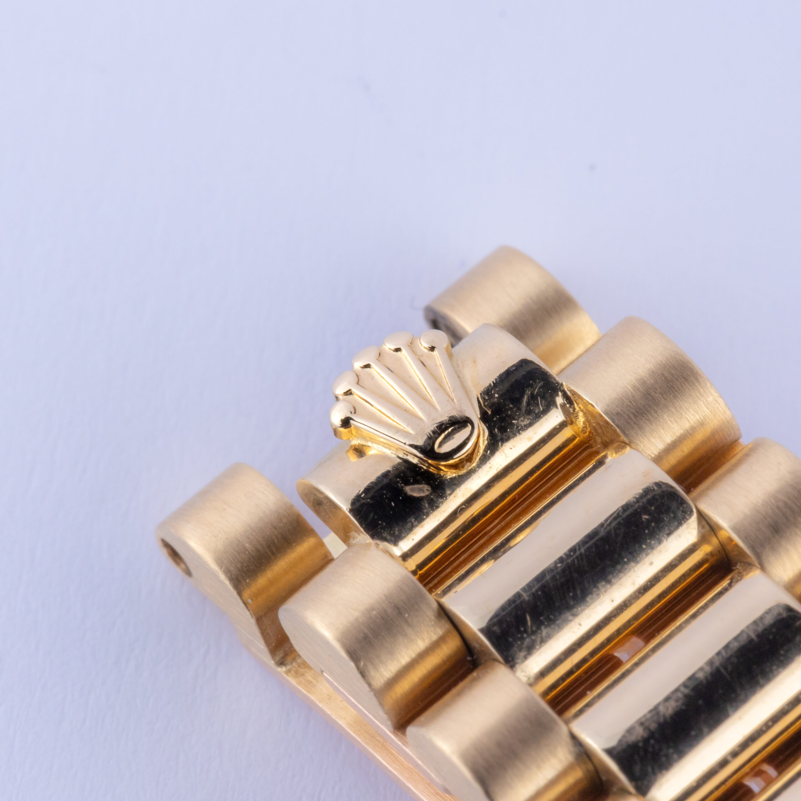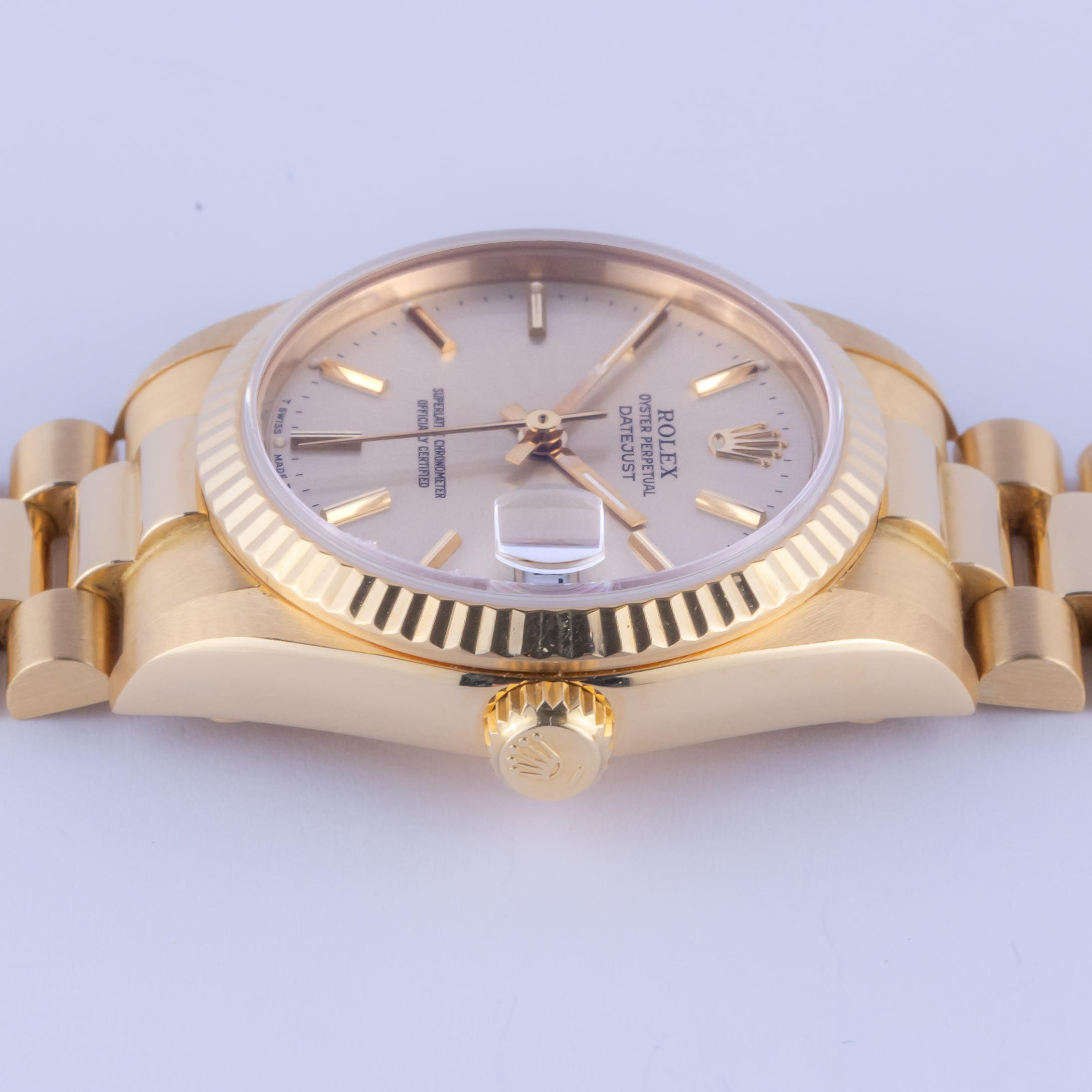 Rolex Oyster Perpetual Lady-Datejust reference 68278 from 1988 including full set. The Lady-Datejust 68278 measures a 31mm gold case, gold President bracelet, and fluted 18k gold bezel. The Lady-Datejust 68278 features an automatic movement caliber 2135 with quickset date function, sapphire crystal and a champagne stick dial.