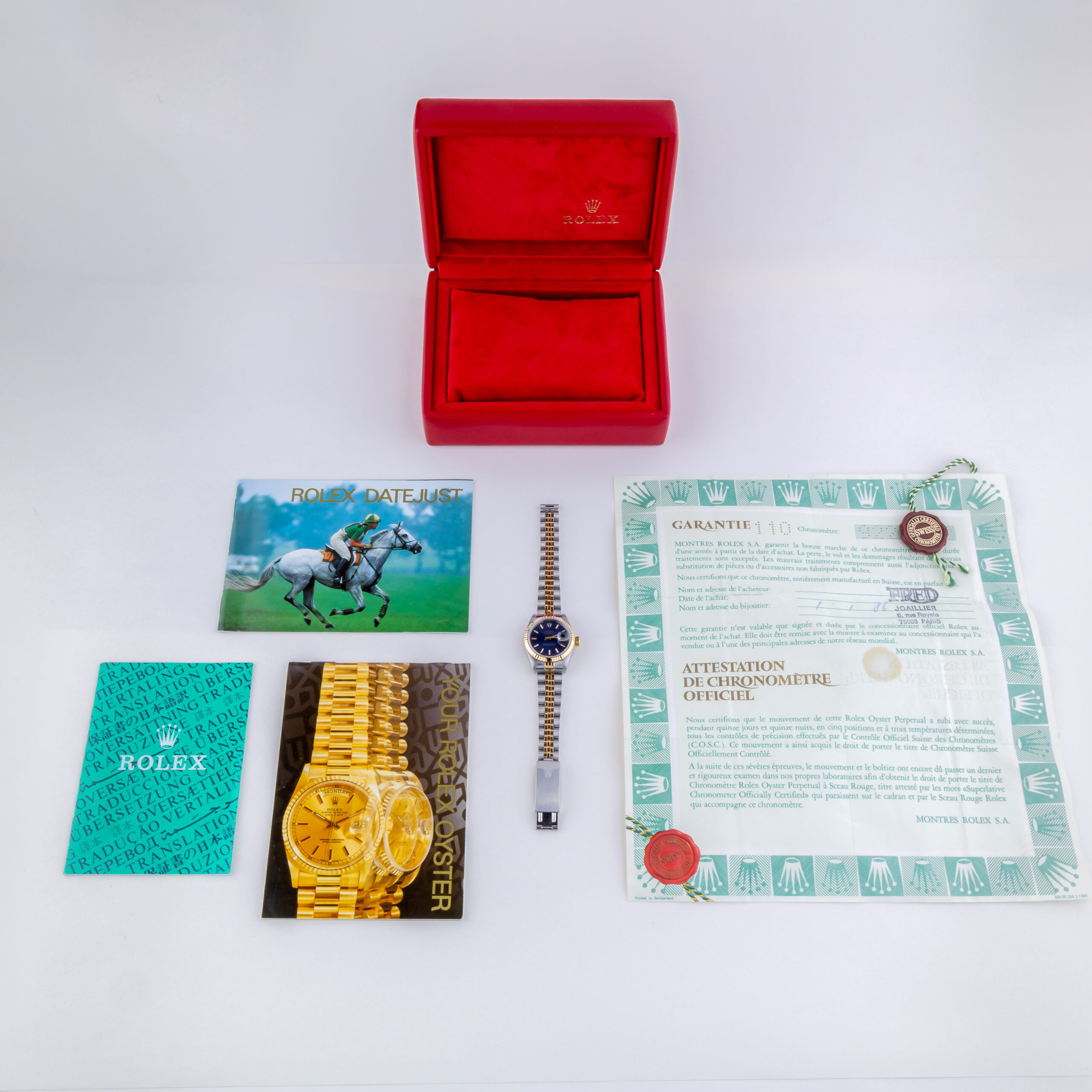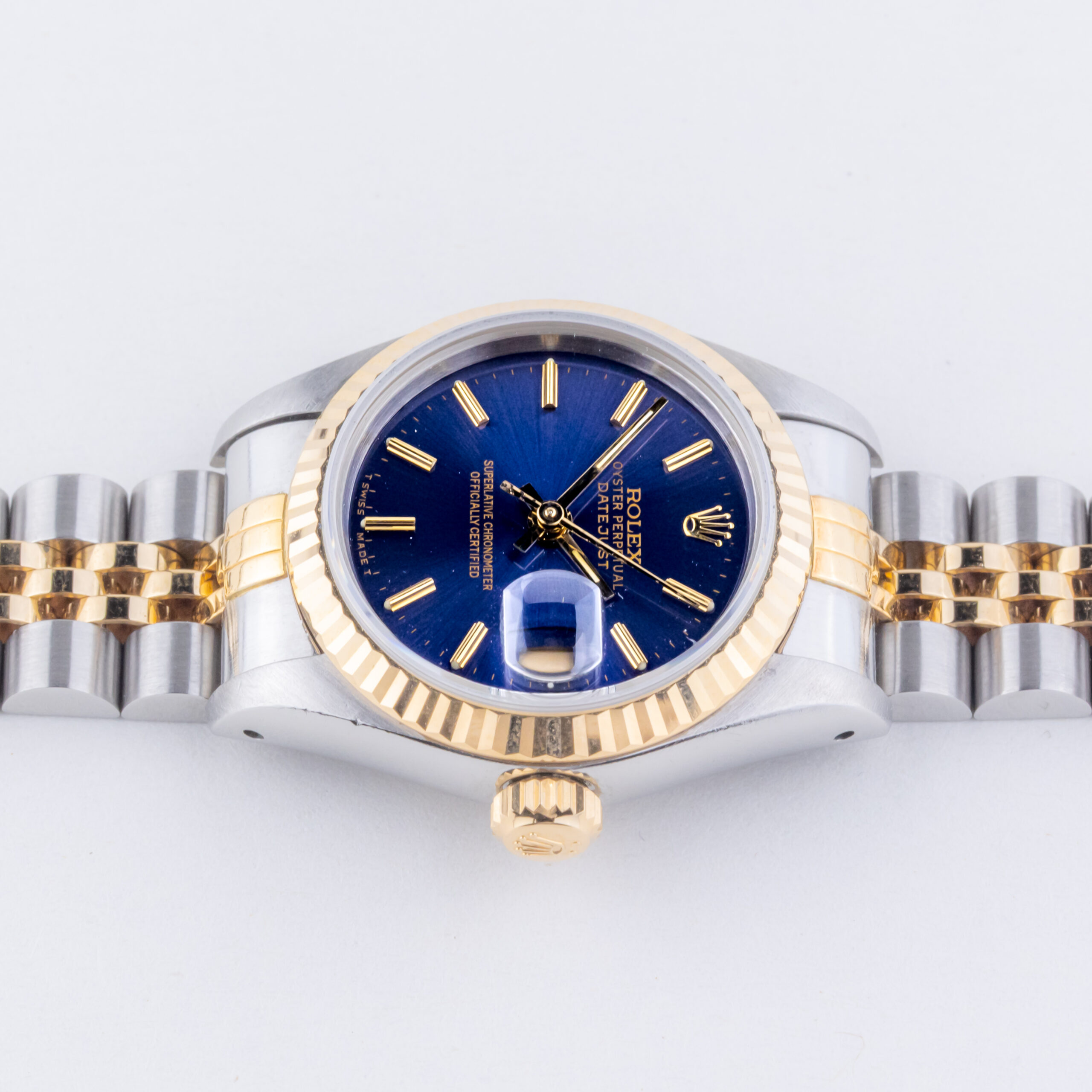 Rolex Oyster Perpetual Lady-Datejust reference 69173 from 1986 including full set. The Lady-Datejust 69173 measures a 26mm gold and stainless steel case, two-tone jubilee bracelet and fluted 14k gold bezel. This Lady-Datejust 69173 features an automatic movement caliber 2135 with quickset date function, a scratch resistance sapphire crystal and a blue dial w/ tritium hands.
