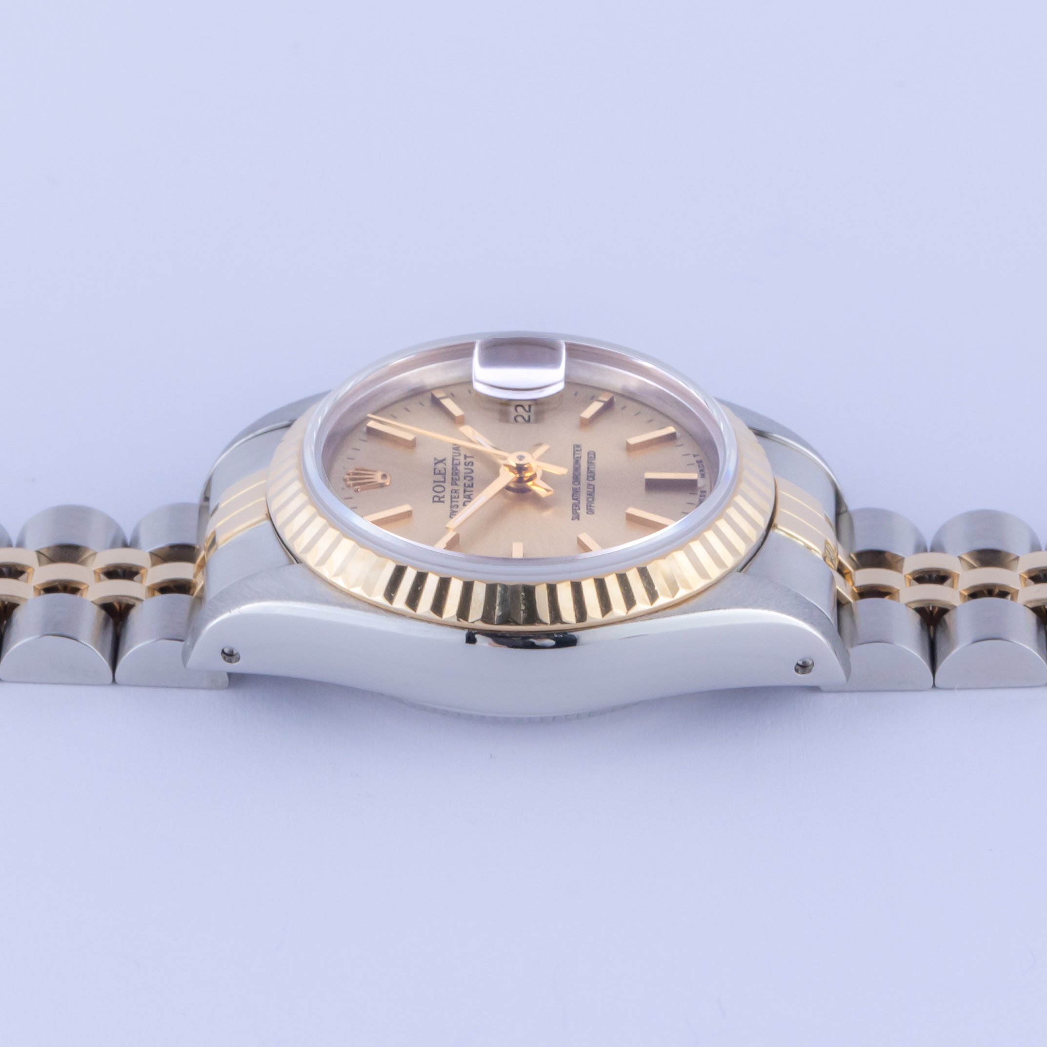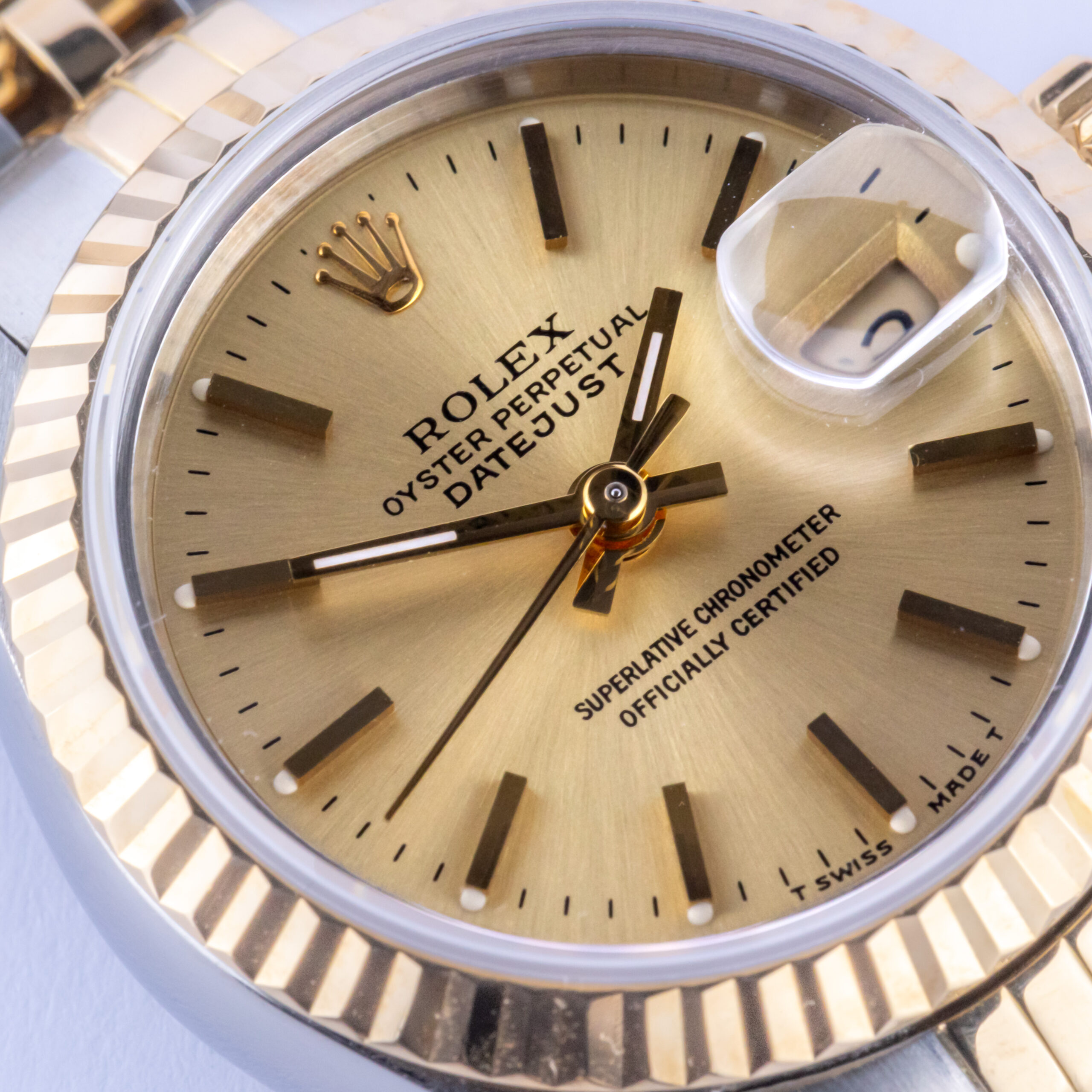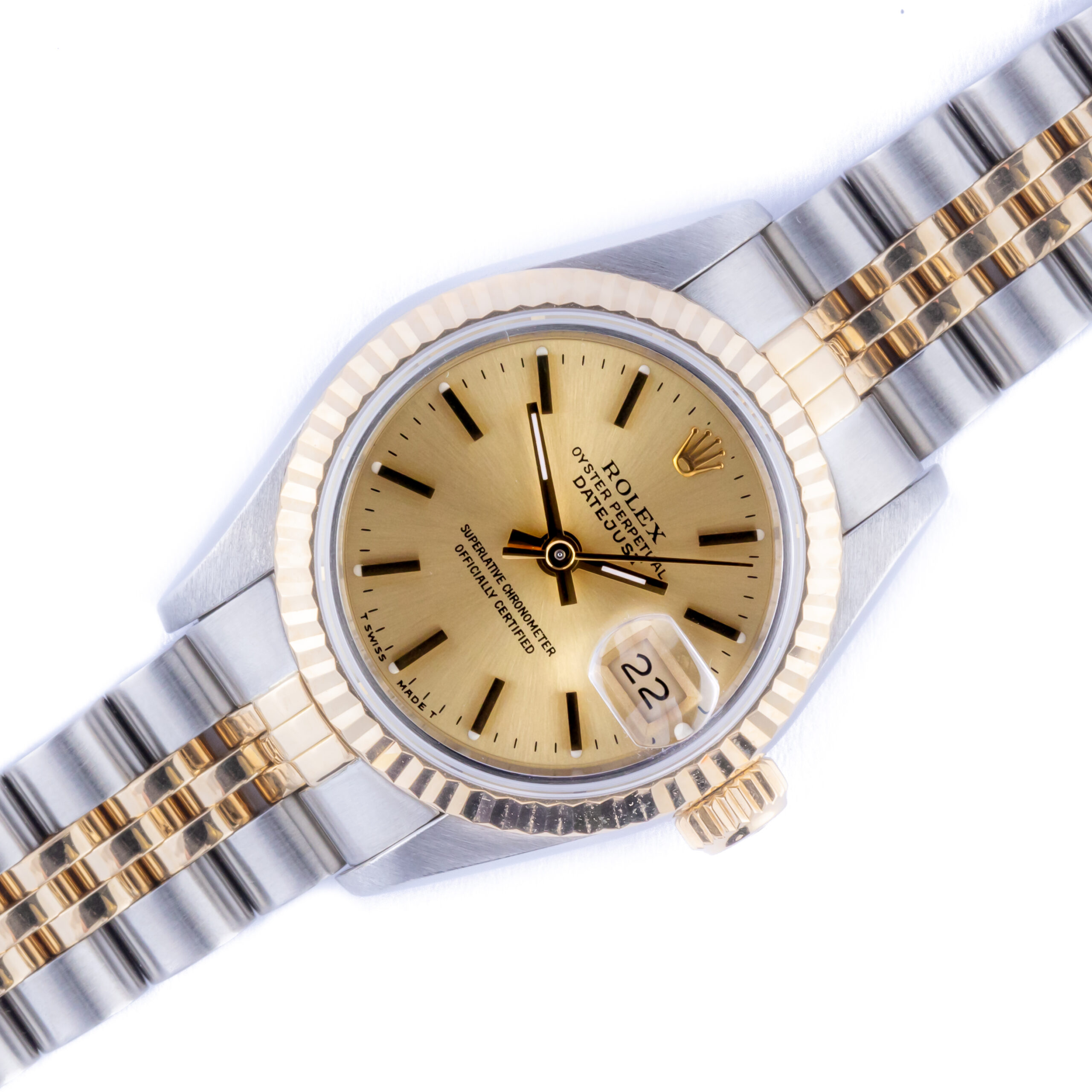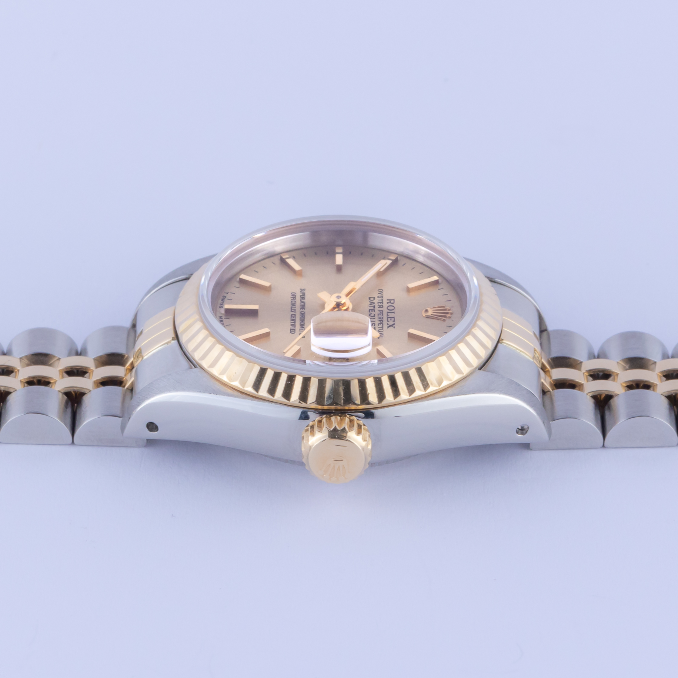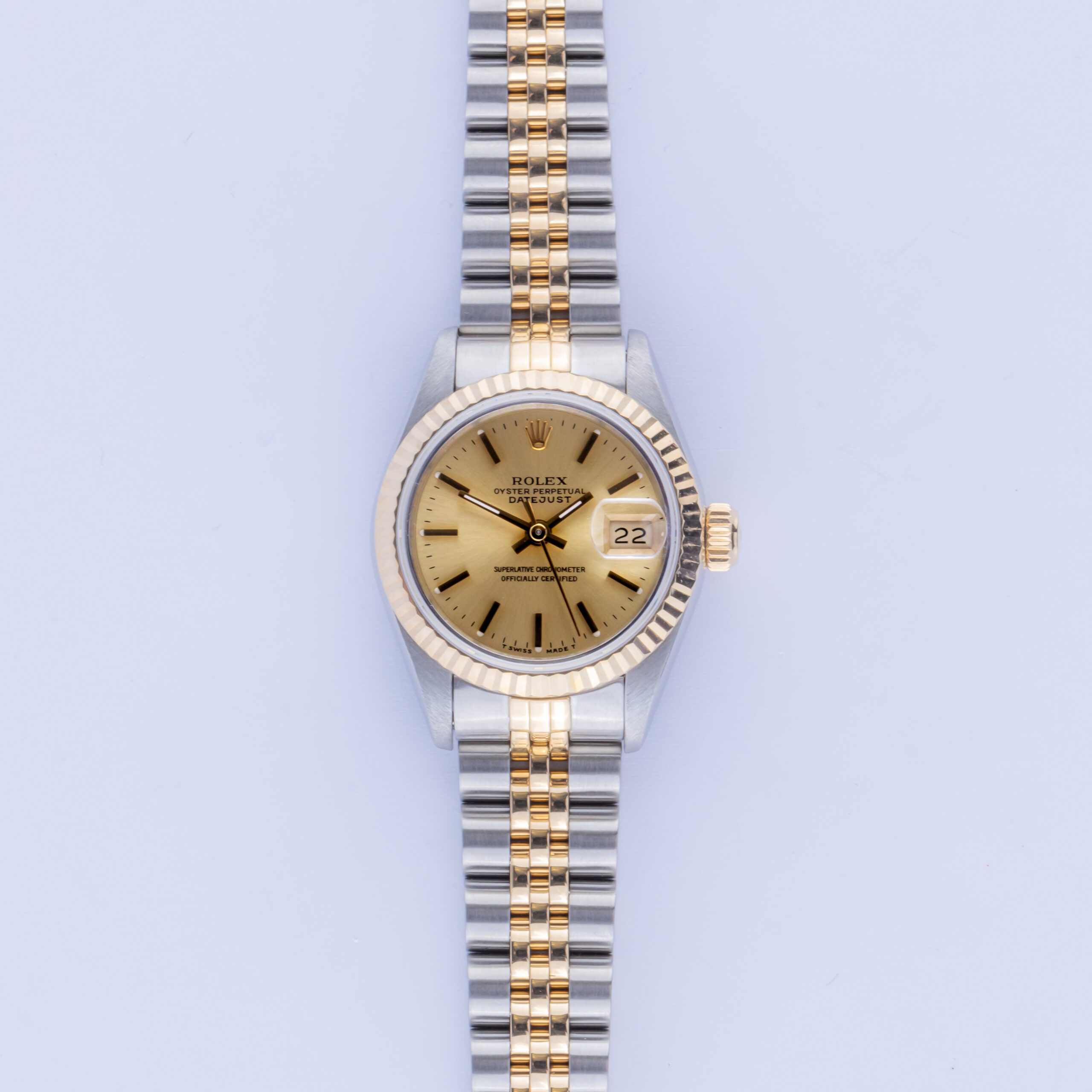Rolex Oyster Perpetual Lady-Datejust reference 69173 from 1990 including full set. The Lady-Datejust 69173 measures a 26mm gold and stainless steel case, two-tone jubilee bracelet and fluted 14k gold bezel. This Lady-Datejust 69173 features an automatic movement caliber 2135 with quickset date function, a scratch resistance sapphire crystal and a champagne dial w/ tritium hands.