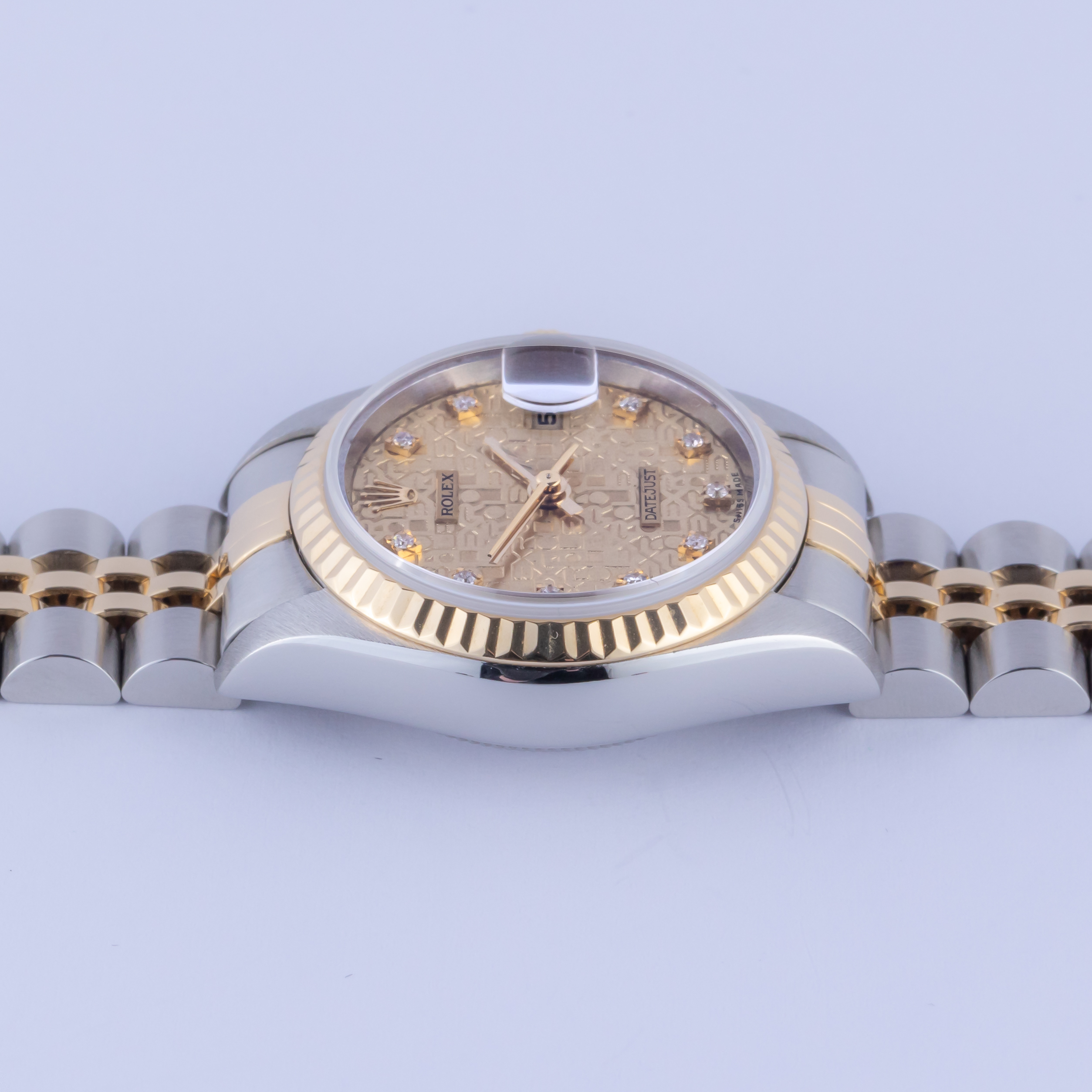 This masterful styling is fully evident in the Rolex Datejust-Lady 69173 making it a trusted choice in a wristwatch for women across the globe who are looking to make a bold statement through their choice of a wearable timepiece. This ladies’ model of the Rolex Datejust collection was produced to the same carefully developed standards as the men’s line, but in a more delicate 26mm case that complemented a woman’s smaller wrist size. Its styling allows for versatility in wear, as it is suitable for both casual and formal occasions. It truly is the perfect Rolex to add to your jewelry box.
