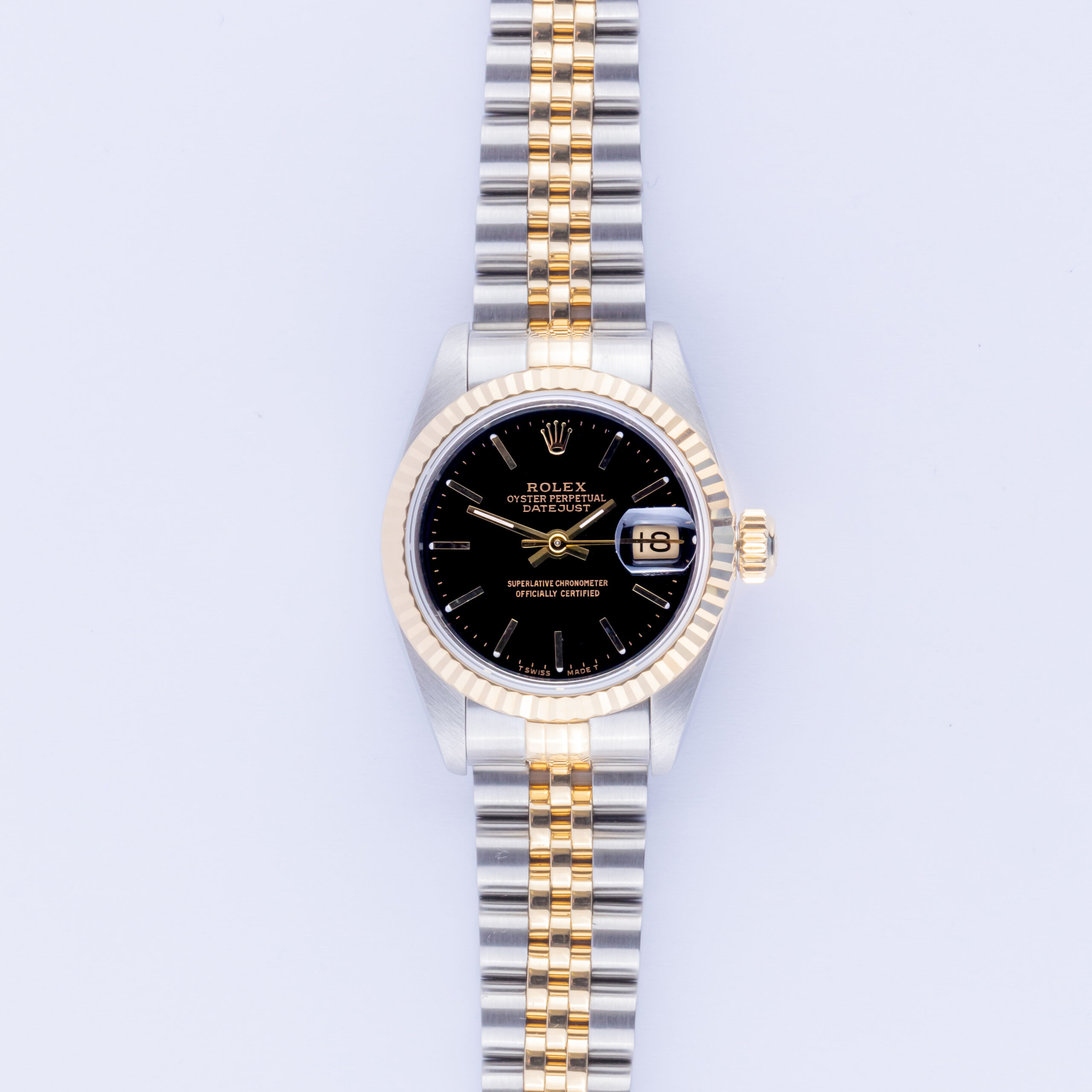 Rolex Oyster Perpetual Lady-Datejust reference 69173 from 1990 including full set. The Lady-Datejust 69173 measures a 26mm gold and stainless steel case, two-tone jubilee bracelet and fluted 14k gold bezel. This Lady-Datejust 69173 features an automatic movement caliber 2135 with quickset date function, a scratch resistance sapphire crystal and a black dial w/ tritium hands.