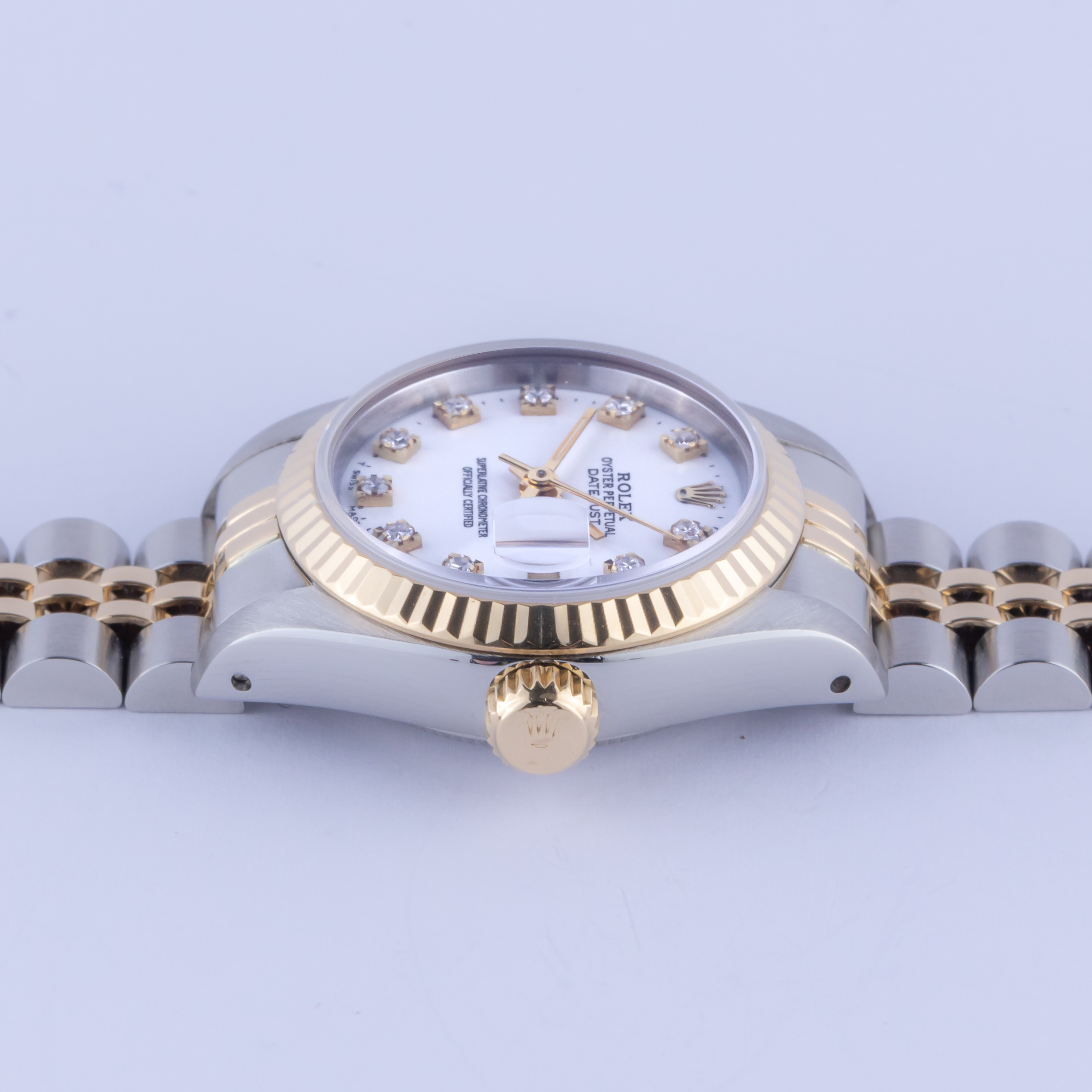 This masterful styling is fully evident in the Rolex Datejust-Lady 69173 making it a trusted choice in a wristwatch for women across the globe who are looking to make a bold statement through their choice of a wearable timepiece. This ladies’ model of the Rolex Datejust collection was produced to the same carefully developed standards as the men’s line, but in a more delicate 26mm case that complemented a woman’s smaller wrist size. Its styling allows for versatility in wear, as it is suitable for both casual and formal occasions. It truly is the perfect Rolex to add to your jewelry box.