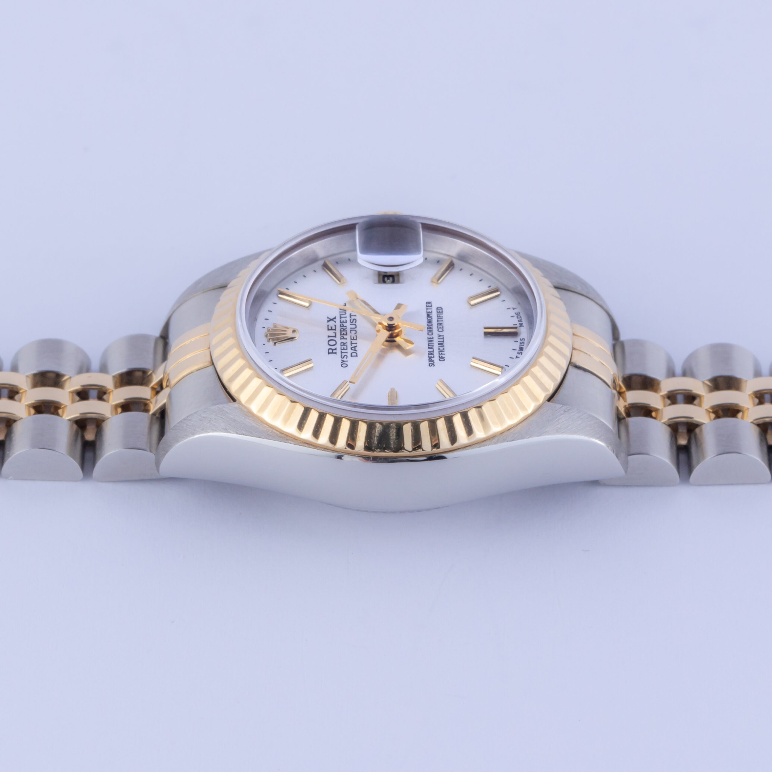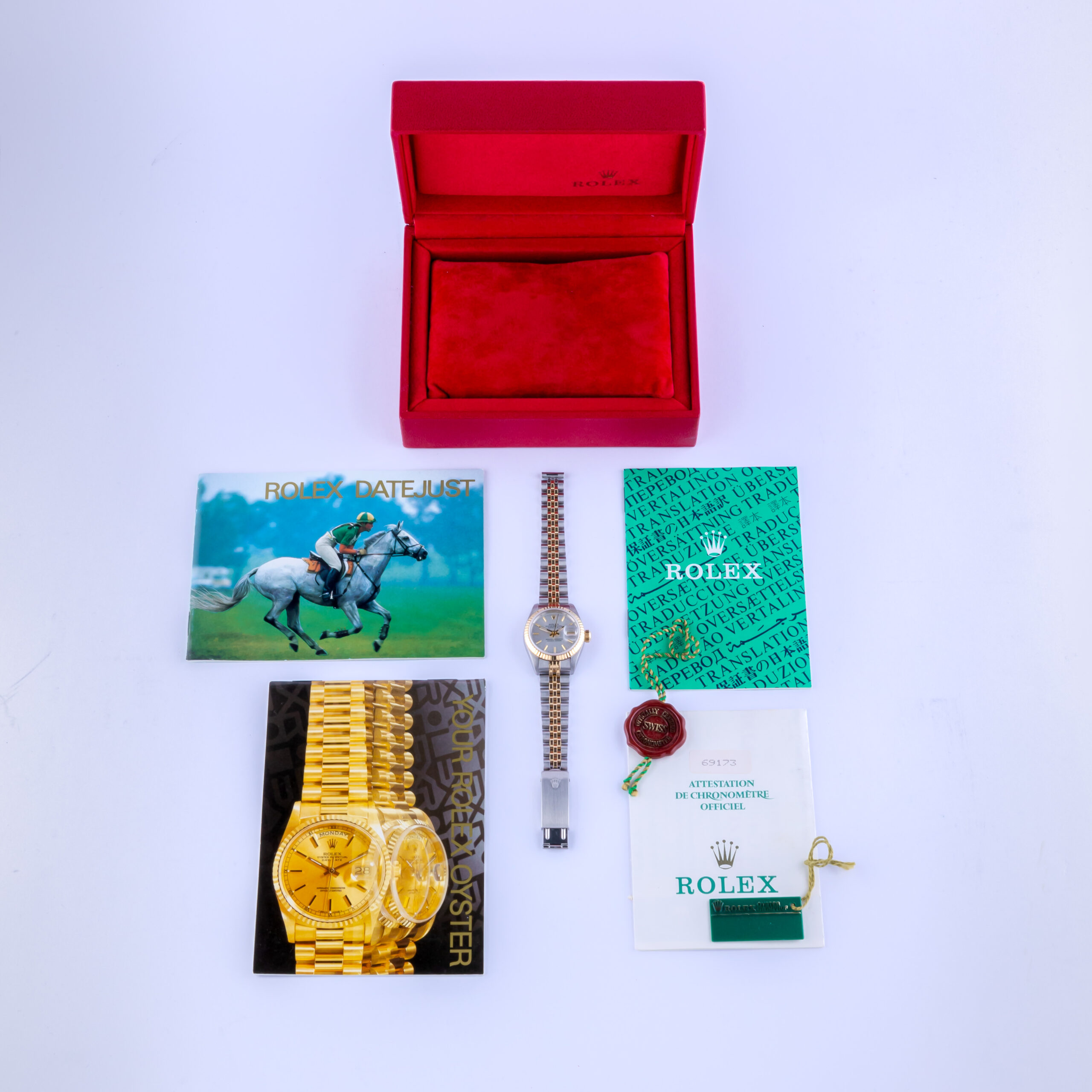 Rolex Oyster Perpetual Lady-Datejust reference 69173 from 1993 including full set. The Lady-Datejust 69173 measures a 26mm gold and stainless steel case, two-tone jubilee bracelet and fluted 14k gold bezel. This Lady-Datejust 69173 features an automatic movement caliber 2135 with quickset date function, a scratch resistance sapphire crystal and a silver dial w/ tritium hands.