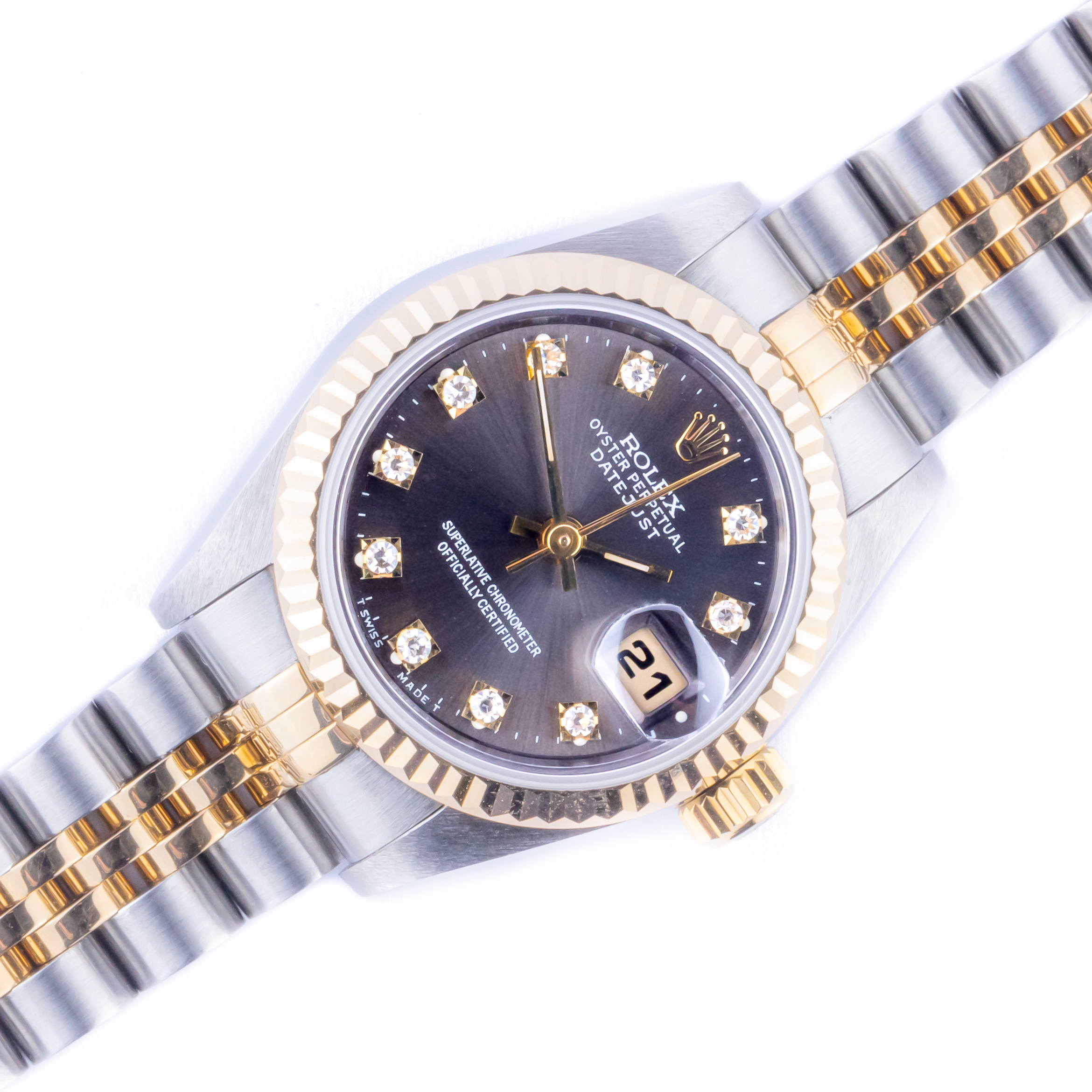 Rolex Oyster Perpetual Lady-Datejust reference 69173 from 1993 including full set. The Lady-Datejust 69173 measures a 26mm gold and stainless steel case, two-tone jubilee bracelet and fluted 14k gold bezel. This Lady-Datejust 69173 features an automatic movement caliber 2135 with quickset date function, a scratch resistance sapphire crystal and a grey dial w/ tritium hands and diamond index.