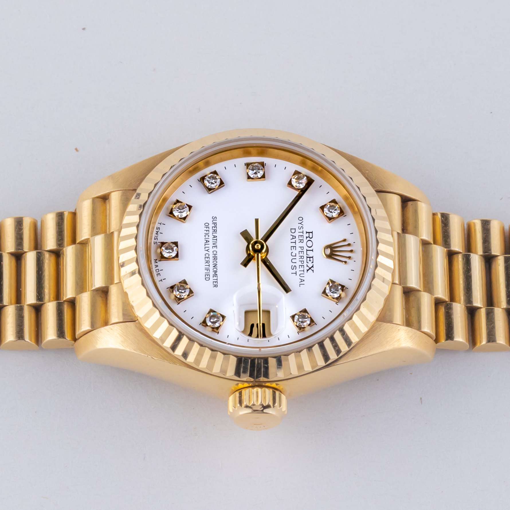 Rolex Oyster Perpetual Lady-Datejust reference 69178 from 1993 including full set. The Lady-Datejust 69178 measures a 26mm gold case, gold jubilee bracelet and fluted 18k yellow gold bezel. This Lady-Datejust 69178 features an automatic movement caliber 2135 with quickset date function, sapphire crystal and a white dial with diamond markers.
