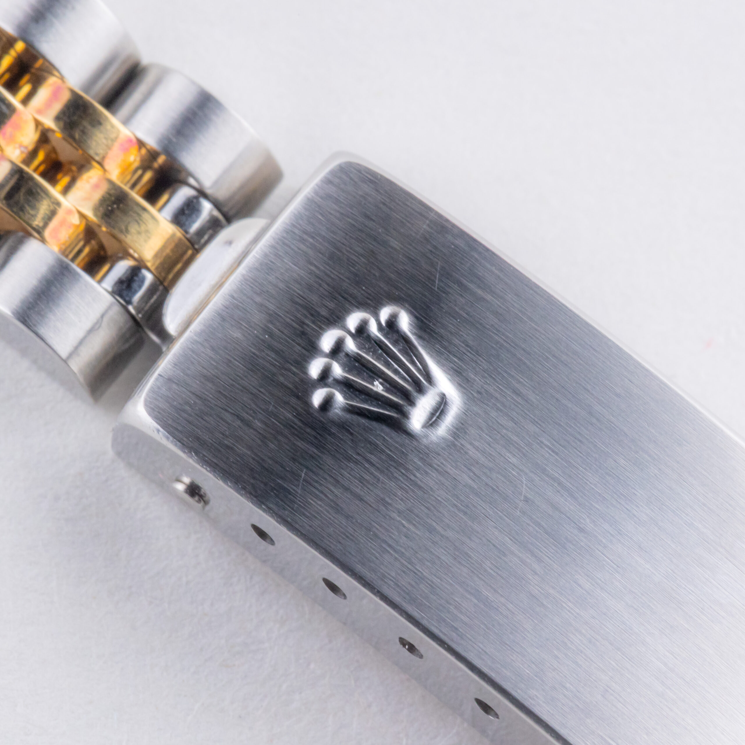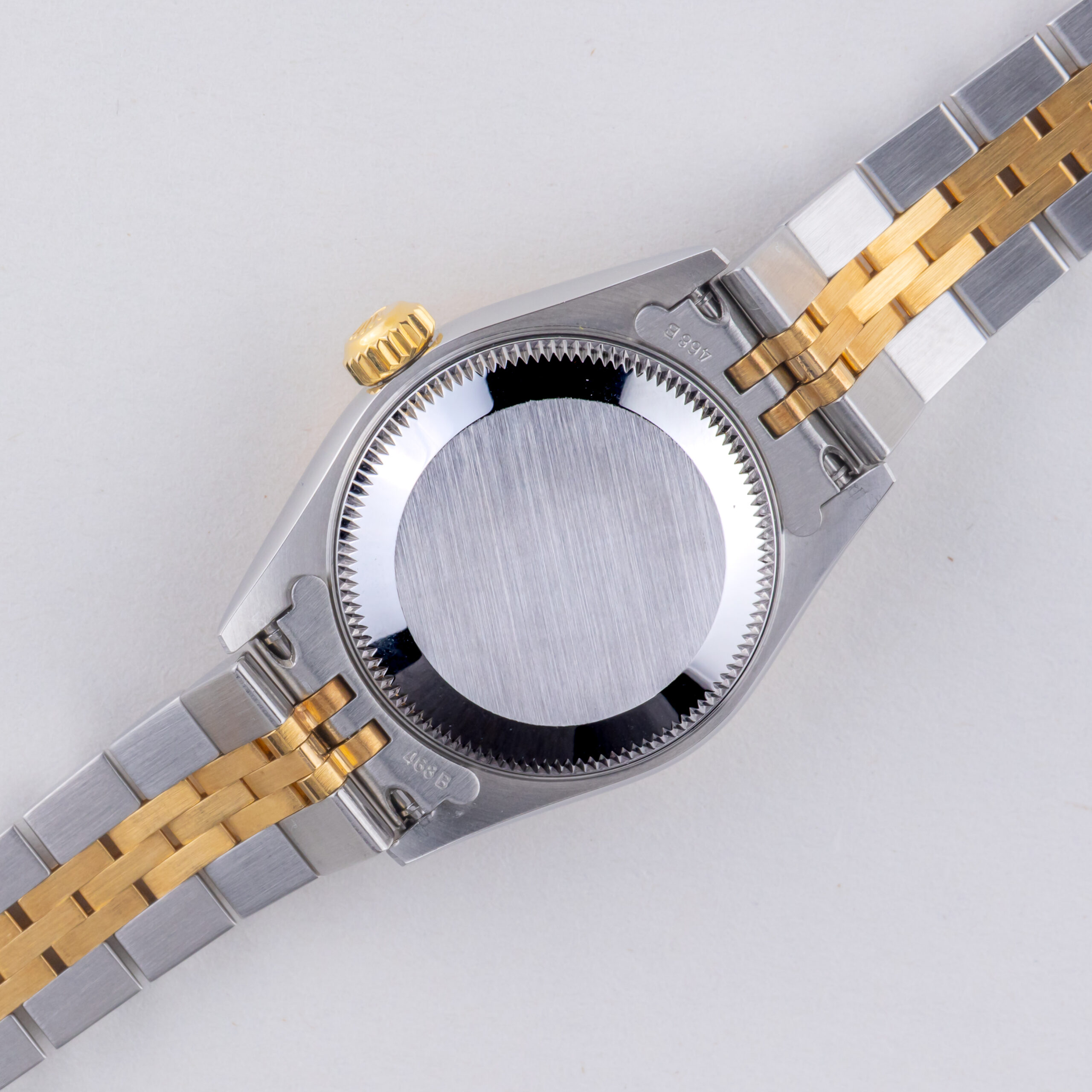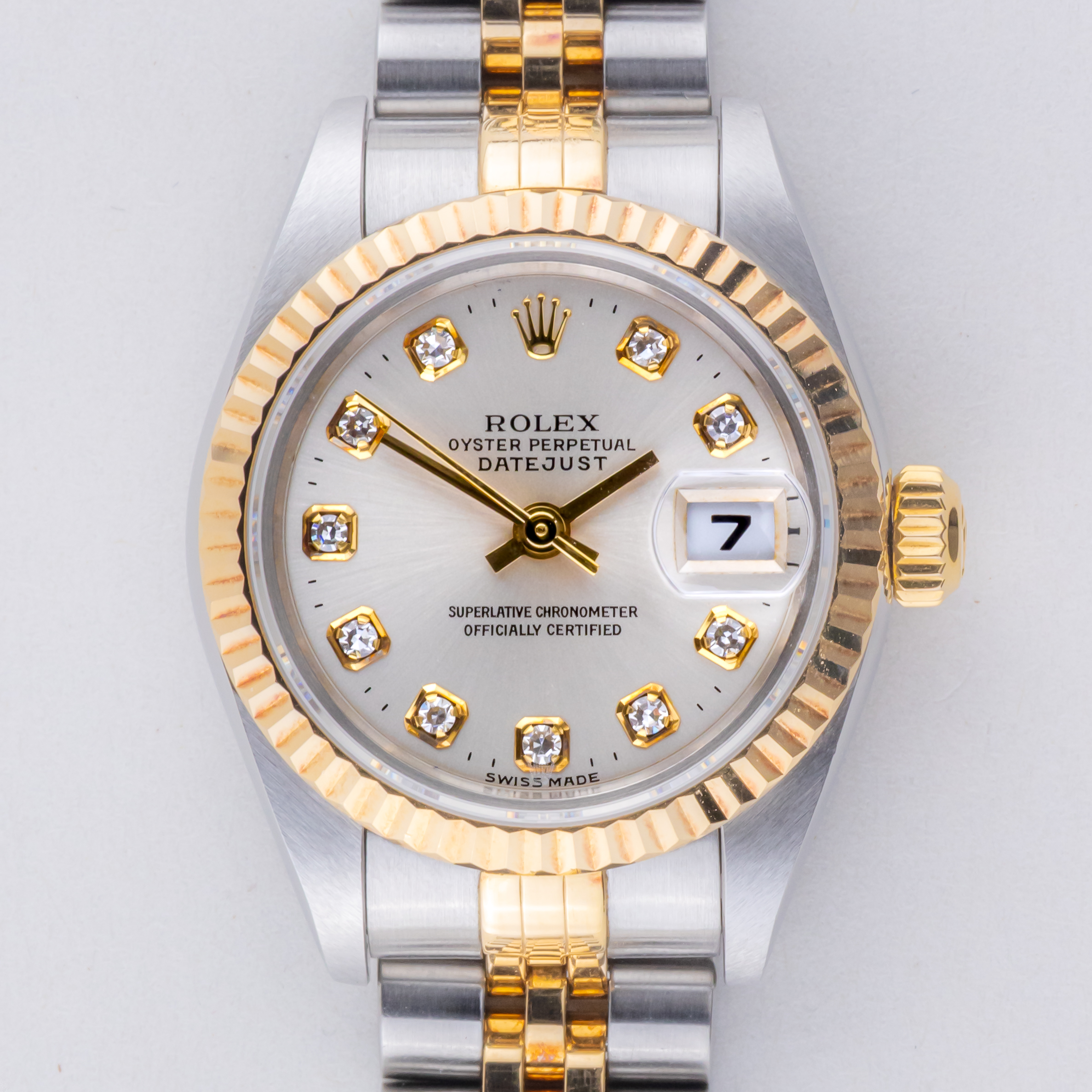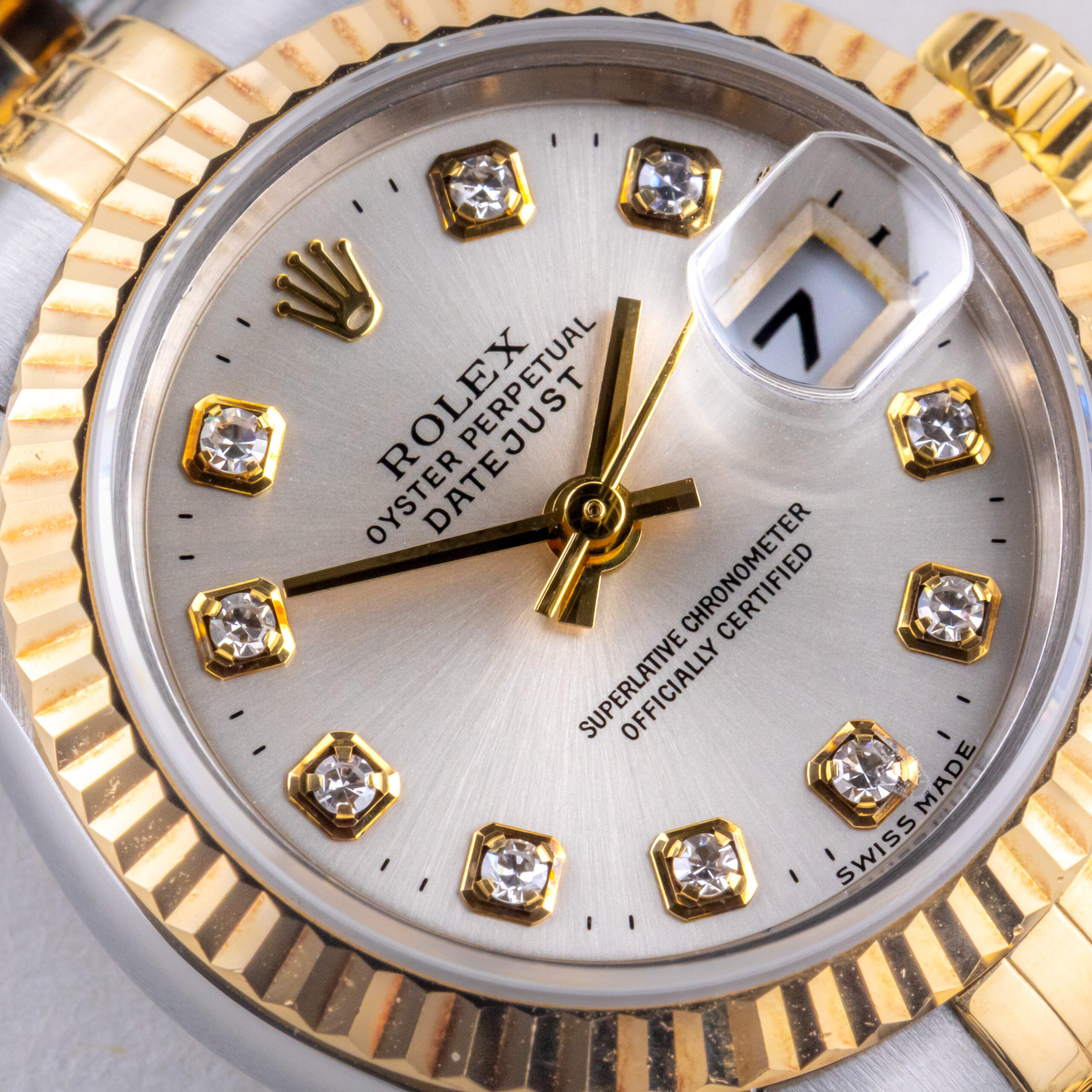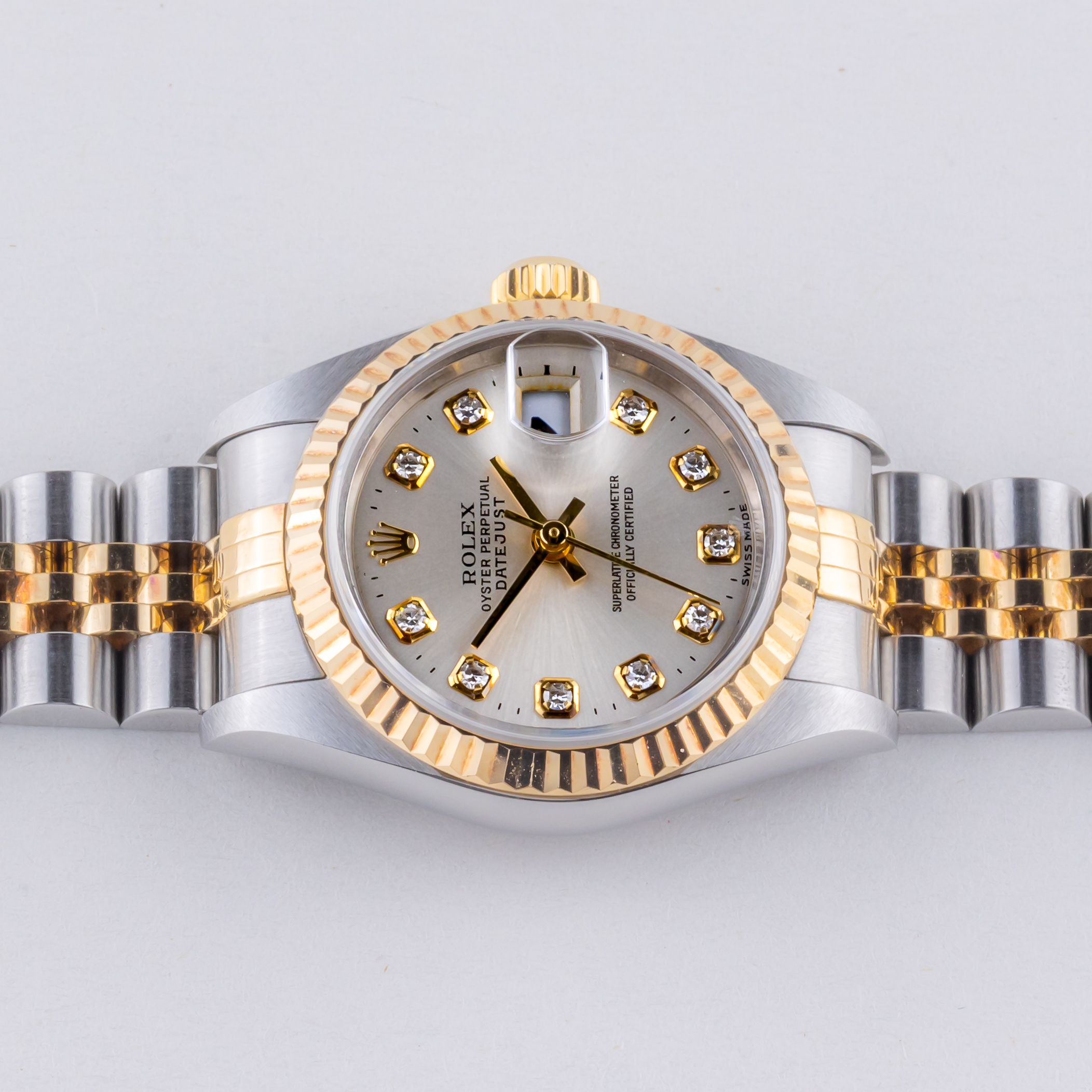 Rolex Oyster Perpetual Lady-Datejust reference 79173 from 2002. The Lady-Datejust 79173 measures a 26mm gold and stainless steel case, a two-tone jubilee bracelet and a fluted 18k gold bezel. This Lady-Datejust 79173 features an automatic movement caliber 2235 with quickset date function, a scratch resistance sapphire crystal and a silver dial with diamond markers.
